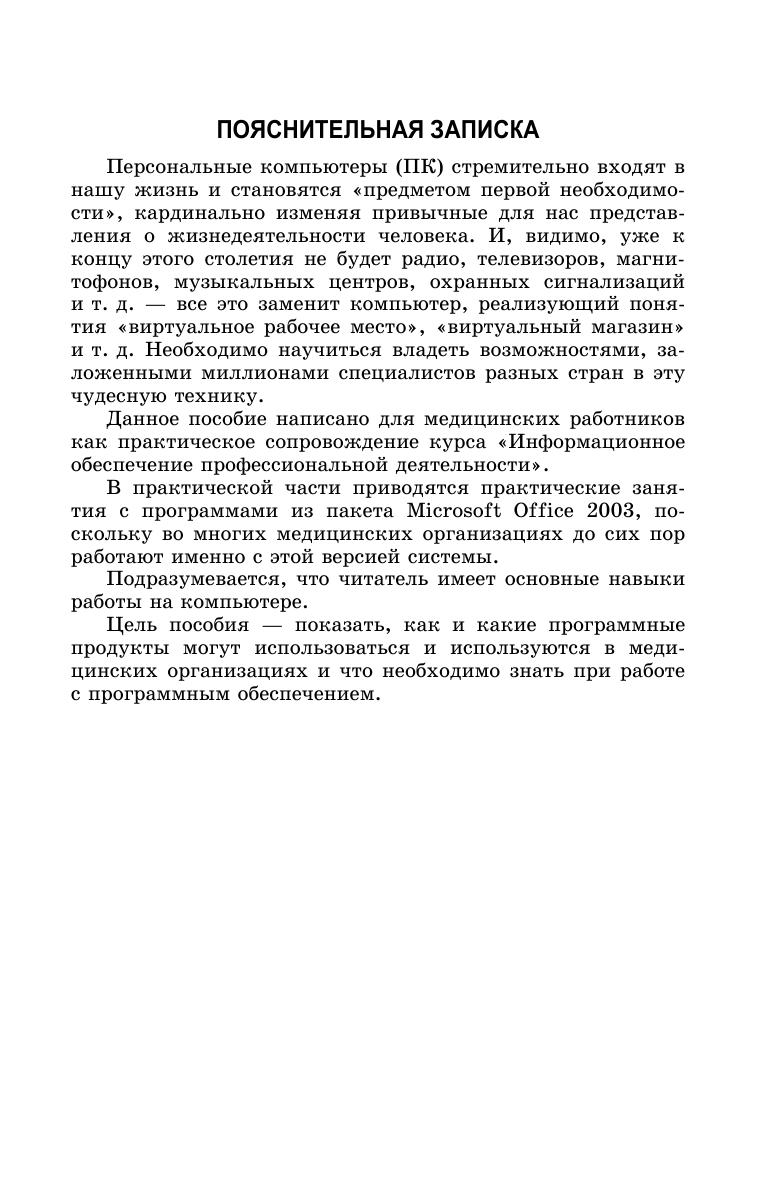 Пособие разработано для медицинских работников как практическое сопровождение курса «Информационное обеспечение профессиональной деятельности». Описаны основные программные продукты, используемые в медицинских организациях, в практической части приведены задания с программами из пакета Microsoft Office. Соответствует современным требованиям Федерального государственного образовательного стандарта среднего профессионального образования и профессиональным квалификационным требованиям. Предназначено для студентов среднего профессионального образования, обучающихся по специальностям: «Лечебное дело», «Сестринское дело», «Акушерское дело», «Лабораторное дело», «Сестринское дело в педиатрии», а также для слушателей отделения последипломной подготовки.