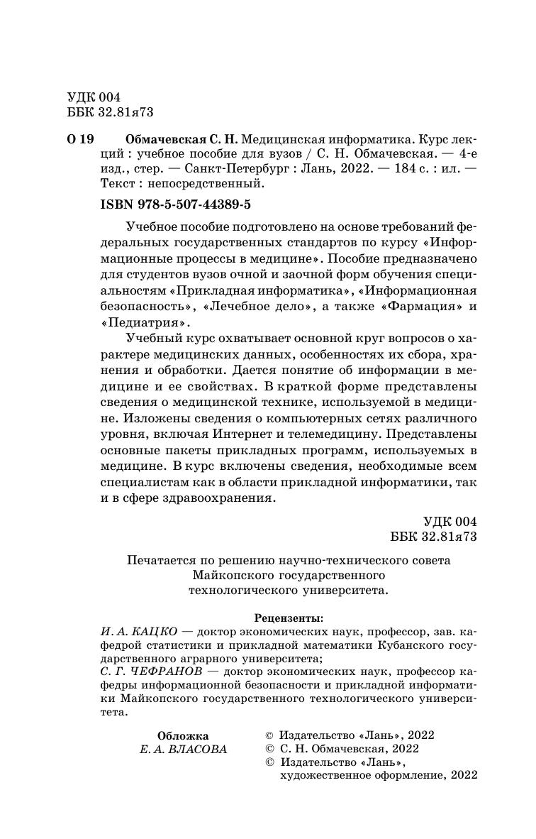 Учебное пособие подготовлено на основе требований федеральных государственных стандартов по курсу «Информационные процессы в медицине». Пособие предназначено для студентов очной и заочной форм обучения специальности «Прикладная информатика», «Информационная безопасность», «Лечебное дело», а также «Фармация» и «Педиатрия». Учебный курс охватывает основной круг вопросов о характере медицинских данных, особенностях их сбора, хранения и обработки. Дается понятие об информации в медицине и ее свойствах. В краткой форме представлены сведения о медицинской технике, используемой в медицине. Изложены сведения о компьютерных сетях различного уровня, включая Интернет и телемедицину. Представлены основные пакеты прикладных программ, используемых в медицине. В курс включены сведения, необходимые всем специалистам как в области прикладной информатики, так и в сфере здравоохранения.