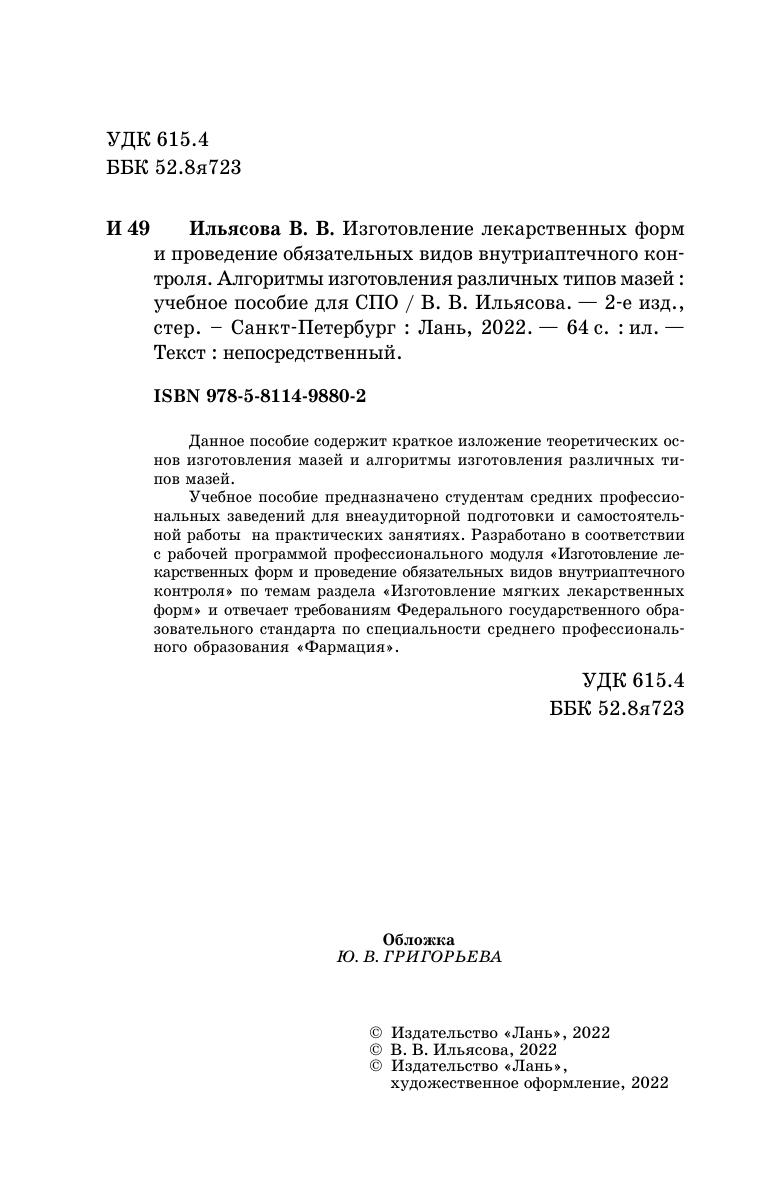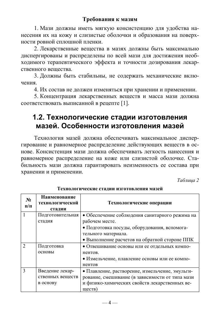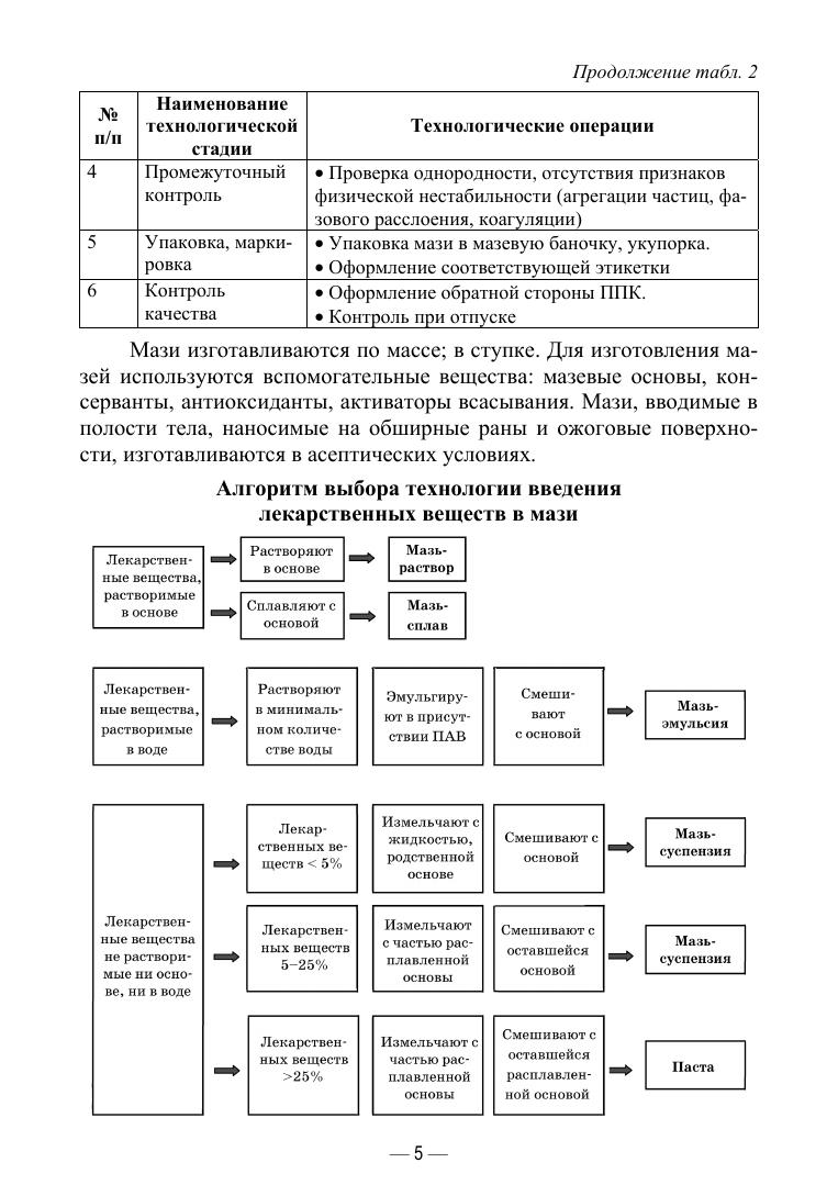 Данное пособие содержит краткое изложение теоретических основ изготовления мазей и алгоритмы изготовления различных типов мазей. Учебное пособие предназначено для внеаудиторной подготовки и самостоятельной работы студентов на практических занятиях. Разработано в соответствии с рабочей программой Профессионального модуля «Изготовление лекарственных форм и проведение обязательных видов внутриаптечного контроля» по темам раздела «Изготовление мягких лекарственных форм» и отвечает требованиям Федерального Государственного образовательного стандарта по специальности среднего профессионального образования «Фармация».