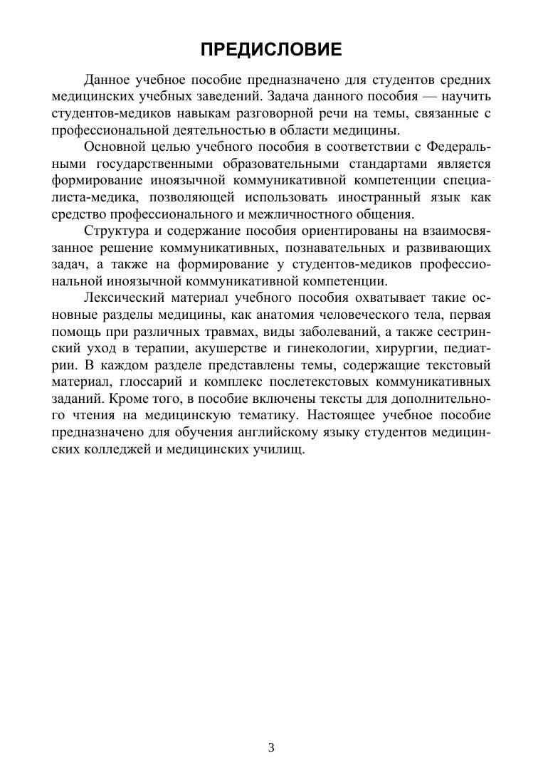 Цель данного пособия — развитие коммуникативных компетенций студентов-медиков на основе медицинских тем. Соответствует современным требованиям Федерального государственного образовательного стандарта среднего профессионального образования и профессиональным квалификационным требованиям. Учебное пособие предназначено для студентов средних медицинских учебных заведений и может быть использовано в качестве основной учебной литературы на занятиях по английскому языку в профессиональной сфере.
