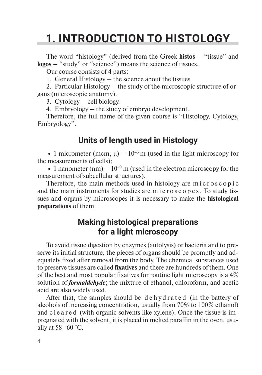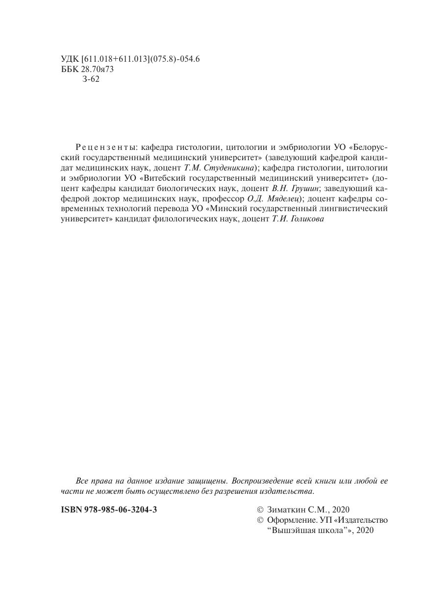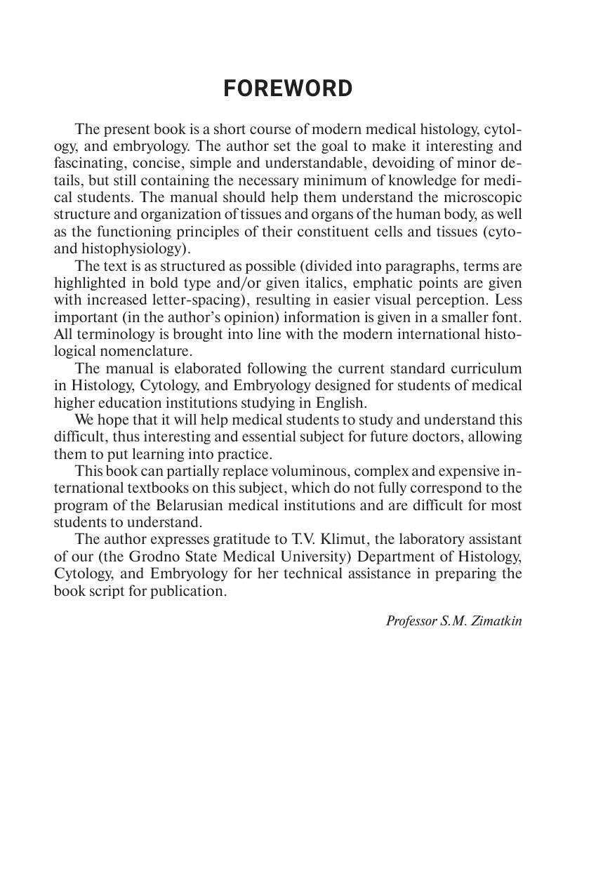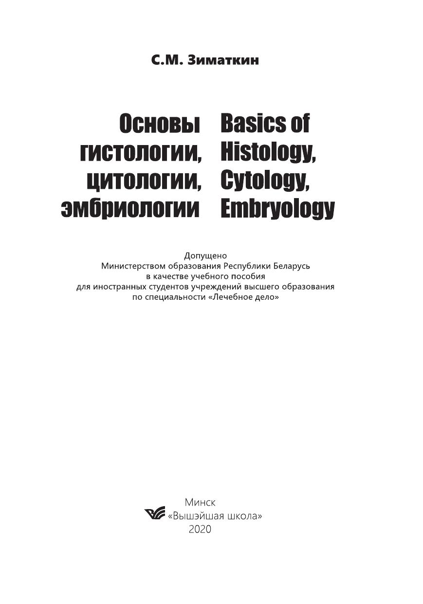 В пособии коротко и доступно изложены основные вопросы цитологии (учение о клетке), общей (учение о тканях) и частной гистологии (микроскопическая организация органов) и эмбриологии (развитие зародыша и плода) человека. Для студентов учреждений высшего образования, обучающихся на английском языке. The basic issues of cytology (cell biology), general (structure of tissues) and particular histology (microscopic organization of organs), and embryology (embryo development) are shortly and simply described in the present manual. The book is dedicated to students of medical higher education institutions studying in English.