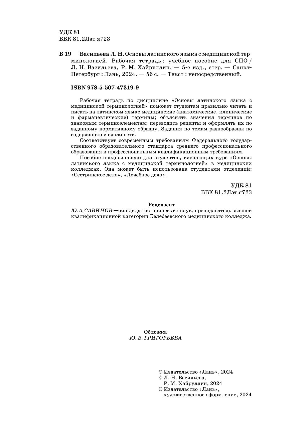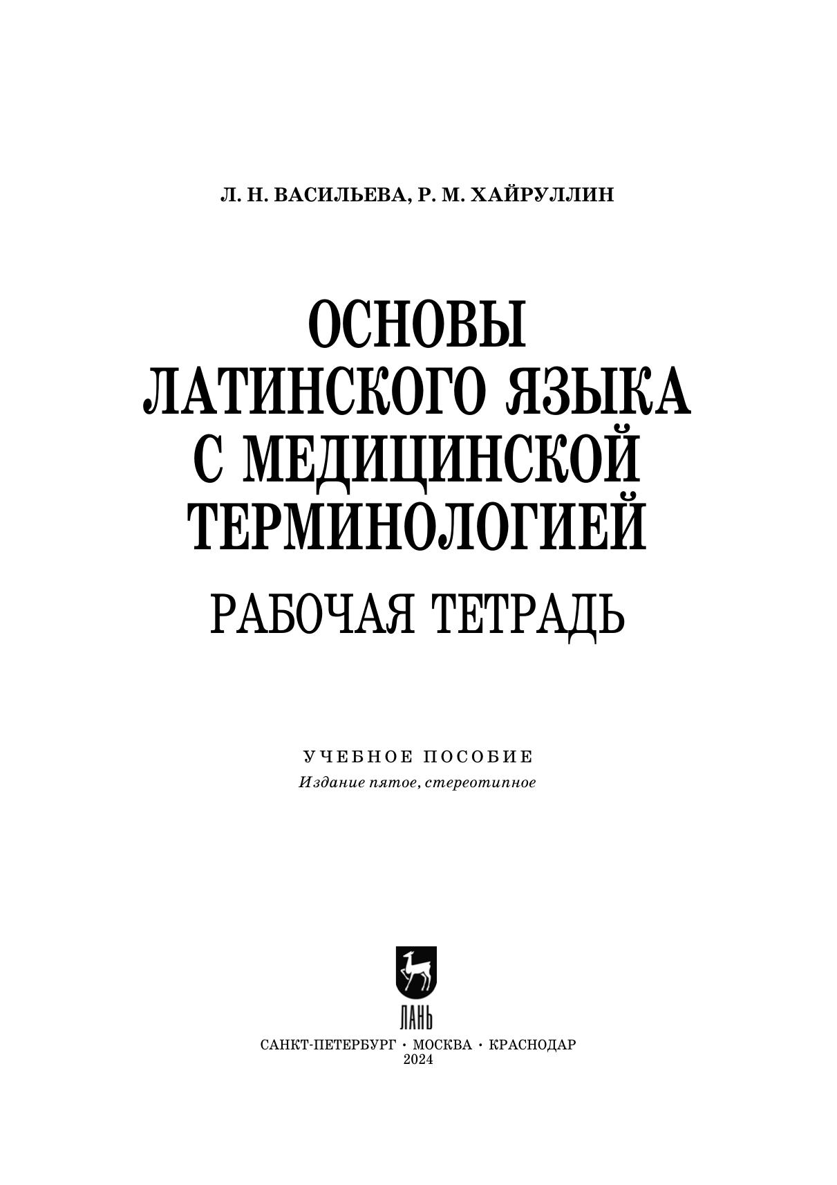 Рабочая тетрадь по дисциплине «Основы латинского языка с медицинской терминологией» поможет студентам правильно читать и писать на латинском языке медицинские (анатомические, клинические и фармацевтические) термины, объяснять значения терминов по знакомым терминоэлементам, переводить рецепты и оформлять их по заданному нормативному образцу. Задания по темам разнообразны по содержанию и сложности. Соответствует современным требованиям Федерального государственного образовательного стандарта среднего профессионального образования и профессиональным квалификационным требованиям. Пособие предназначено для студентов, изучающих курс «Основы латинского языка с медицинской терминологией» в медицинских колледжах. Оно может быть использовано студентами отделений: «Сестринское дело», «Лечебное дело».