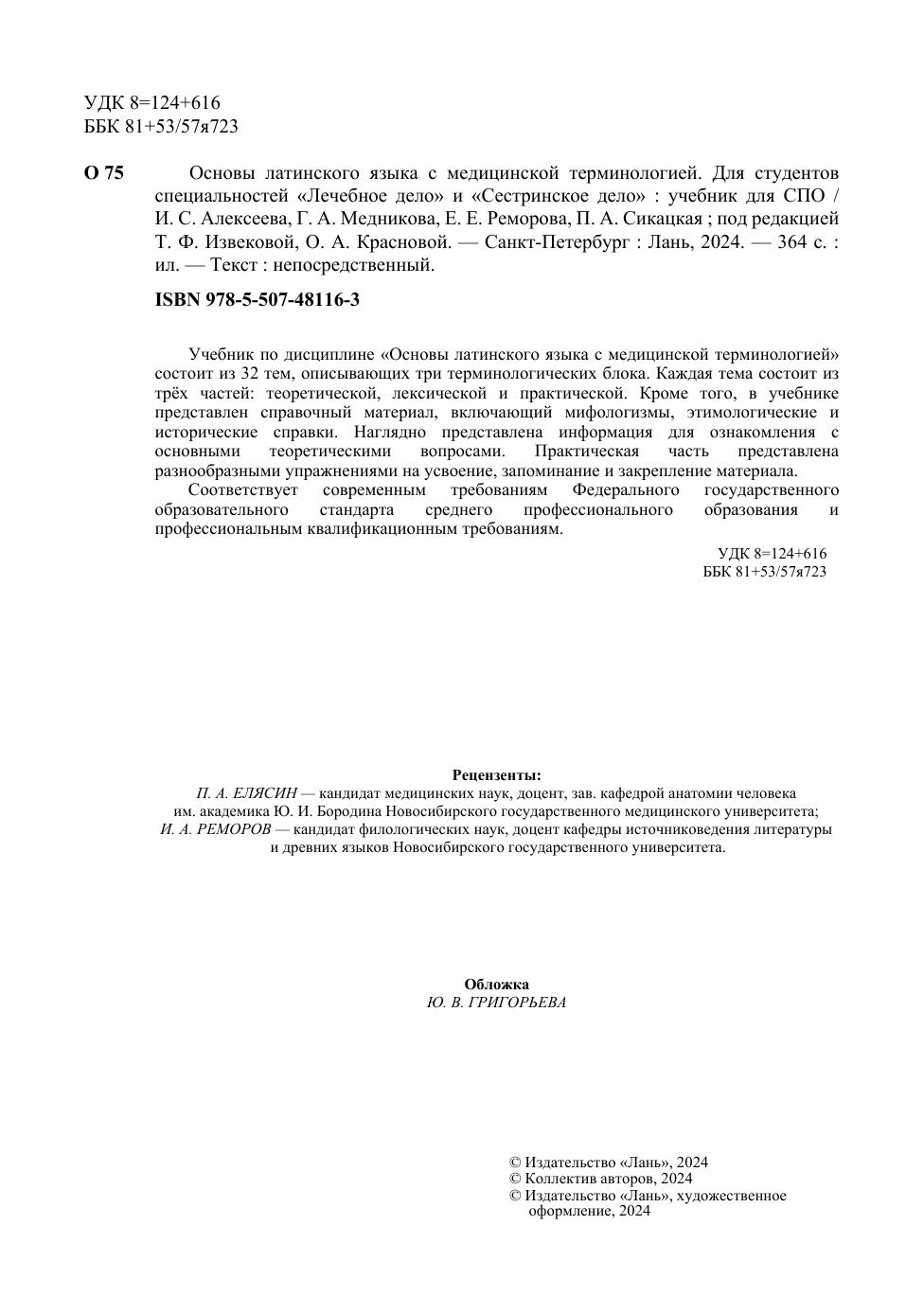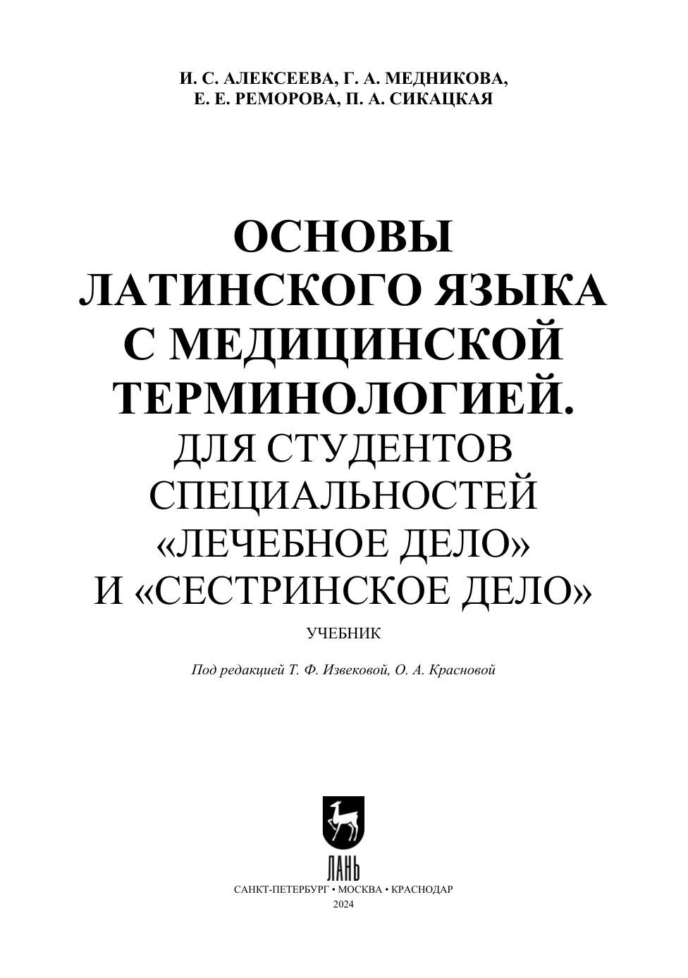 Учебник по дисциплине «Основы латинского языка с медицинской терминологией» состоит из 32 тем, описывающих три терминологических блока. Каждая тема состоит из трёх частей: теоретической, лексической и практической. Кроме того, в учебнике представлен справочный материал, включающий мифологизмы, этимологические и исторические справки. Наглядно представлена информация для ознакомления с основными теоретическими вопросами. Практическая часть представлена разнообразными упражнениями на усвоение, запоминание и закрепление материала. Соответствует современным требованиям Федерального государственного образовательного стандарта среднего профессионального образования и профессиональным квалификационным требованиям.