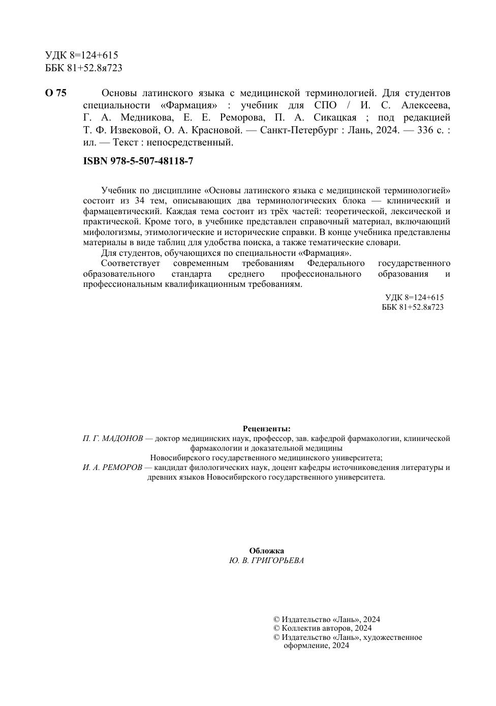 Учебник по дисциплине «Основы латинского языка с медицинской терминологией» состоит из 34 тем, описывающих два терминологических блока — клинический и фармацевтический. Каждая тема состоит из трёх частей: теоретической, лексической и практической. Кроме того, в учебнике представлен справочный материал, включающий мифологизмы, этимологические и исторические справки. В конце учебника представлены материалы в виде таблиц для удобства поиска, а также тематические словари. Для студентов, обучающихся по специальности «Фармация». Соответствует современным требованиям Федерального государственного образовательного стандарта среднего профессионального образования и профессиональным квалификационным требованиям.