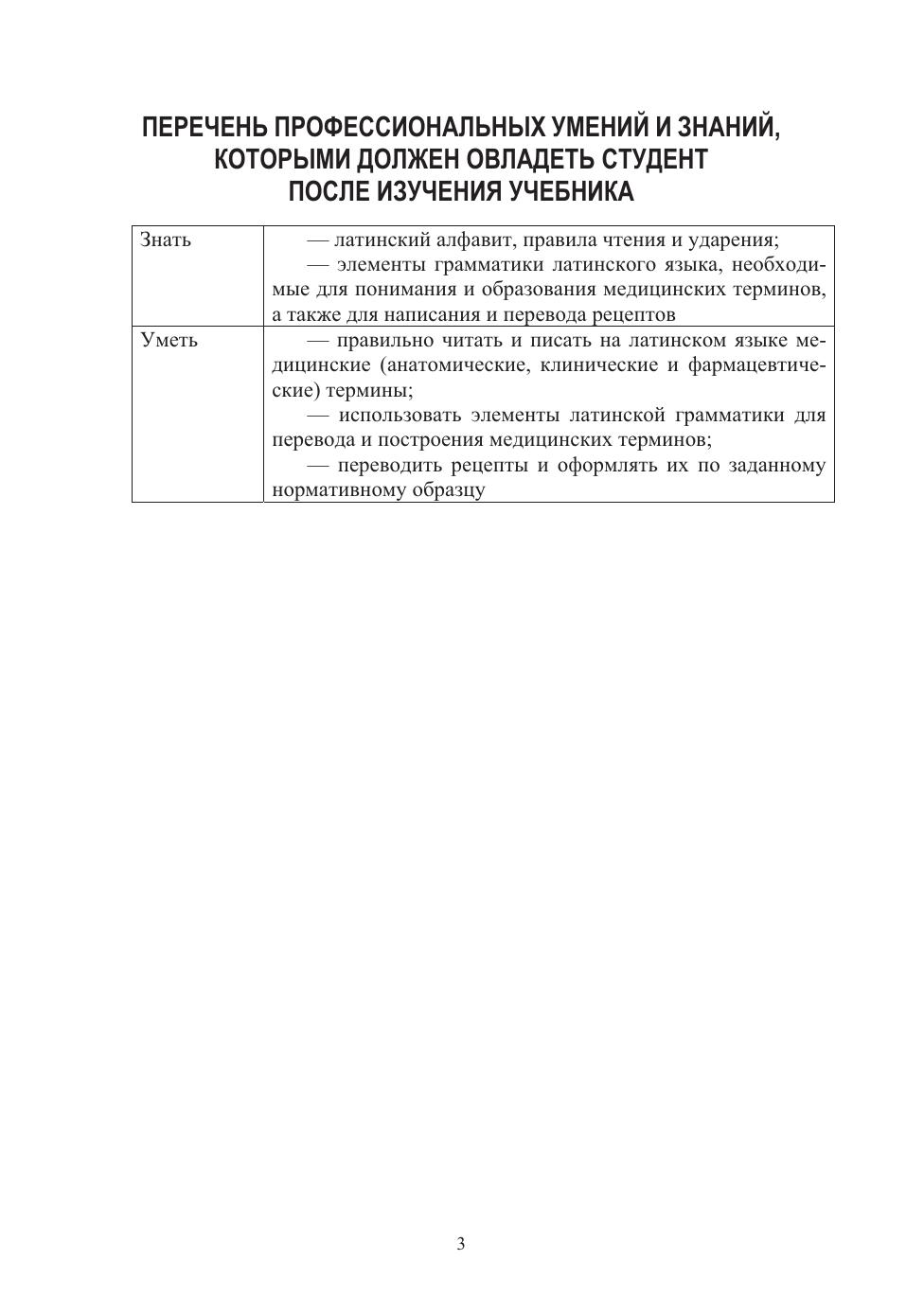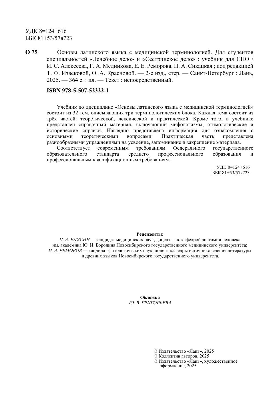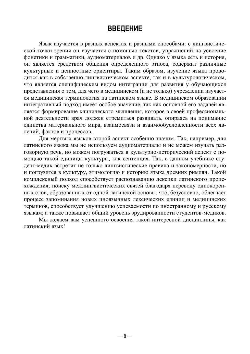 Учебник по дисциплине «Основы латинского языка с медицинской терминологией» состоит из 32 тем, описывающих три терминологических блока. Каждая тема состоит из трёх частей: теоретической, лексической и практической. Кроме того, в учебнике представлен справочный материал, включающий мифологизмы, этимологические и исторические справки. Наглядно представлена информация для ознакомления с основными теоретическими вопросами. Практическая часть представлена разнообразными упражнениями на усвоение, запоминание и закрепление материала. Соответствует современным требованиям Федерального государственного образовательного стандарта среднего профессионального образования и профессиональным квалификационным требованиям.