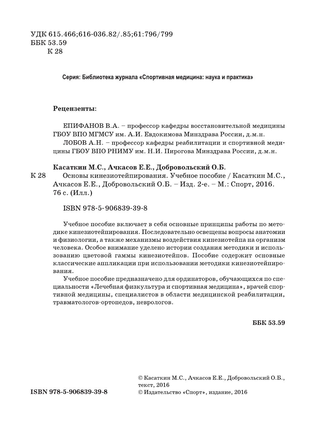 Учебное пособие включает в себя основные принципы работы по методике кинезиотейпирования. Последовательно освещены вопросы анатомии и физиологии, а также механизмы воздействия кинезиотейпа на организм человека. Особое внимание уделено истории создания методики и использованию цветовой гаммы кинезиотейпов. Пособие содержит основные классические аппликации при использовании методики кинезиотейпирования.