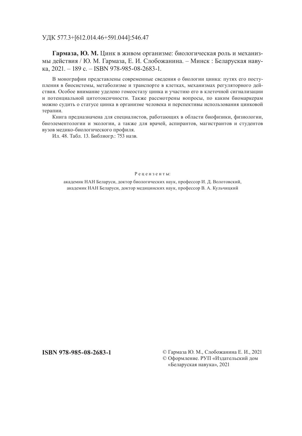 В монографии представлены современные сведения о биологии цинка: путях его поступления в биосистемы, метаболизме и транспорте в клетках, механизмах регуляторного действия. Особое внимание уделено гомеостазу цинка и участию его в клеточной сигнализации и потенциальной цитотоксичности. Также рассмотрены вопросы, по каким биомаркерам можно судить о статусе цинка в организме человека и перспективы использования цинковой терапии.