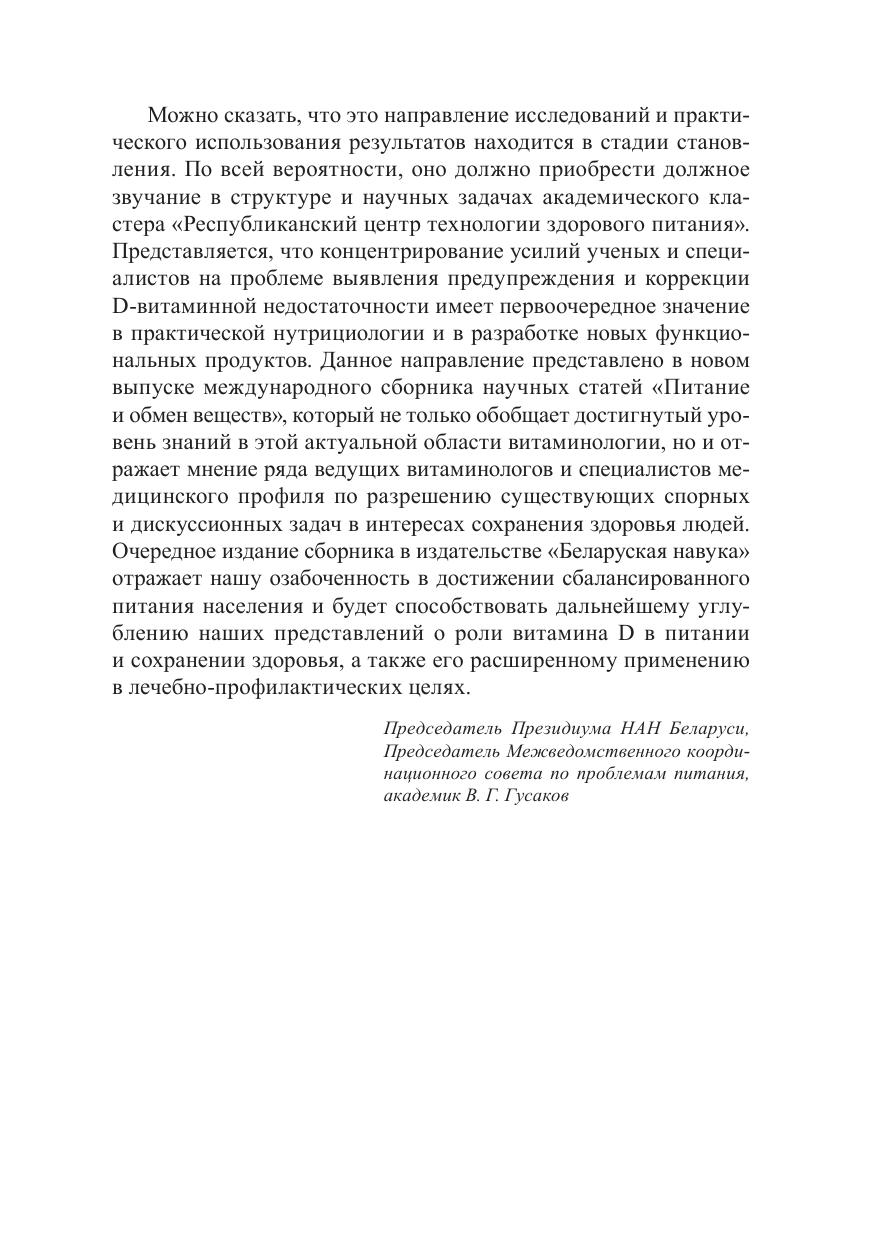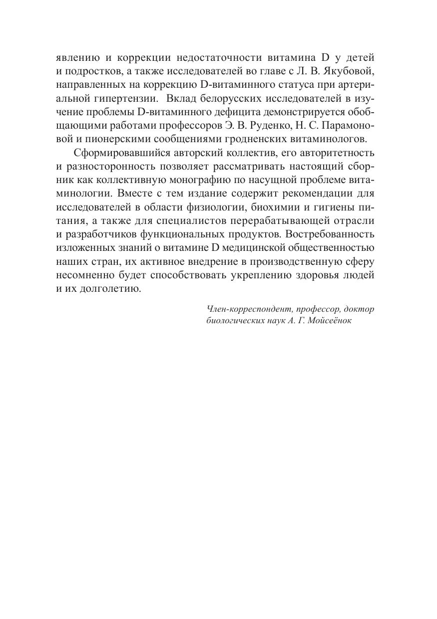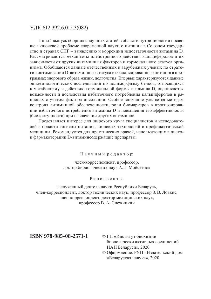 Пятый выпуск сборника научных статей в области нутрициологии посвящен ключевой проблеме современной науки о питании в Союзном государстве и странах СНГ – выявлению и коррекции недостаточности витамина D. Рассматриваются механизмы плейотропного действия кальциферолов и их зависимости от других витаминных факторов и гормонального статуса организма. Обобщаются данные отечественных и зарубежных ученых по стратегии оптимизации D-витаминного статуса и сбалансированного питания в программах здорового образа жизни, долголетия. Впервые характеризуются данные эпидемиологических исследований по полиморфизму белков, относящихся к метаболизму и действию гормональной формы витамина D, оцениваются возможности и последствия избыточного потребления кальциферолов в рационах с учетом фактора инсоляции. Особое внимание уделяется методам контроля витаминной обеспеченности, роли биомаркеров в прогнозировании избыточного потребления витамина D и повышения его эффективности (биодоступности) при назначении других витаминов. Представляет интерес для широкого круга специалистов и исследователей в области гигиены питания, пищевых технологий и профилактической медицины. Рекомендуется для практических врачей, использующих в дието- и фармакотерапии D-витаминсодержащие препараты.