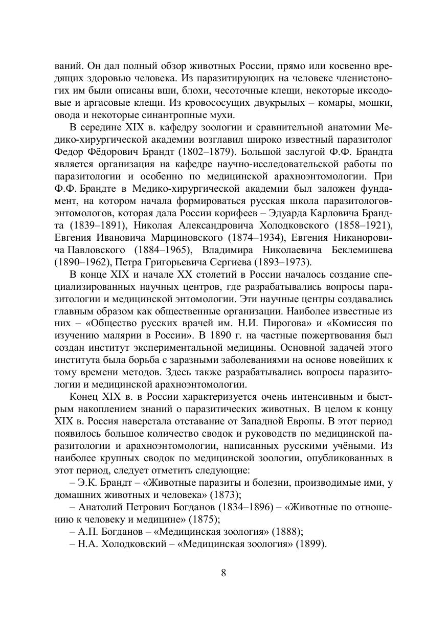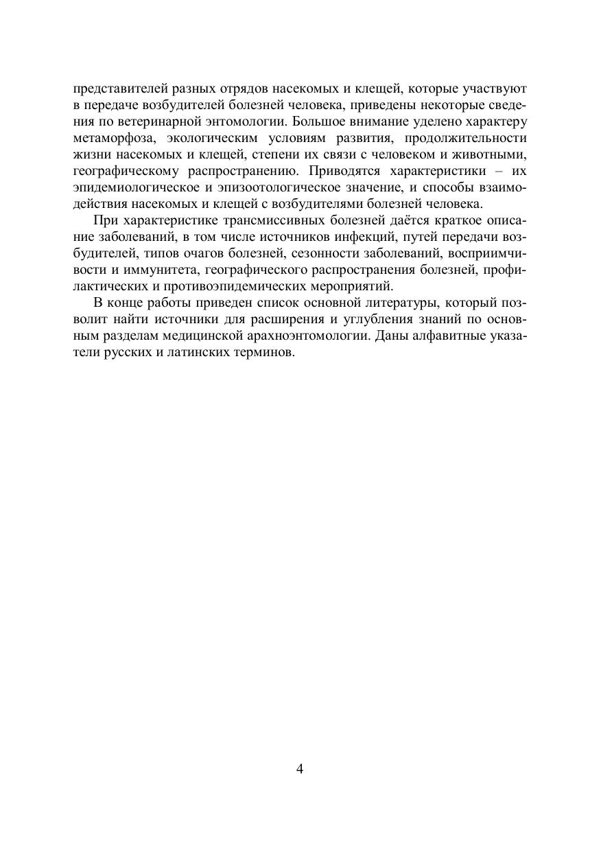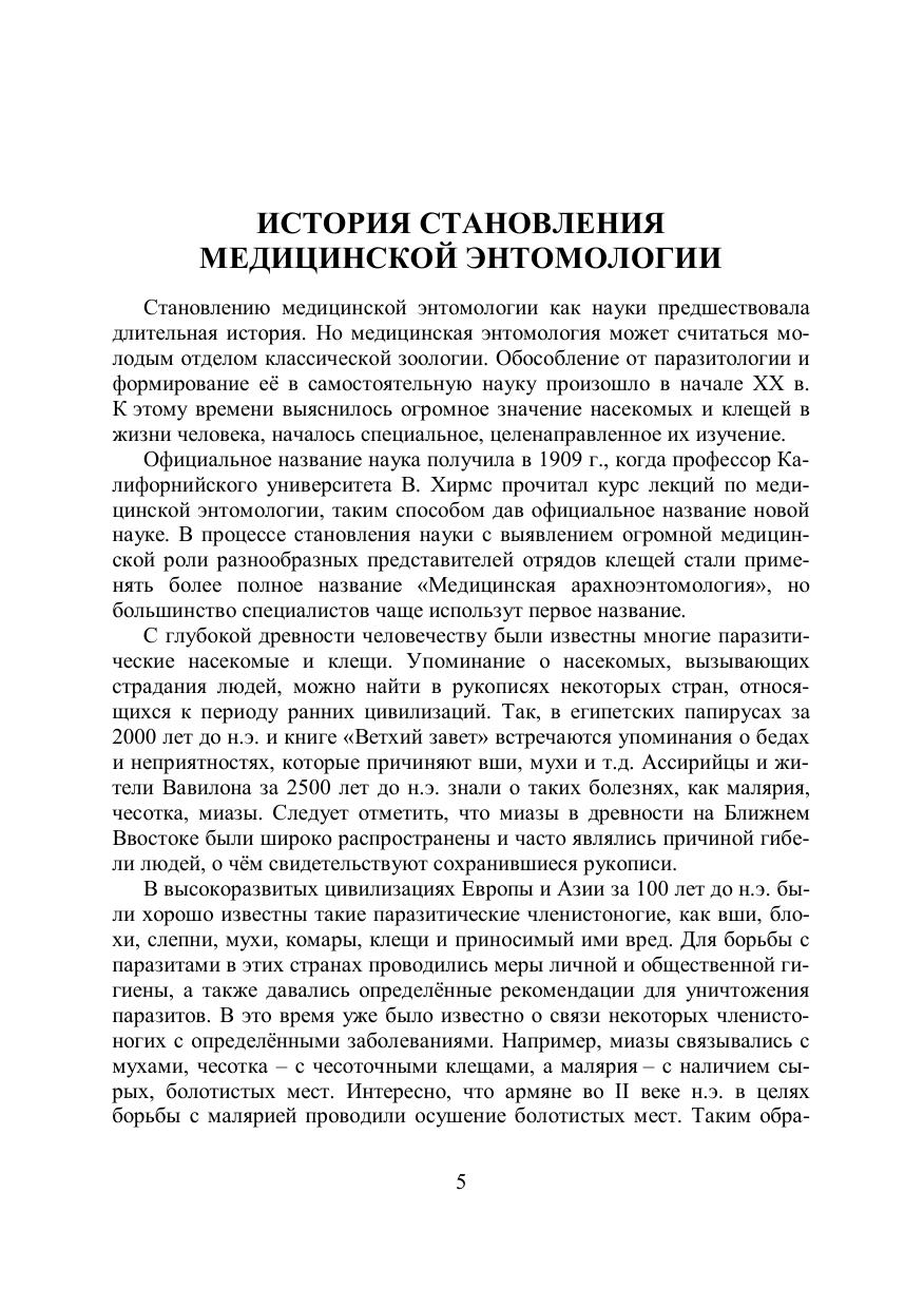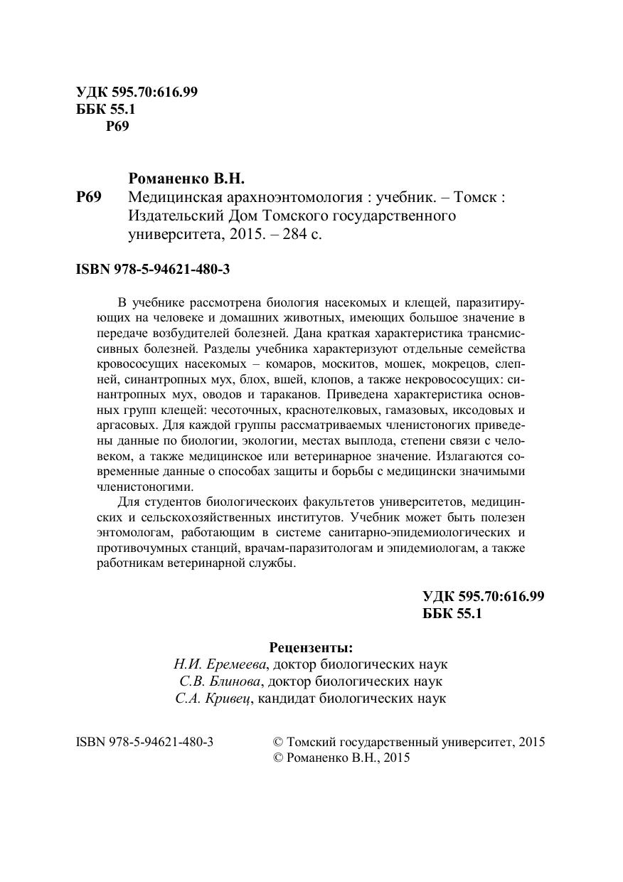 В учебнике рассмотрена биология насекомых и клещей, паразитирующих на человеке и домашних животных, имеющих большое значение в передаче возбудителей болезней. Дана краткая характеристика трансмиссивных болезней. Разделы учебника характеризуют отдельные семейства кровососущих насекомых – комаров, москитов, мошек, мокрецов, слепней, синантропных мух, блох, вшей, клопов, а также некровососущих: синантропных мух, оводов и тараканов. Приведена характеристика основных групп клещей: чесоточных, краснотелковых, гамазовых, иксодовых и аргасовых. Для каждой группы рассматриваемых членистоногих приведены данные по биологии, экологии, местах выплода, степени связи с человеком, а также медицинское или ветеринарное значение. Излагаются современные данные о способах защиты и борьбы с медицински значимыми членистоногими. Для студентов биологическоих факультетов университетов, медицинских и сельскохозяйственных институтов. Учебник может быть полезен энтомологам, работающим в системе санитарно-эпидемиологических и противочумных станций, врачам-паразитологам и эпидемиологам, а также работникам ветеринарной службы.