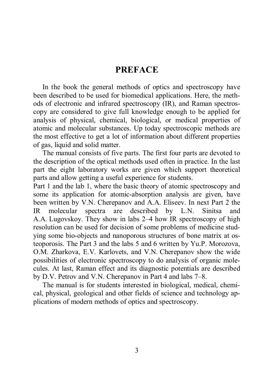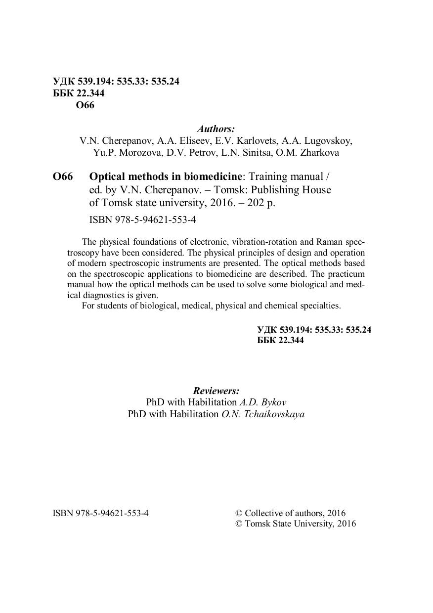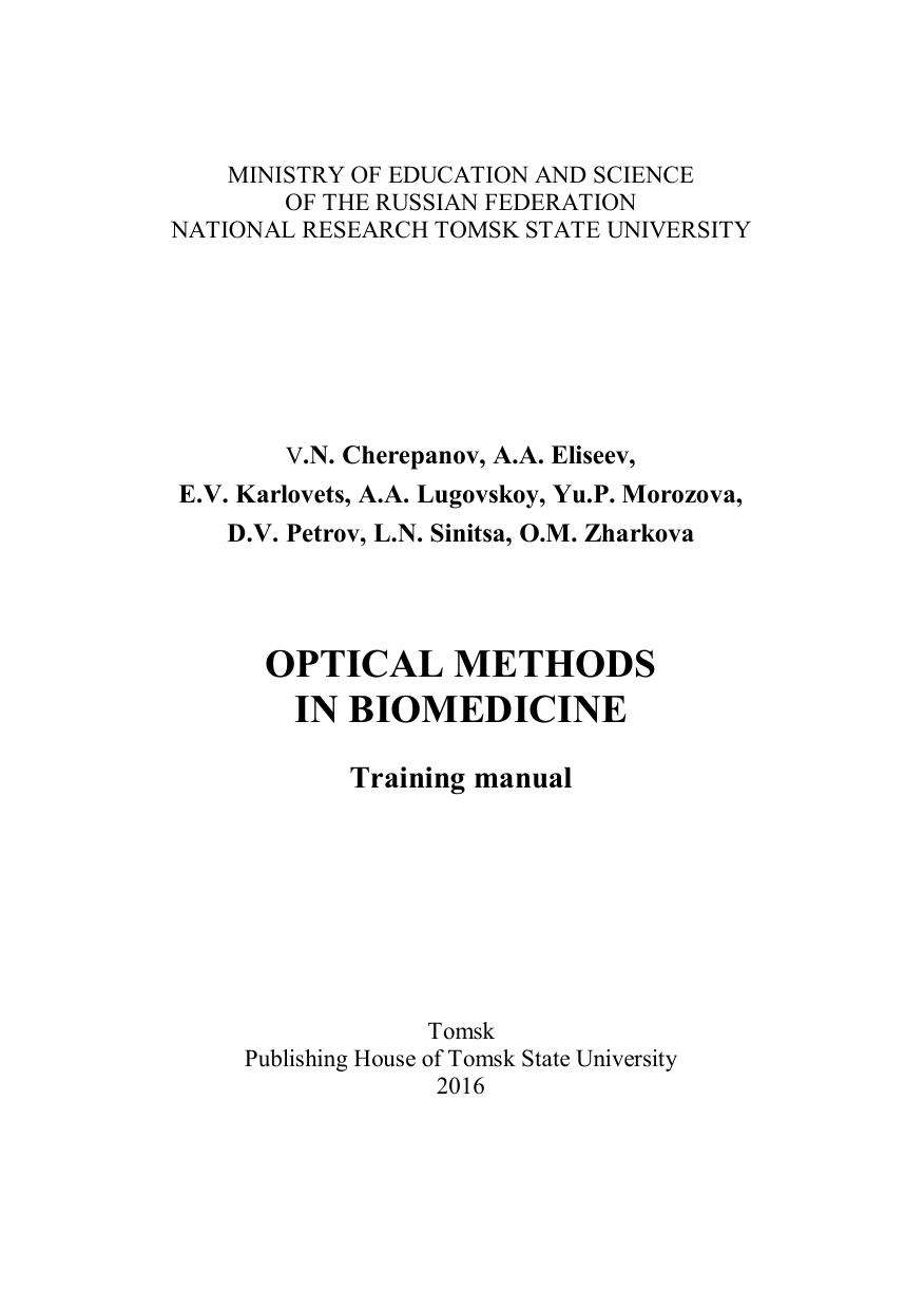 The physical foundations of electronic, vibration-rotation and Raman spectroscopy have been considered. The physical principles of design and operation of modern spectroscopic instruments are presented. The optical methods based on the spectroscopic applications to biomedicine are described. The practicum manual how the optical methods can be used to solve some biological and medical diagnostics is given. For students of biological, medical, physical and chemical specialties.