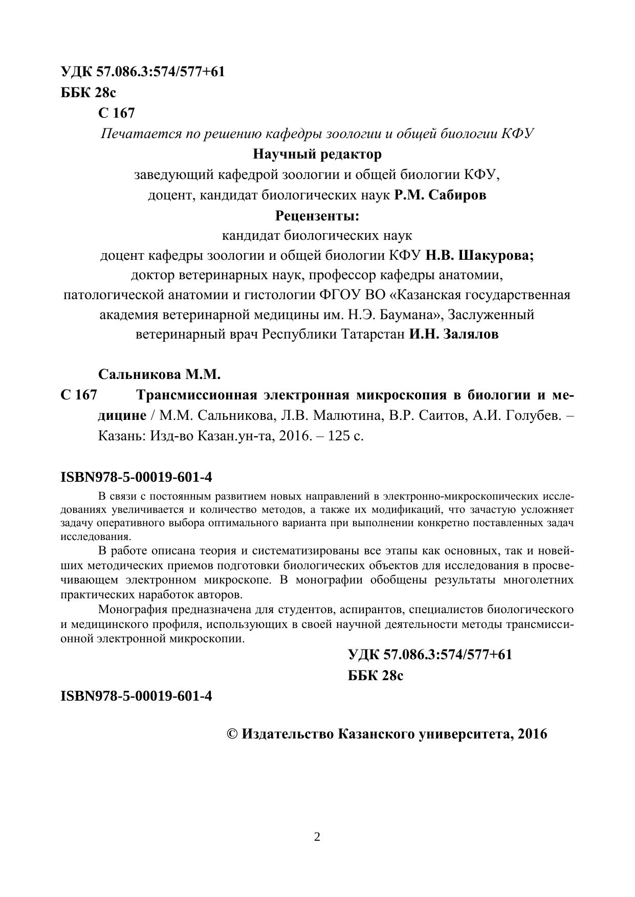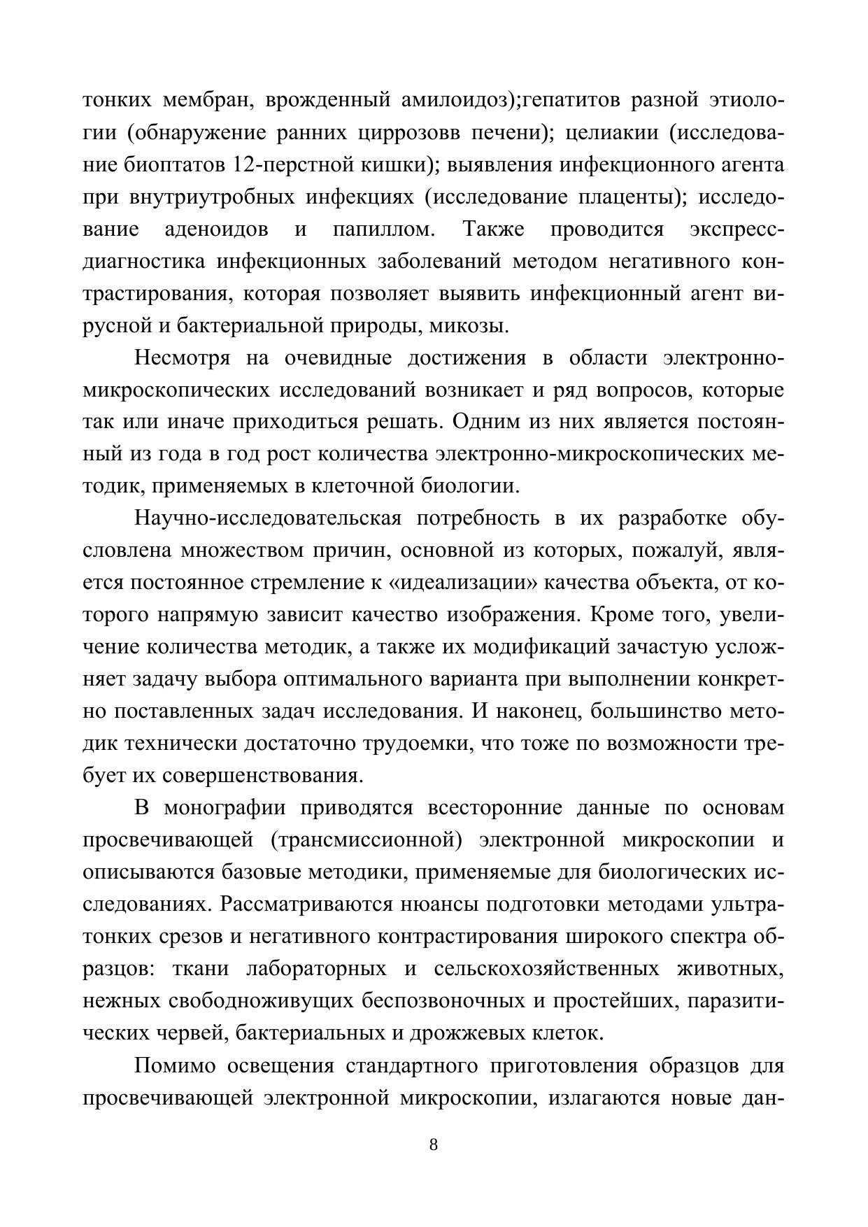 В связи с постоянным развитием новых направлений в электронно-микроскопических исследованиях увеличивается и количество методов, а также их модификаций, что зачастую усложняет задачу оперативного выбора оптимального варианта при выполнении конкретно поставленных задач исследования. В работе описана теория и систематизированы все этапы как основных, так и новейших методических приемов подготовки биологических объектов для исследования в просвечивающем электронном микроскопе. В монографии обобщены результаты многолетних практических наработок авторов. Монография предназначена для студентов, аспирантов, специалистов биологического и медицинского профиля, использующих в своей научной деятельности методы трансмиссионной электронной микроскопии