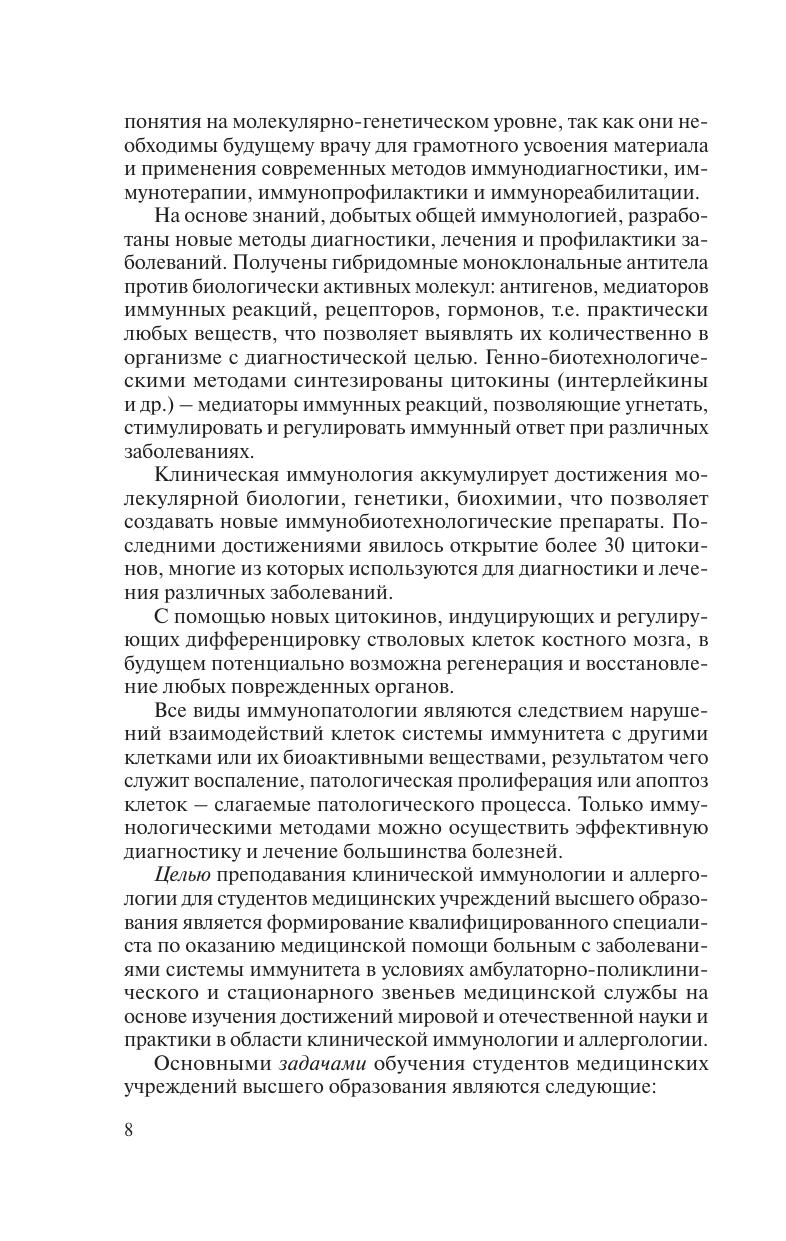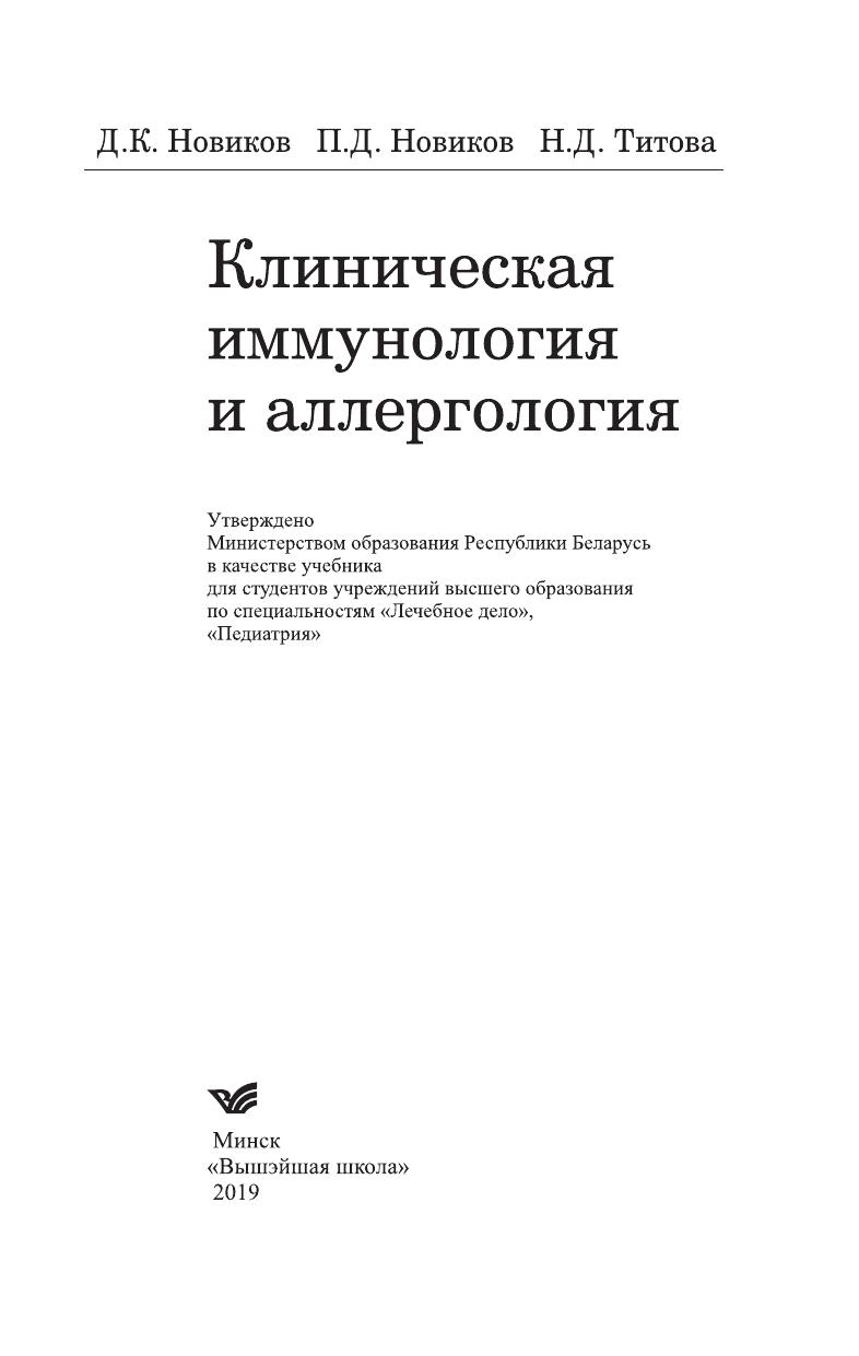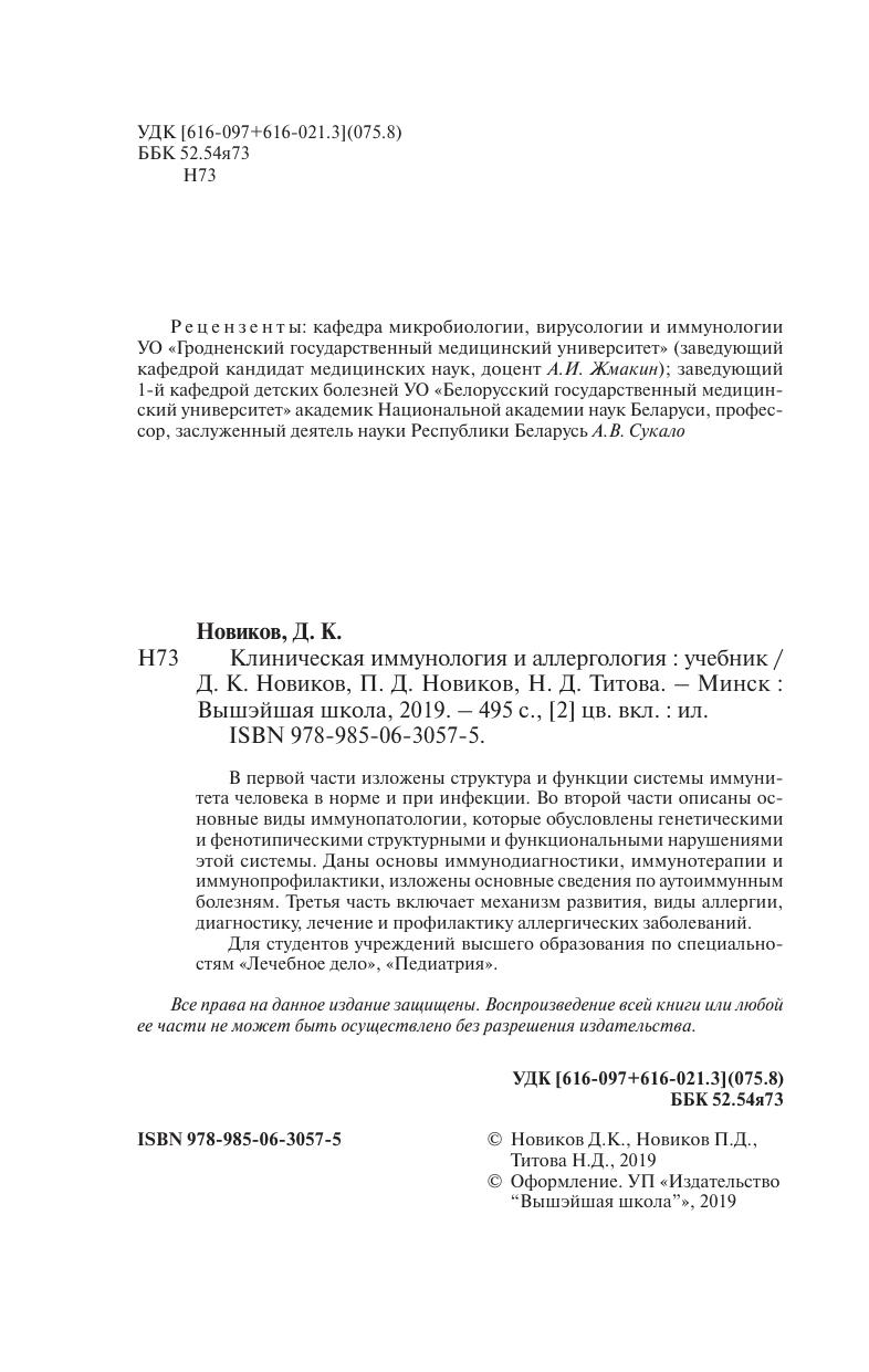 В первой части изложены структура и функции системы иммунитета человека в норме и при инфекции. Во второй части описаны основные виды иммунопатологии, которые обусловлены генетическими и фенотипическими структурными и функциональными нарушениями этой системы. Даны основы иммунодиагностики, иммунотерапии и иммунопрофилактики, изложены основные сведения по аутоиммунным болезням. Третья часть включает механизм развития, виды аллергии, диагностику, лечение и профилактику аллергических заболеваний. Для студентов учреждений высшего образования по специальностям «Лечебное дело», «Педиатрия».