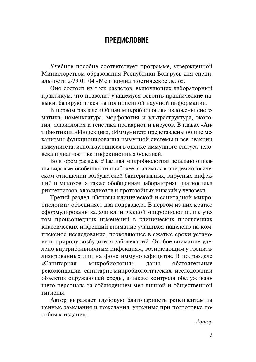 Состоит из трех разделов. В первом разделе "Общая микробиология" изложена систематика, морфология, экология, генетика бактерий и вирусов, антибиотики и механизм их действия, инфекция и иммунитет, в частности, общие механизмы функционирования иммунной системы и все реакции иммунитета, использующиеся в диагностике инфекционных болезней. Во втором разделе "Частная микробиология"представлены видовые особенности возбудителей инфекционных болезней и их лабораторная диагностика в соответствии с предписаниями программы. В третьем отделе "Основы клинической и санитарной микробиологии" особое внимание уделено бактериологической диагностике внутрибольничных инфекций, методам санитарно-микробиологических исследований объектов окружающей среды и качества пищевых продуктов. Для учащихся медицинских колледжей. Будет полезна санитарным врачам, эпидемиологам, инфекционистам, иммунологам, биологам.