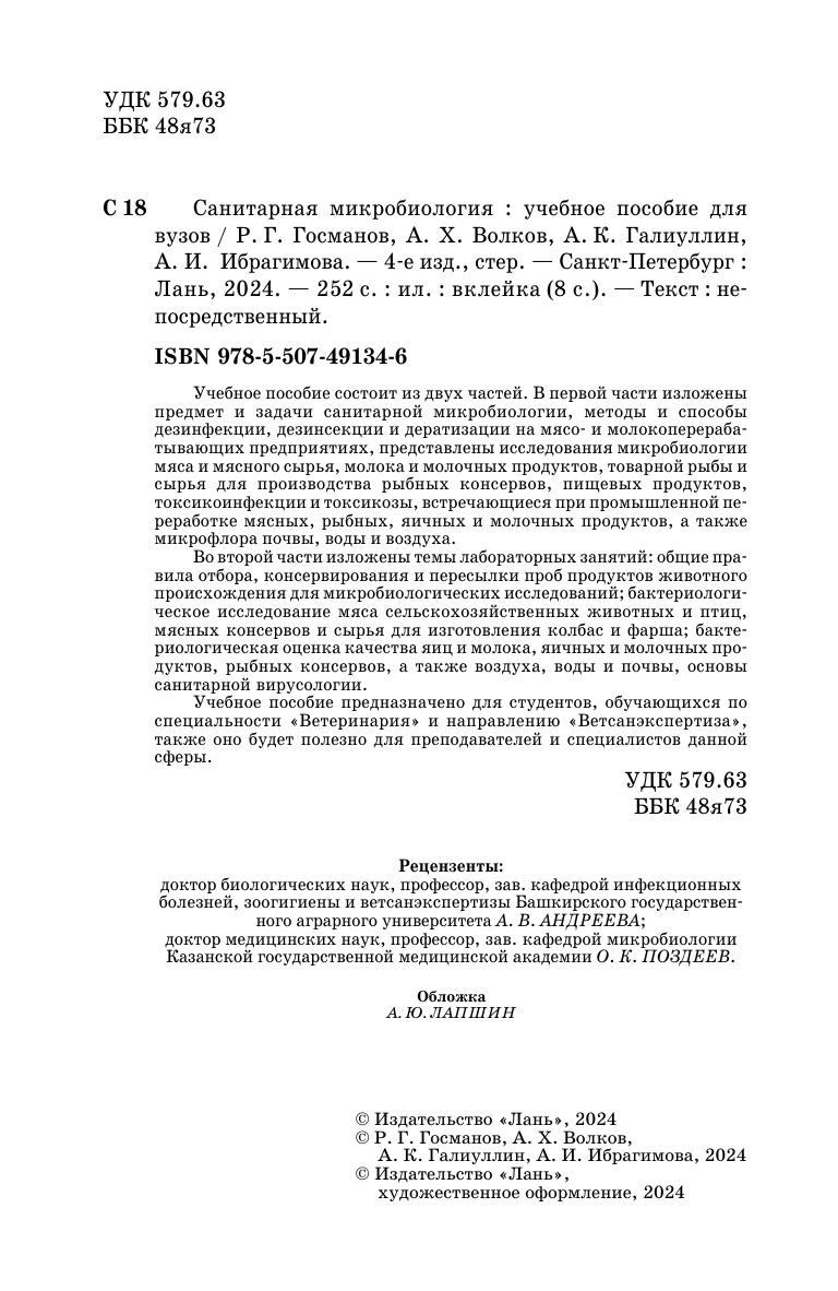 Учебное пособие состоит из двух частей. В первой части изложены предмет и задачи санитарной микробиологии, методы и способы дезинфекции, дезинсекции и дератизации на мясо- и молокоперерабатывающих предприятиях, представлены исследования микробиологии мяса и мясного сырья, молока и молочных продуктов, товарной рыбы и сырья для производства рыбных консервов, пищевых продуктов, токсикоинфекции и токсикозы, встречающиеся при промышленной переработке мясных, рыбных, яичных и молочных продуктов, а также микрофлора почвы, воды и воздуха. Во второй части изложены темы лабораторных занятий: общие правила отбора, консервирования и пересылки проб продуктов животного происхождения для микробиологических исследований, бактериологическое исследование мяса сельскохозяйственных животных и птиц, мясных консервов и сырья для изготовления колбас и фарша, бактериологическая оценка качества яиц и молока, яичных и молочных продуктов, рыбных консервов, а также воздуха, воды и почвы, основы санитарной вирусологии.