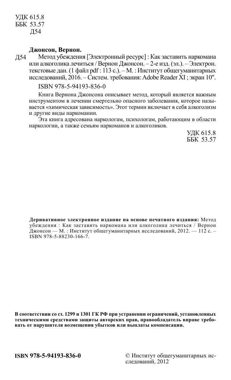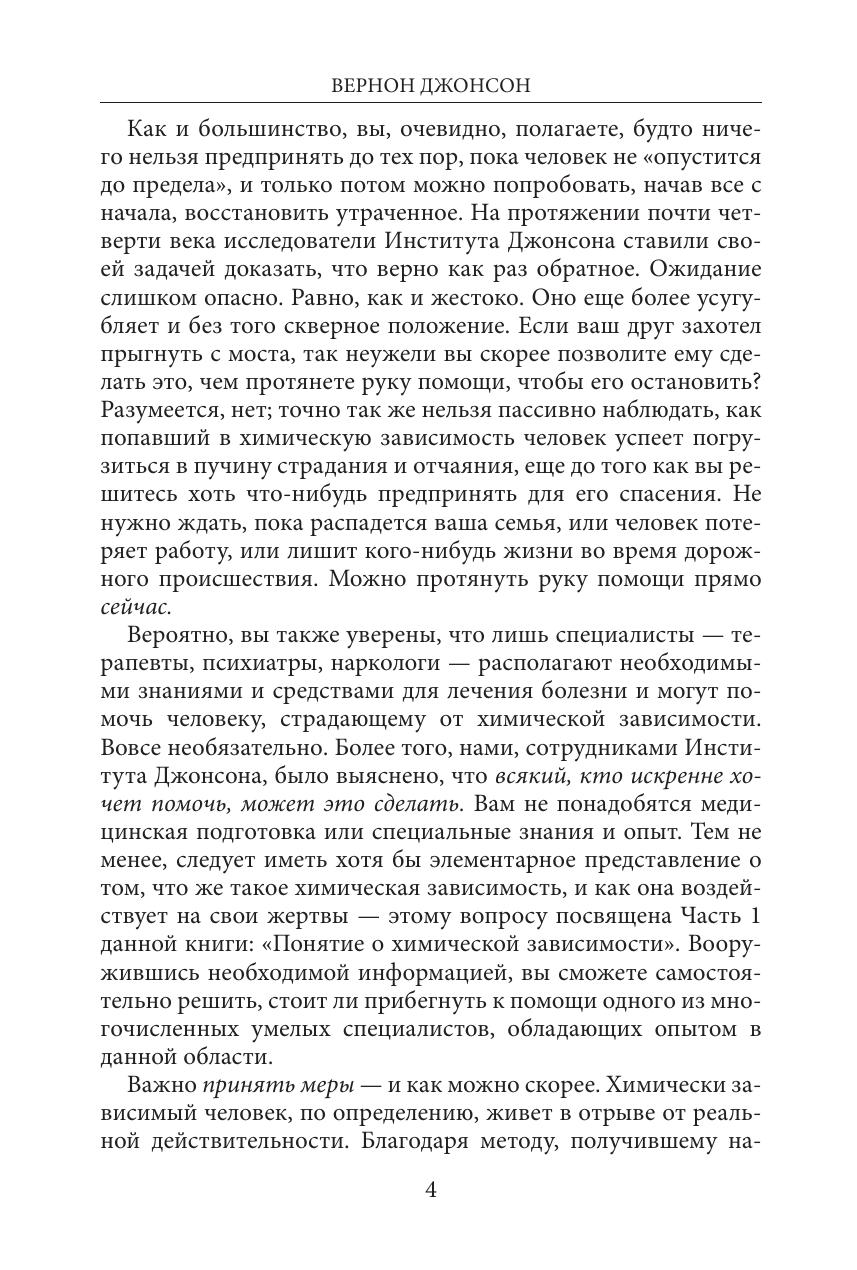 Книга Вернона Джонсона описывает метод, который является важным инструментом в лечении смертельно опасного заболевания, которое называется «химическая зависимость». Этот термин включает в себя алкоголизм и другие виды наркомании.