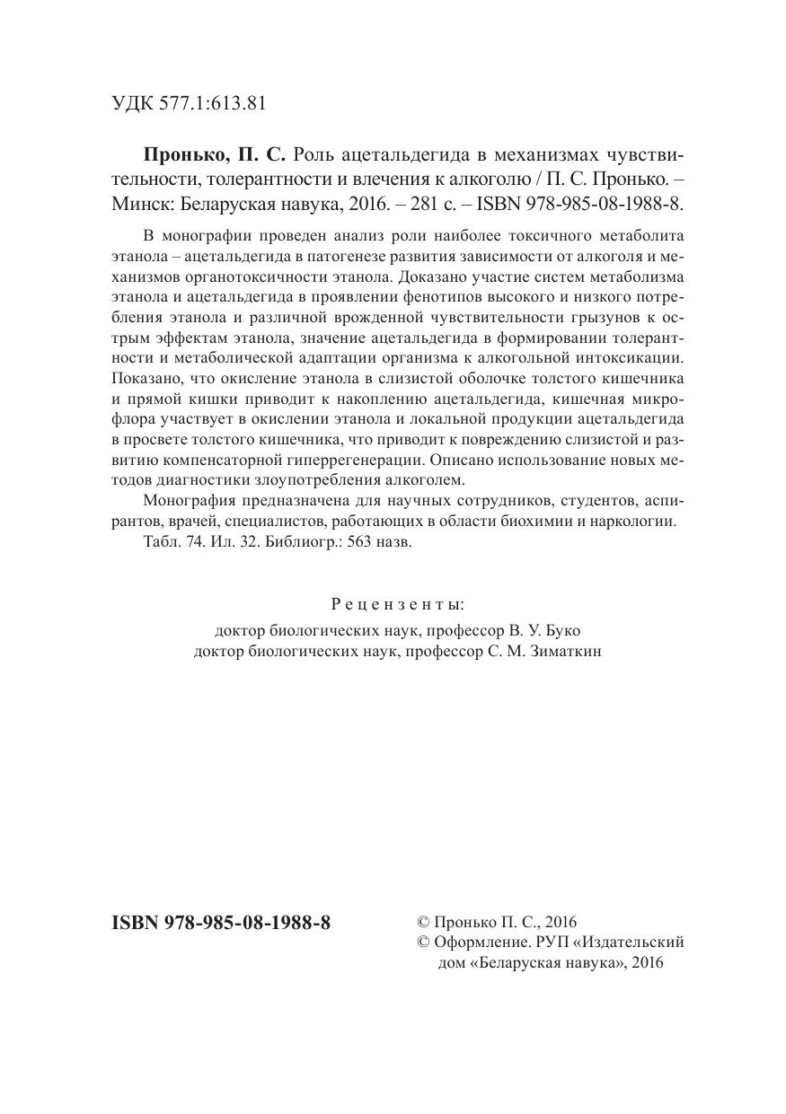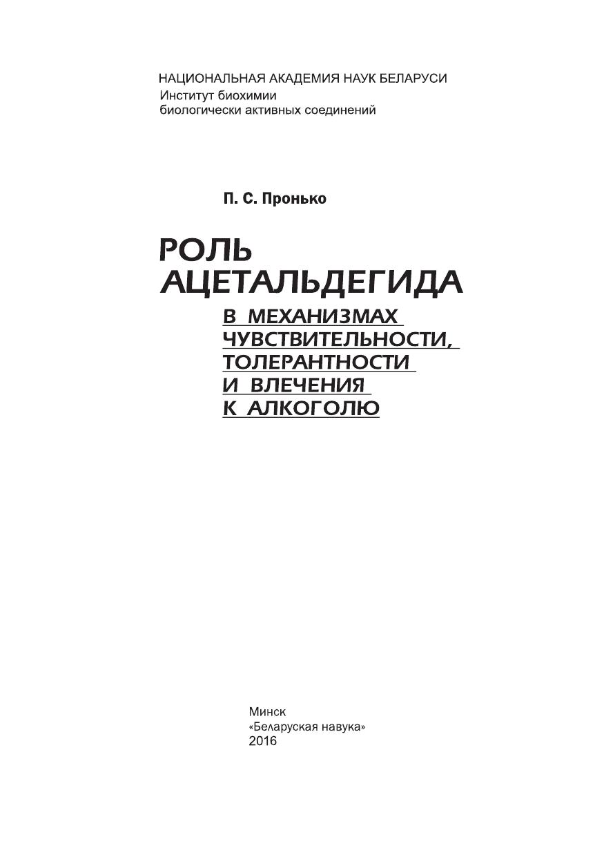 В монографии проведен анализ роли наиболее токсичного метаболита этанола – ацетальдегида в патогенезе развития зависимости от алкоголя и механизмов органотоксичности этанола. Доказано участие систем метаболизма этанола и ацетальдегида в проявлении фенотипов высокого и низкого потребления этанола и различной врожденной чувствительности грызунов к острым эффектам этанола, значение ацетальдегида в формировании толерантности и метаболической адаптации организма к алкогольной интоксикации. Показано, что окисление этанола в слизистой оболочке толстого кишечника и прямой кишки приводит к накоплению ацетальдегида, кишечная микрофлора участвует в окислении этанола и локальной продукции ацетальдегида в просвете толстого кишечника, что приводит к повреждению слизистой и развитию компенсаторной гиперрегенерации. Описано использование новых методов диагностики злоупотребления алкоголем. Монография предназначена для научных сотрудников, студентов, аспирантов, врачей, специалистов, работающих в области биохимии и наркологии.