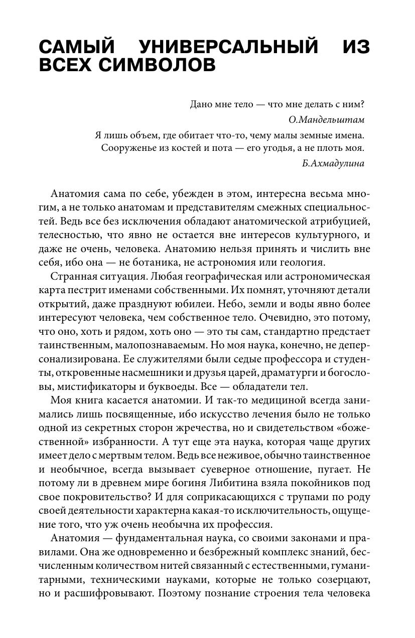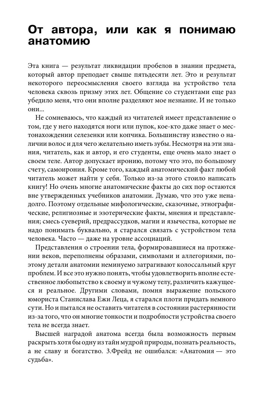 Автор книги свыше пятидесяти лет преподает студентам-медикам анатомию человека — науку не только об устройстве нашего тела, но и многочисленных его функциях. В данной работе предпринята попытка связать строение ряда человеческих органов, тканей и образуемых ими систем с колоссальным пластом мифов, легенд, религиозных воззрений, обычаев, житейских представлений. Рассматриваются различные взгляды на внешний облик человека, а также приводятся малоизвестные сведения об анатомии, интересные факты о вариациях телесной красоты, о всевозможных искусственных ее изменениях и т.п. Вполне естественно, что подобная информация далеко выходит за пределы стандартного курса по названному предмету.