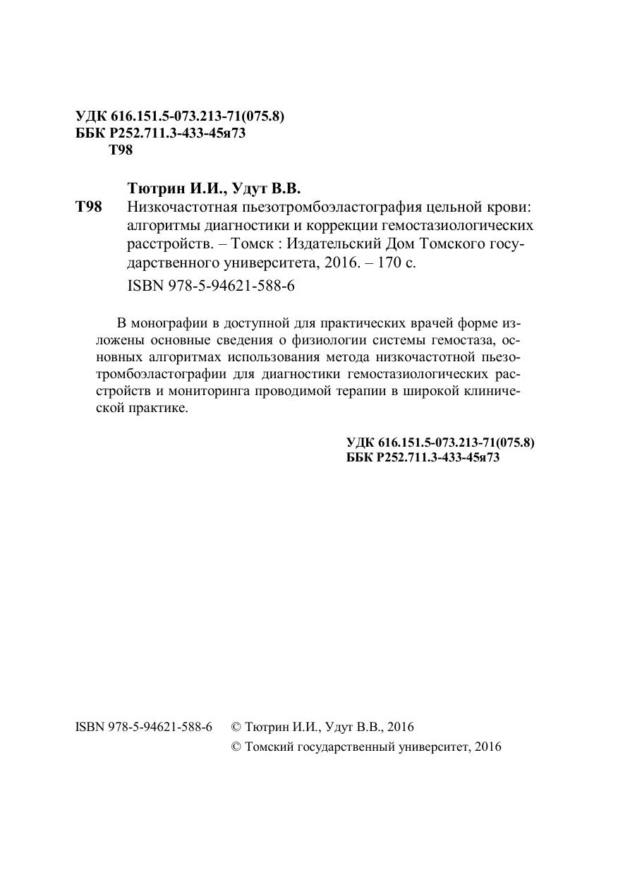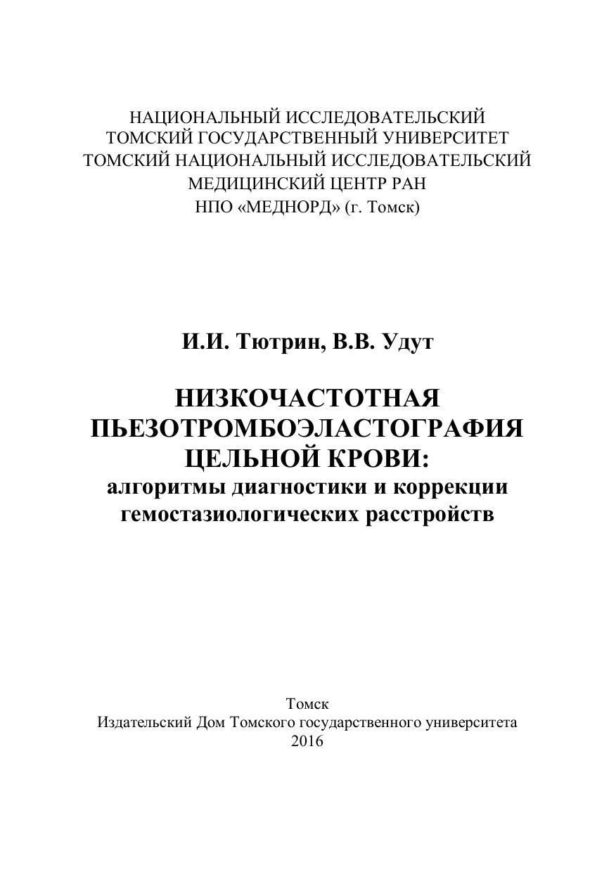 В монографии в доступной для практических врачей форме изложены основные сведения о физиологии системы гемостаза, основных алгоритмах использования метода низкочастотной пьезотромбоэластографии для диагностики гемостазиологических расстройств и мониторинга проводимой терапии в широкой клинической практике.