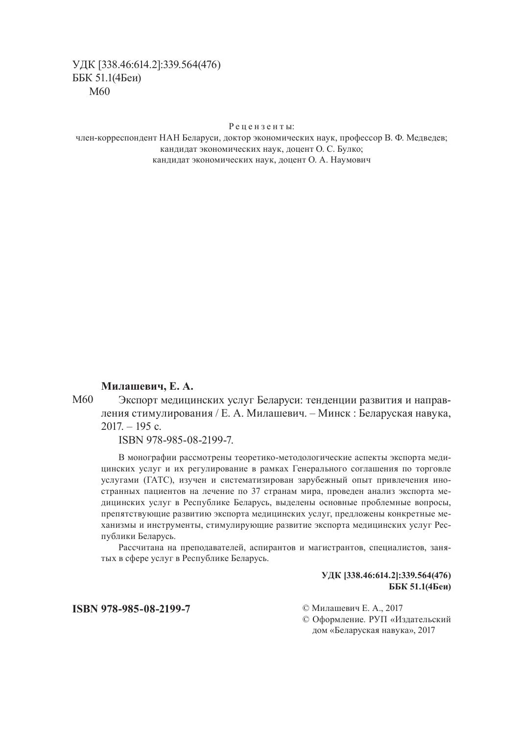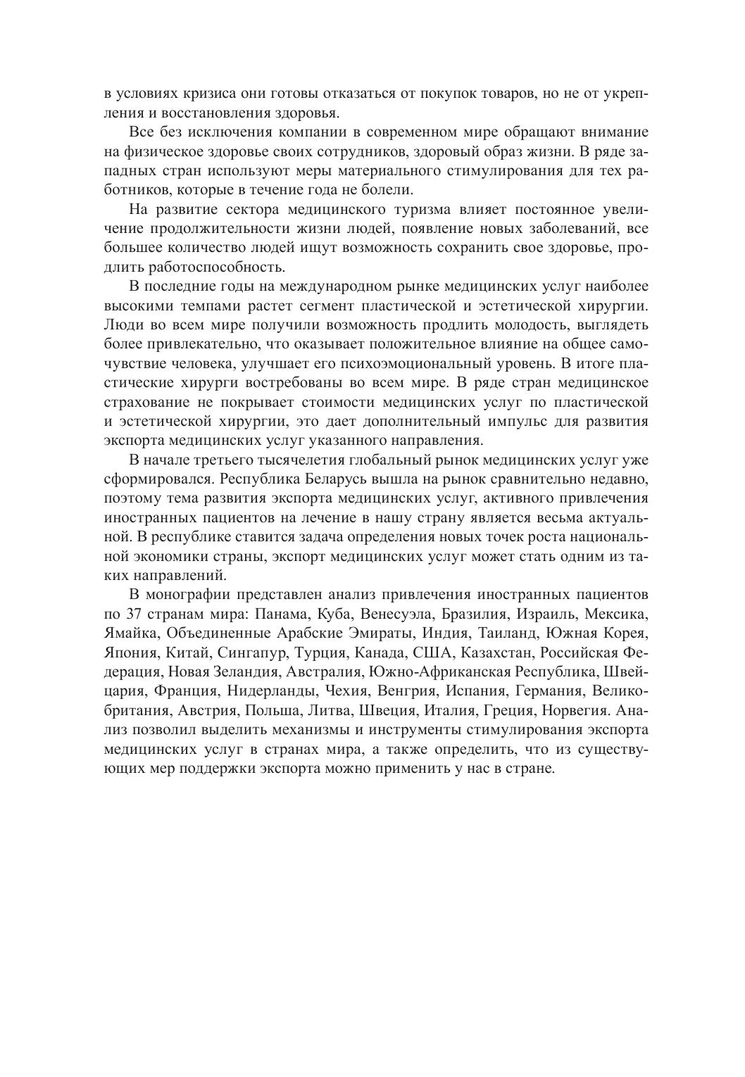 В монографии рассмотрены теоретико-методологические аспекты экспорта медицинских услуг и их регулирование в рамках Генерального соглашения по торговле услугами (ГАТС), изучен и систематизирован зарубежный опыт привлечения иностранных пациентов на лечение по 37 странам мира, проведен анализ экспорта медицинских услуг в Республике Беларусь, выделены основные проблемные вопросы, препятствующие развитию экспорта медицинских услуг, предложены конкретные механизмы и инструменты, стимулирующие развитие экс порта медицинских услуг Республики Беларусь. Рассчитана на преподавателей, аспирантов и магистрантов, специалистов, занятых в сфере услуг в Республике Беларусь.