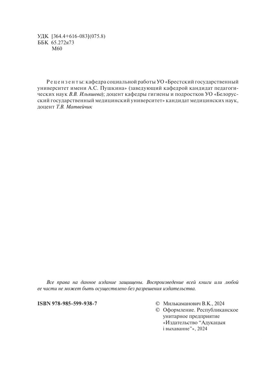 Представлены термины и понятия, излагаются направления медико-социальной работы (с лицами без определенного места жительства, с беженцами и вынужденными переселенцами, с семьями, имеющими на попечении детей-сирот, детей, оставшихся без попечения родителей, и детей с особенностя ми психофизического развития, а также с пациентами, которые имеют онкологические заболевания, синдром старческой астении, туберкулез и психические заболевания), включающие профилактическую и патогенетическую (реабилитационную) составляющие в системе здравоохранения, образования и социальной защиты населения. Для студентов учреждений высшего образования, обучающихся по специальности «Социальная работа», специалистов социальной сферы с целью повышения квалификации, а также для широкого круга читателей, работающих в системе «человек – человек».