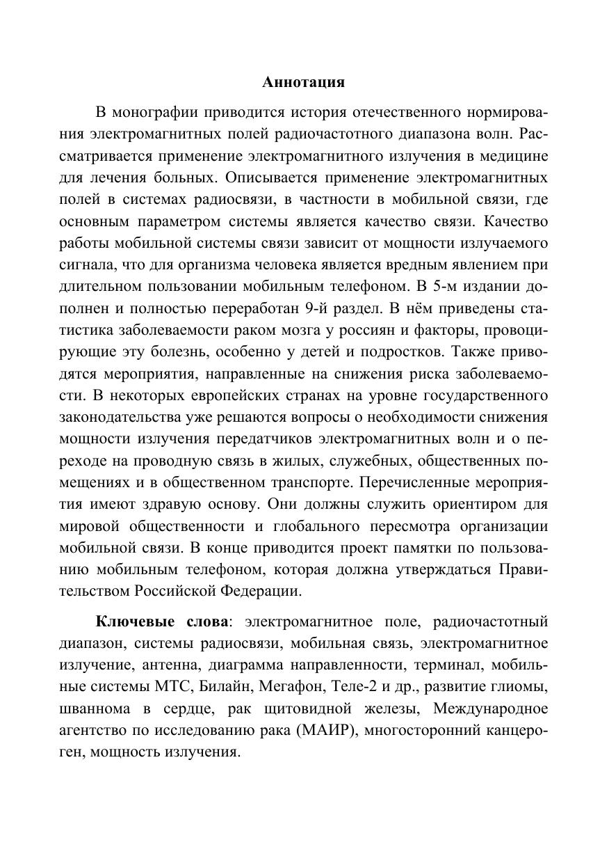 В монографии приводится история отечественного нормирования электромагнитных полей радиочастотного диапазона волн. Рассматривается применение электромагнитного излучения в медицине для лечения больных. Описывается применение электромагнитных полей в системах радиосвязи, в частности в мобильной связи, где основным параметром системы является качество связи.