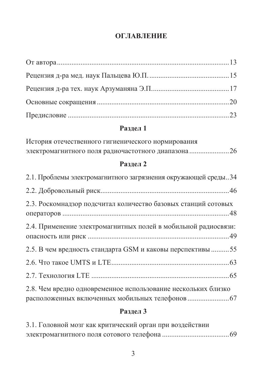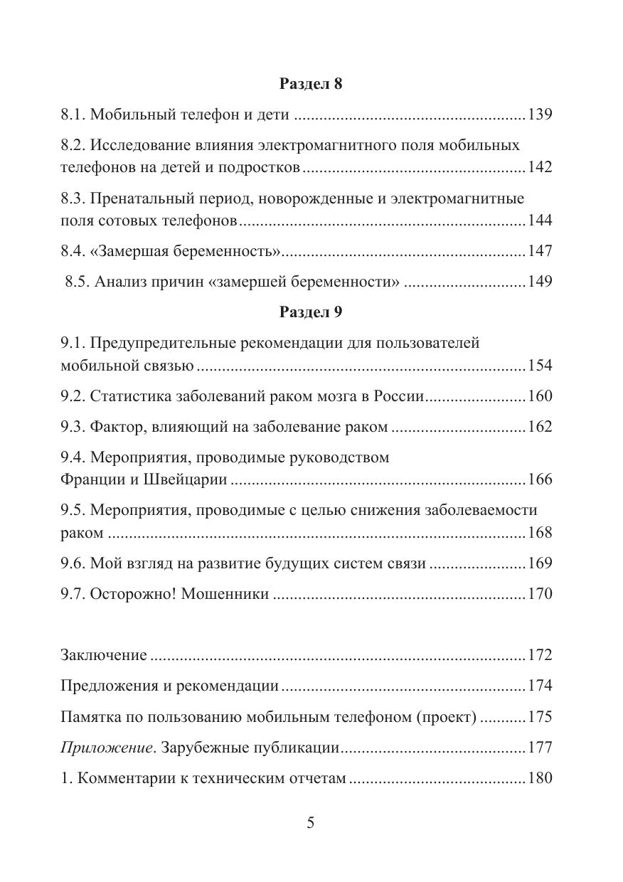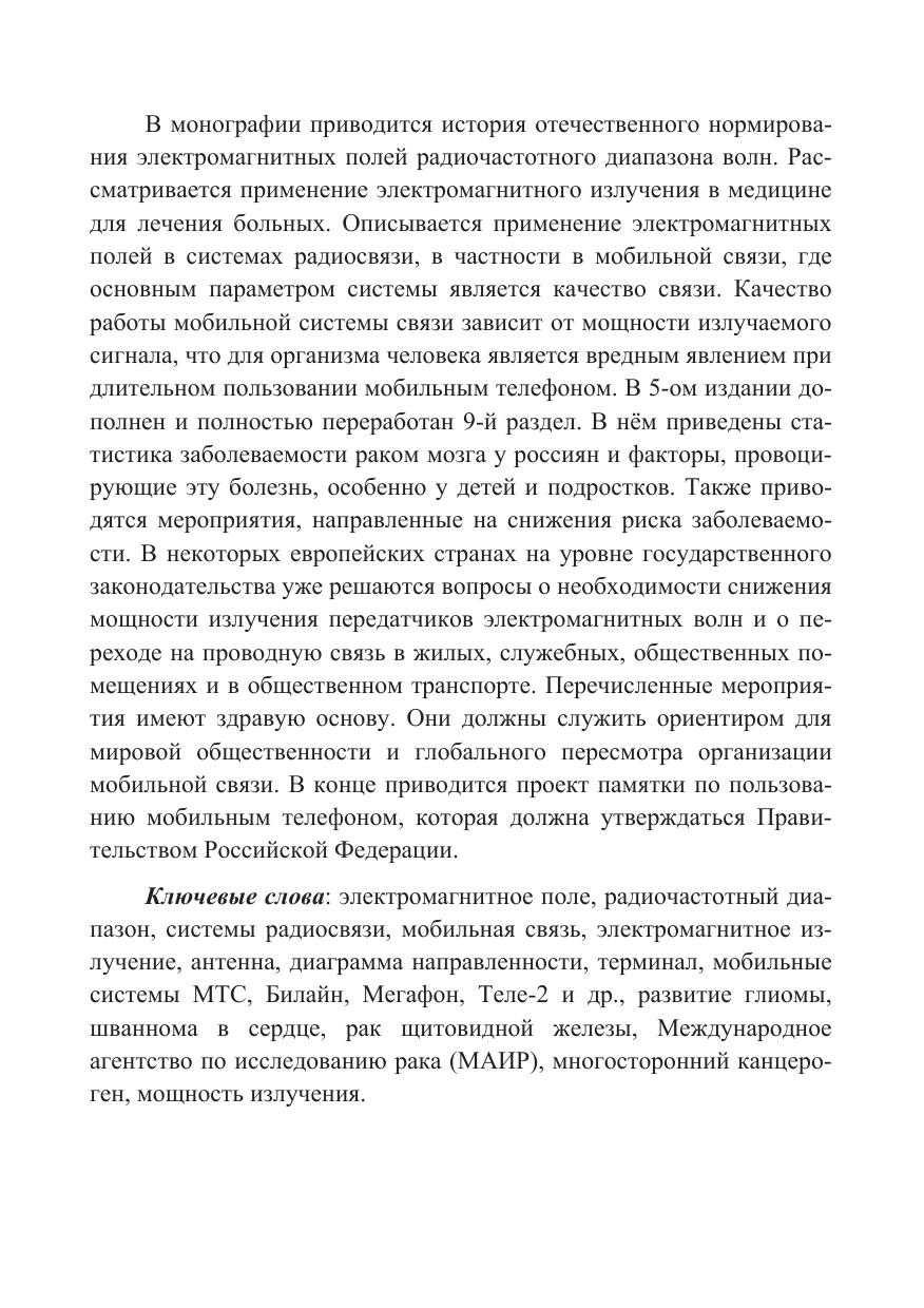 В монографии приводится история отечественного нормирования электромагнитных полей радиочастотного диапазона волн. Рассматривается применение электромагнитного излучения в медицине для лечения больных. Описывается применение электромагнитных полей в системах радиосвязи, в частности в мобильной связи, где основным параметром системы является качество связи. Качество работы мобильной системы связи зависит от мощности излучаемого сигнала, что для организма человека является вредным явлением при длительном пользовании мобильным телефоном. В 5-ом издании дополнен и полностью переработан 9-й раздел. В нём приведены статистика заболеваемости раком мозга у россиян и факторы, провоцирующие эту болезнь, особенно у детей и подростков. Также приводятся мероприятия, направленные на снижения риска заболеваемости. В некоторых европейских странах на уровне государственного законодательства уже решаются вопросы о необходимости снижения мощности излучения передатчиков электромагнитных волн и о переходе на проводную связь в жилых, служебных, общественных помещениях и в общественном транспорте. Перечисленные мероприятия имеют здравую основу. Они должны служить ориентиром для мировой общественности и глобального пересмотра организации мобильной связи. В конце приводится проект памятки по пользованию мобильным телефоном, которая должна утверждаться Правительством Российской Федерации.
