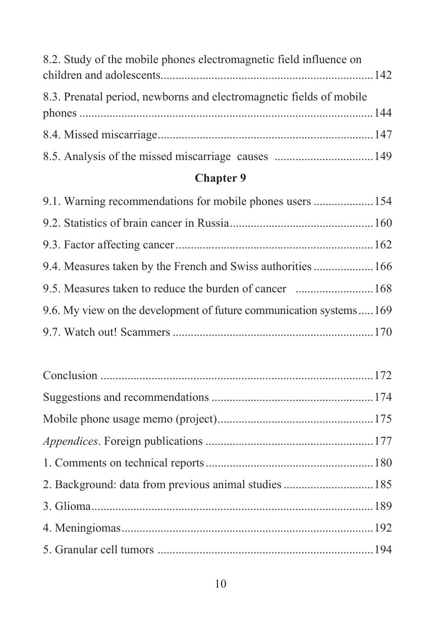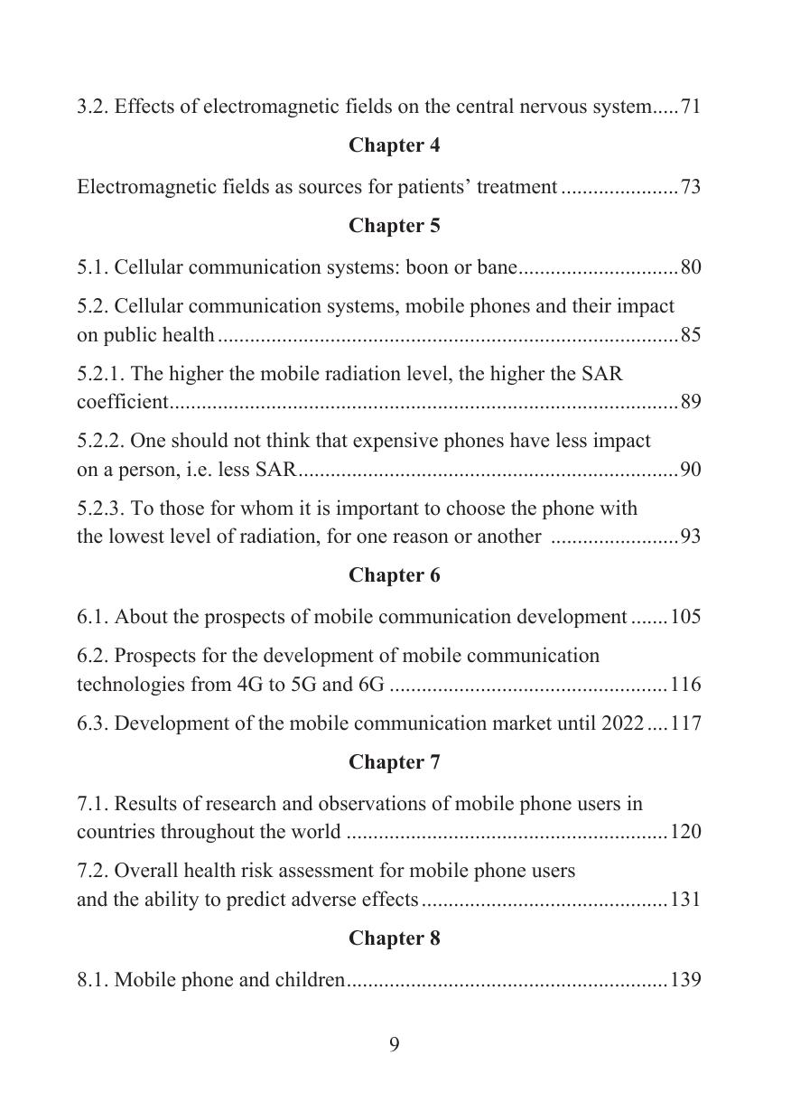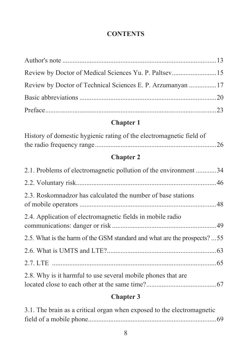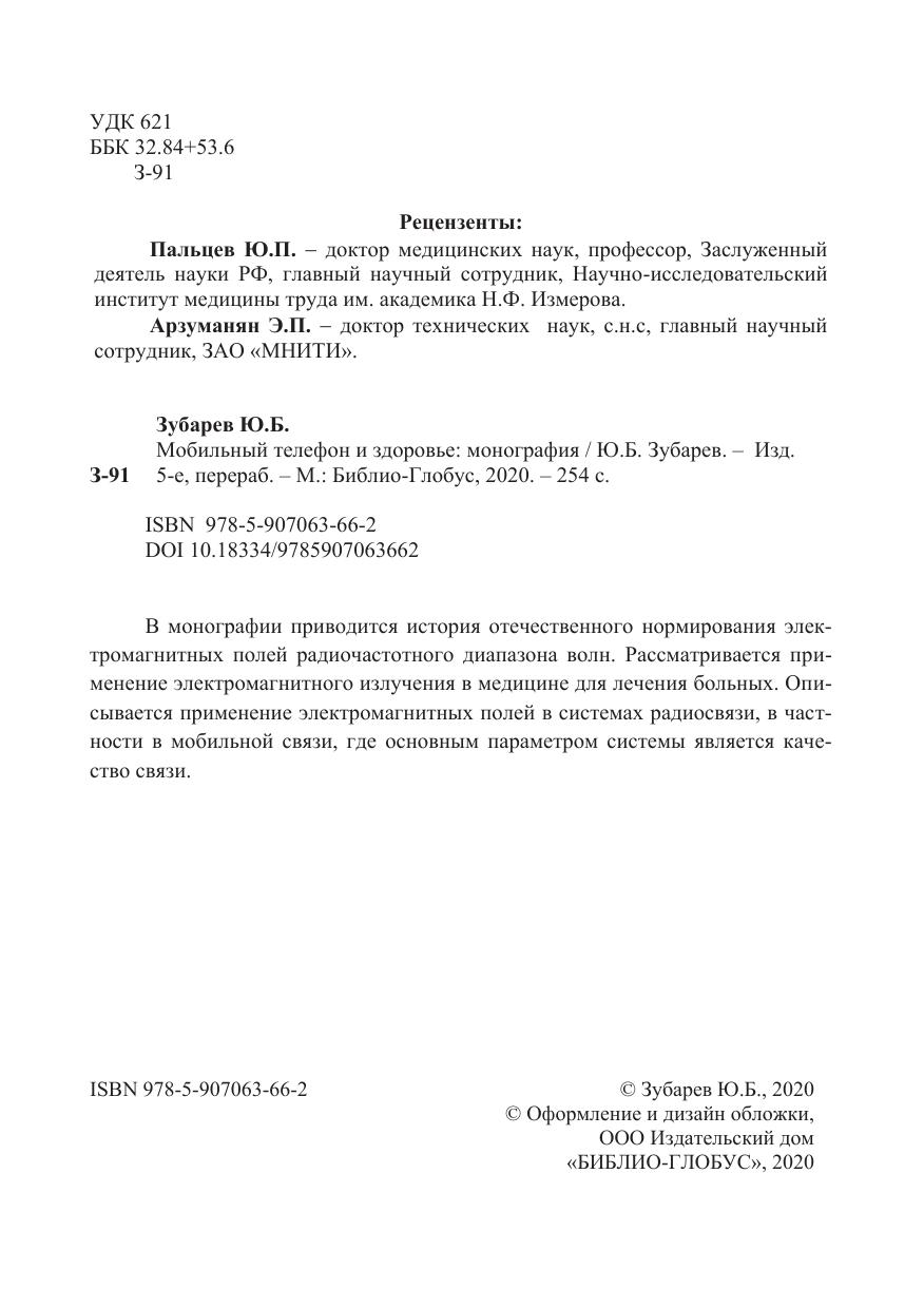 В монографии приводится история отечественного нормирования электромагнитных полей радиочастотного диапазона волн. Рассматривается применение электромагнитного излучения в медицине для лечения больных. Описывается применение электромагнитных полей в системах радиосвязи, в частности в мобильной связи, где основным параметром системы является качество связи. Качество работы мобильной системы связи зависит от мощности излучаемого сигнала, что для организма человека является вредным явлением при длительном пользовании мобильным телефоном. В 5-ом издании дополнен и полностью переработан 9-й раздел. В нём приведены статистика заболеваемости раком мозга у россиян и факторы, провоцирующие эту болезнь, особенно у детей и подростков. Также приводятся мероприятия, направленные на снижения риска заболеваемости. В некоторых европейских странах на уровне государственного законодательства уже решаются вопросы о необходимости снижения мощности излучения передатчиков электромагнитных волн и о переходе на проводную связь в жилых, служебных, общественных помещениях и в общественном транспорте. Перечисленные мероприятия имеют здравую основу. Они должны служить ориентиром для мировой общественности и глобального пересмотра организации мобильной связи. В конце приводится проект памятки по пользованию мобильным телефоном, которая должна утверждаться Правительством Российской Федерации.