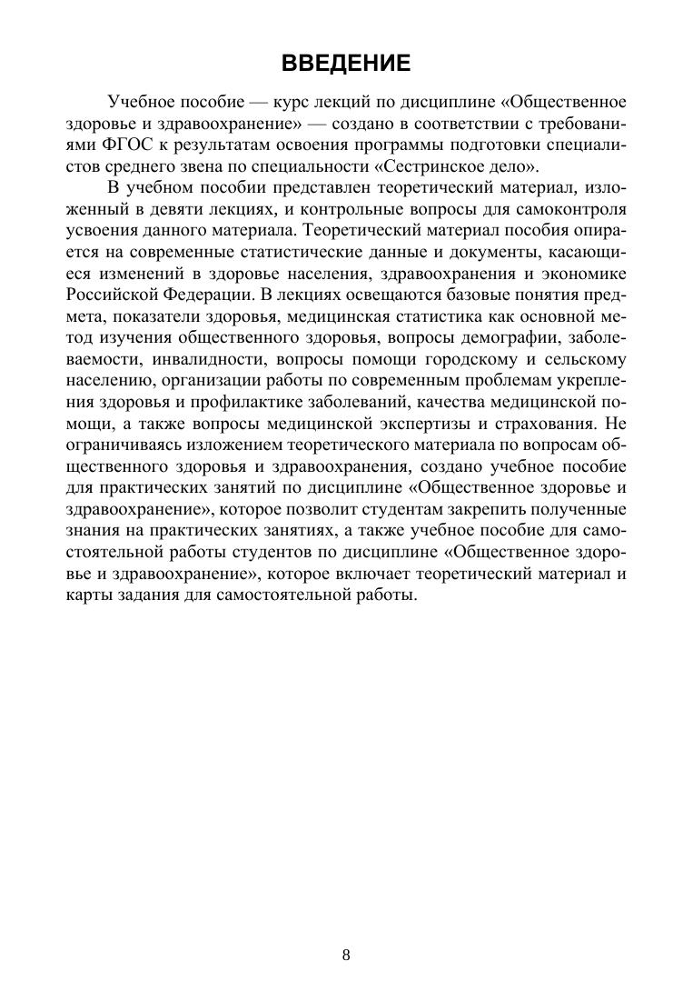 В учебном пособии представлен теоретический материал, изложенный в девяти лекциях, и контрольные вопросы для самоконтроля усвоения данного материала. Не ограничиваясь изложением теоретического материала по вопросам общественного здоровья и здравоохранения, был создан также практикум по дисциплине «Общественное здоровье и здравоохранение», который позволит студентам закрепить полученные знания, а также учебное пособие для самостоятельной работы студентов, которое включает теоретический материал и карты самостоятельной работы. Соответствует современным требованиям Федерального государственного образовательного стандарта среднего профессионального образования и профессиональным квалификационным требованиям.