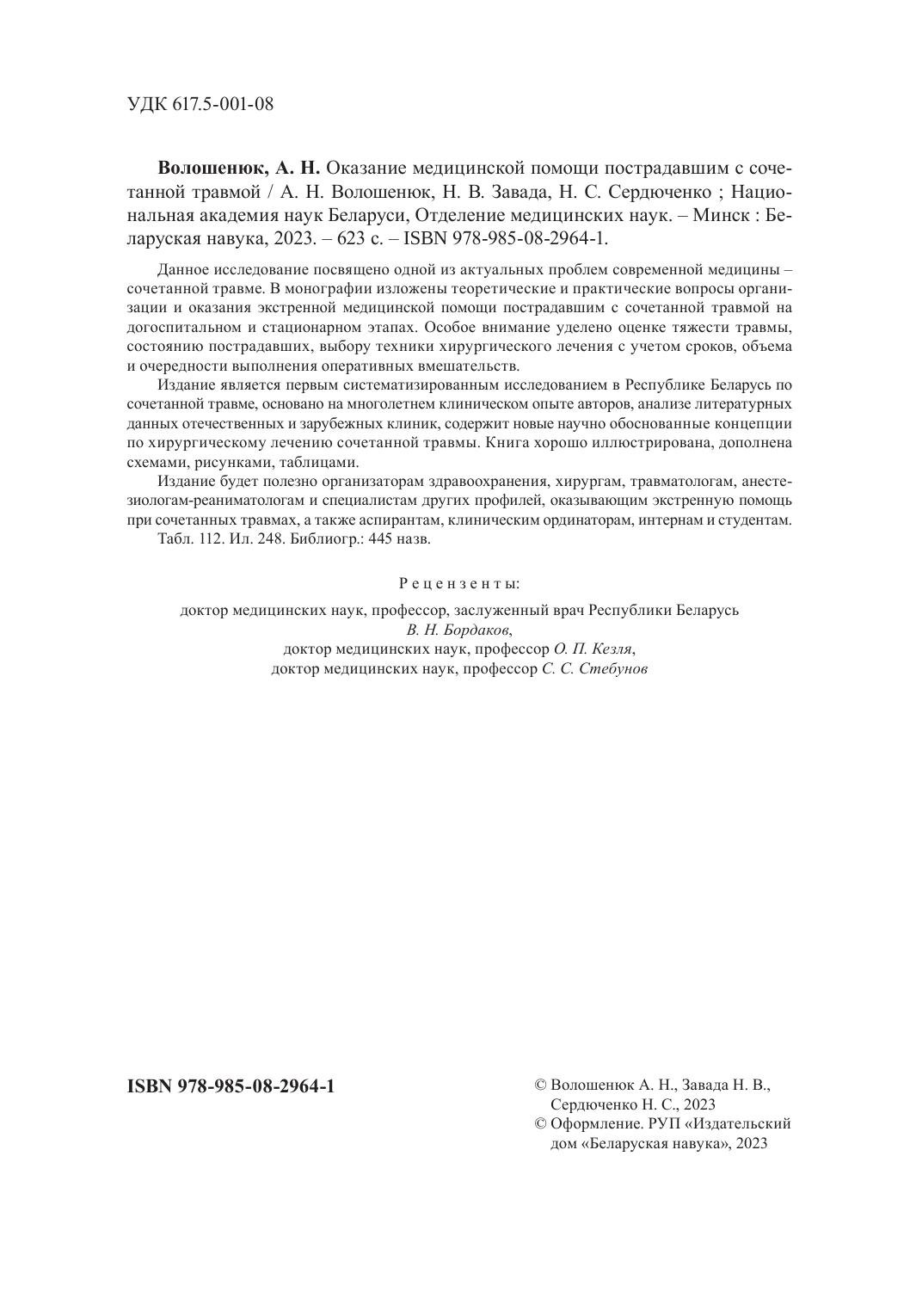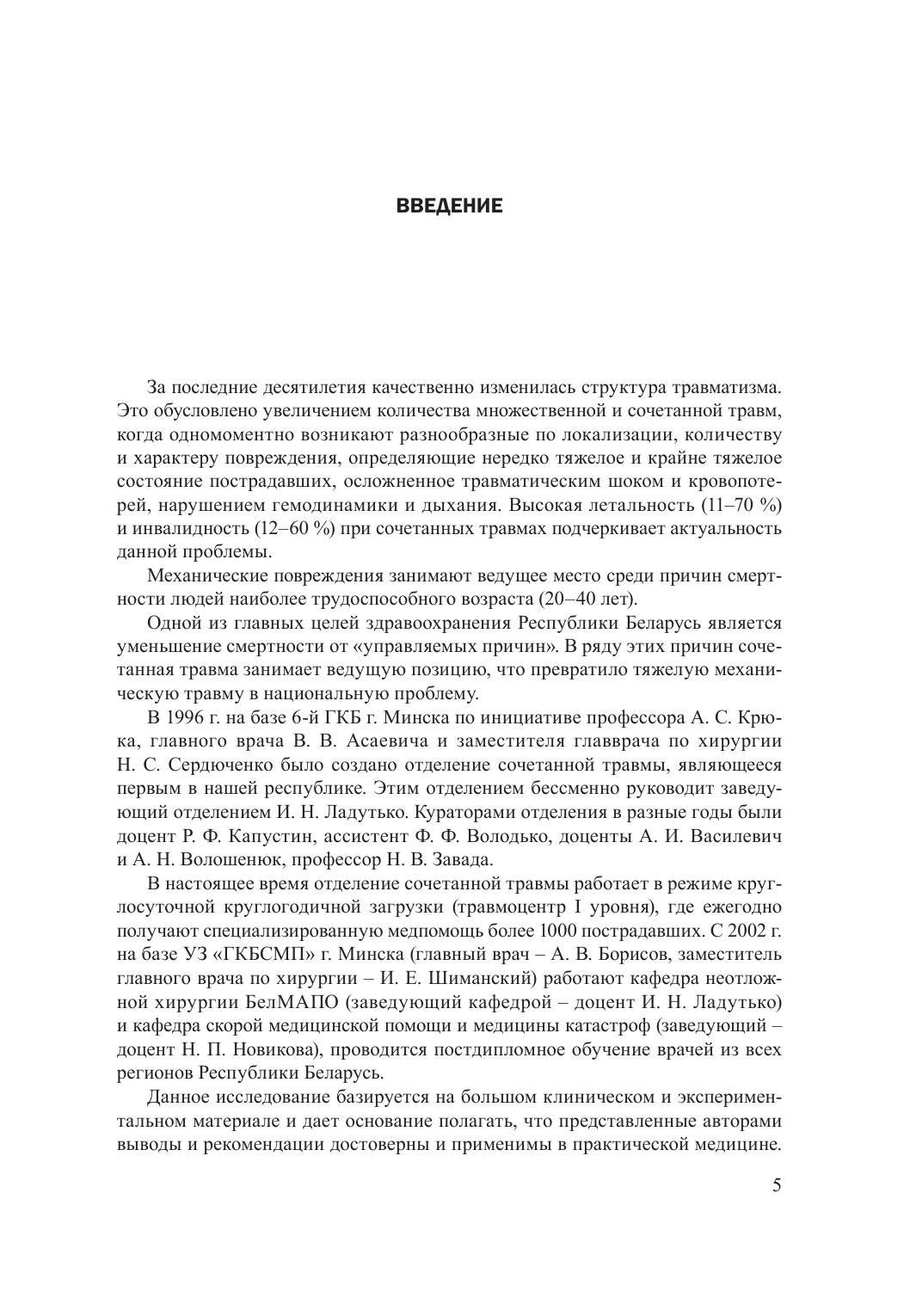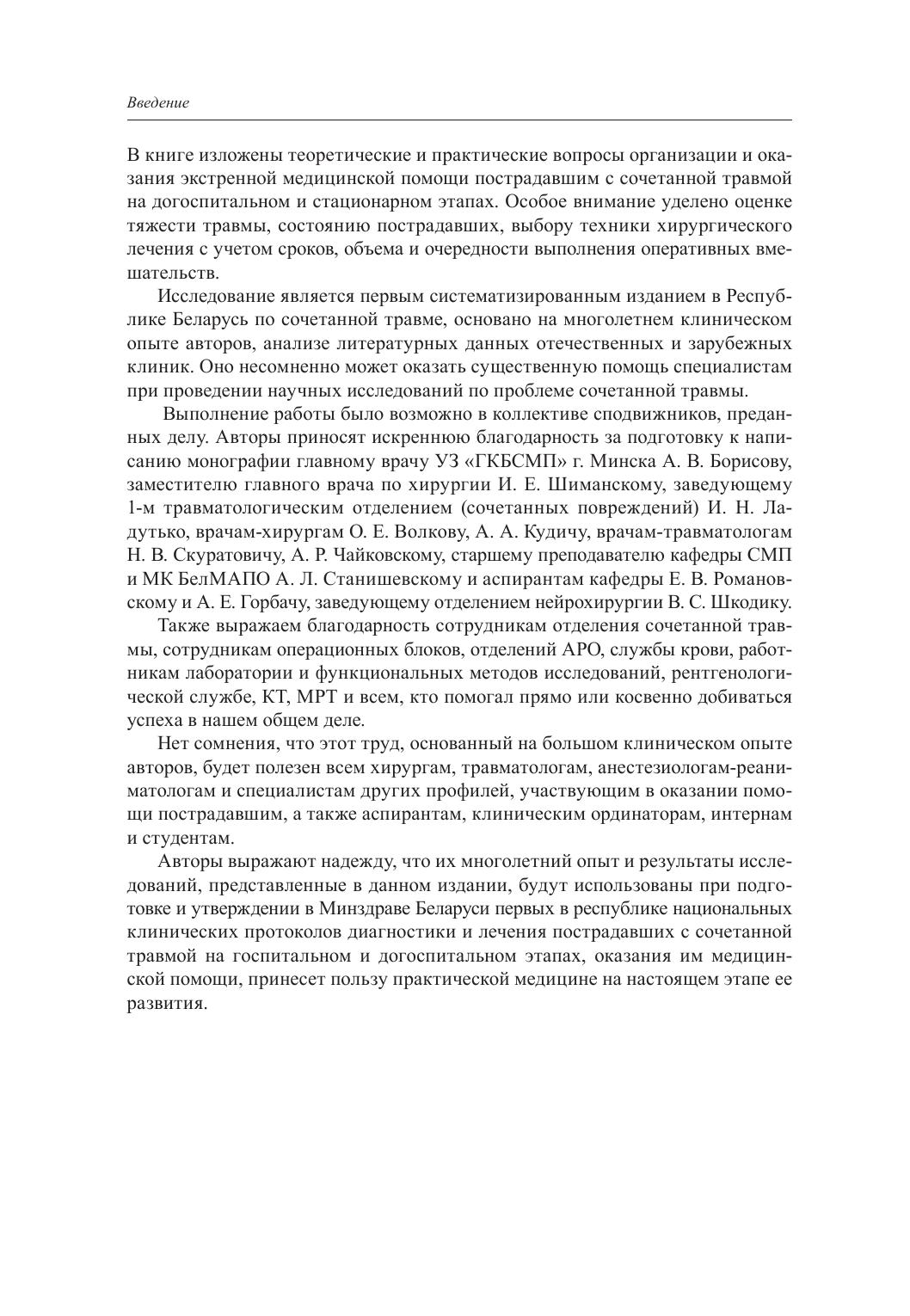 Данное исследование посвящено одной из актуальных проблем современной медицины – сочетанной травме. В монографии изложены теоретические и практические вопросы организации и оказания экстренной медицинской помощи пострадавшим с сочетанной травмой на догоспитальном и стационарном этапах. Особое внимание уделено оценке тяжести травмы, состоянию пострадавших, выбору техники хирургического лечения с учетом сроков, объема и очередности выполнения оперативных вмешательств. Издание является первым систематизированным исследованием в Республике Беларусь по сочетанной травме, основано на многолетнем клиническом опыте авторов, анализе литературных данных отечественных и зарубежных клиник, содержит новые научно обоснованные концепции по хирургическому лечению сочетанной травмы. Книга хорошо иллюстрирована, дополнена схемами, рисунками, таблицами. Издание будет полезно организаторам здравоохранения, хирургам, травматологам, анестезиологам-реаниматологам и специалистам других профилей, оказывающим экстренную помощь при сочетанных травмах, а также аспирантам, клиническим ординаторам, интернам и студентам.