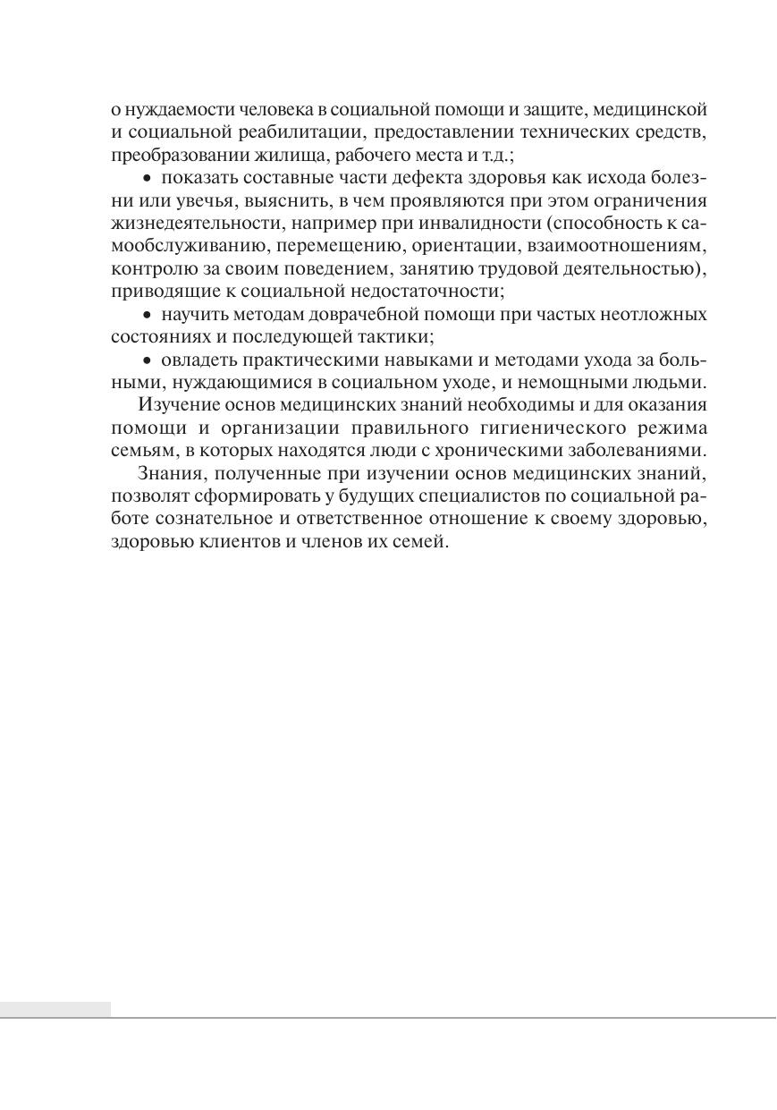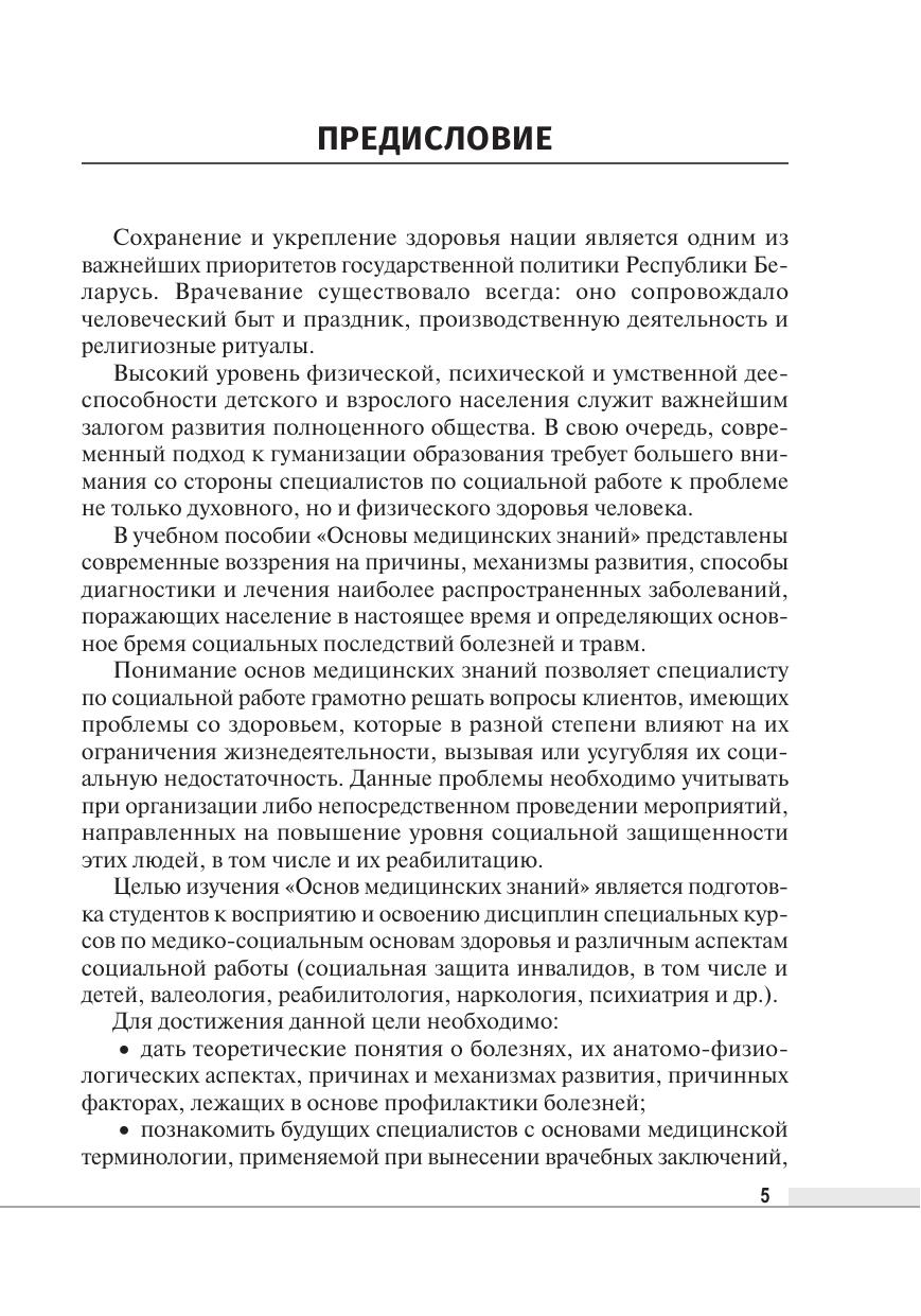 Рассмотрены ключевые вопросы, касающиеся наиболее важных сведений по основам медицинских знаний. Представлены термины и понятия, освещены общие и частные данные о болезнях органов и систем человеческого организма, изложены рекомендации по соблюдению здорового образа жизни. Для студентов учреждений высшего образования, обучающихся по специальности «Социальная работа», специалистов социальной сферы с целью повышения квалификации, а также для широкого круга читателей, работающих в системе «человек – человек».