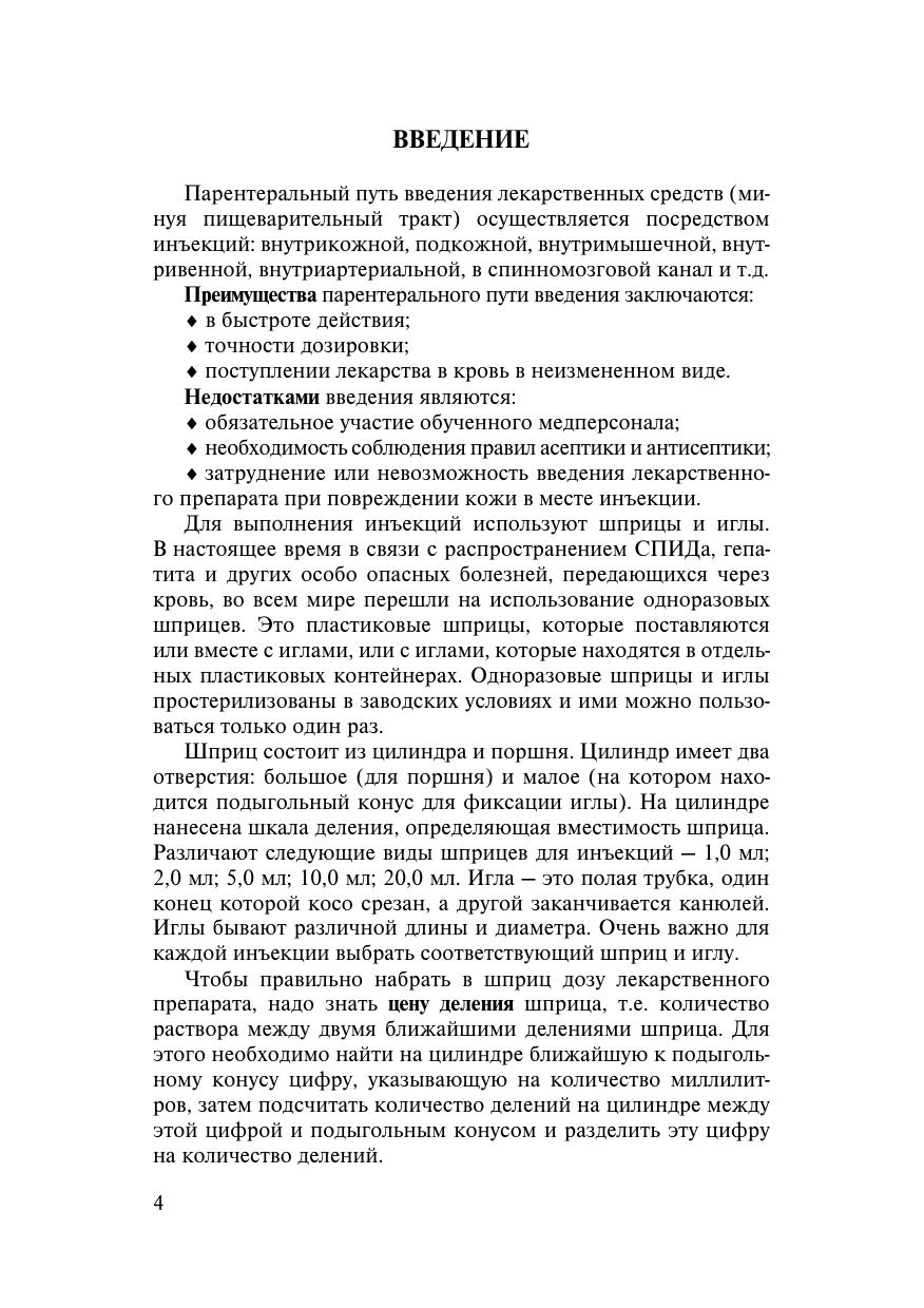 Изложены алгоритмы выполнения инъекций: приготовление рабочего места и рук, наполнение шприца лекарственным средством, техника выполнения инъекций. Рассмотрены осложнения при инъекциях, забор крови из вены, внутривенное введение жидкости, постановка периферического катетера. Для учащихся ССУЗов медицинского профиля, практических работников.