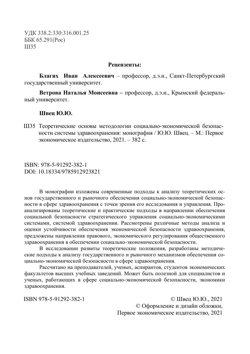 Рассчитано на преподавателей, ученых, аспирантов, студентов экономических факультетов высших учебных заведений. Может быть полезной для специалистов и ученых, работающих в сфере социально-экономической безопасности, экономики здравоохранения.