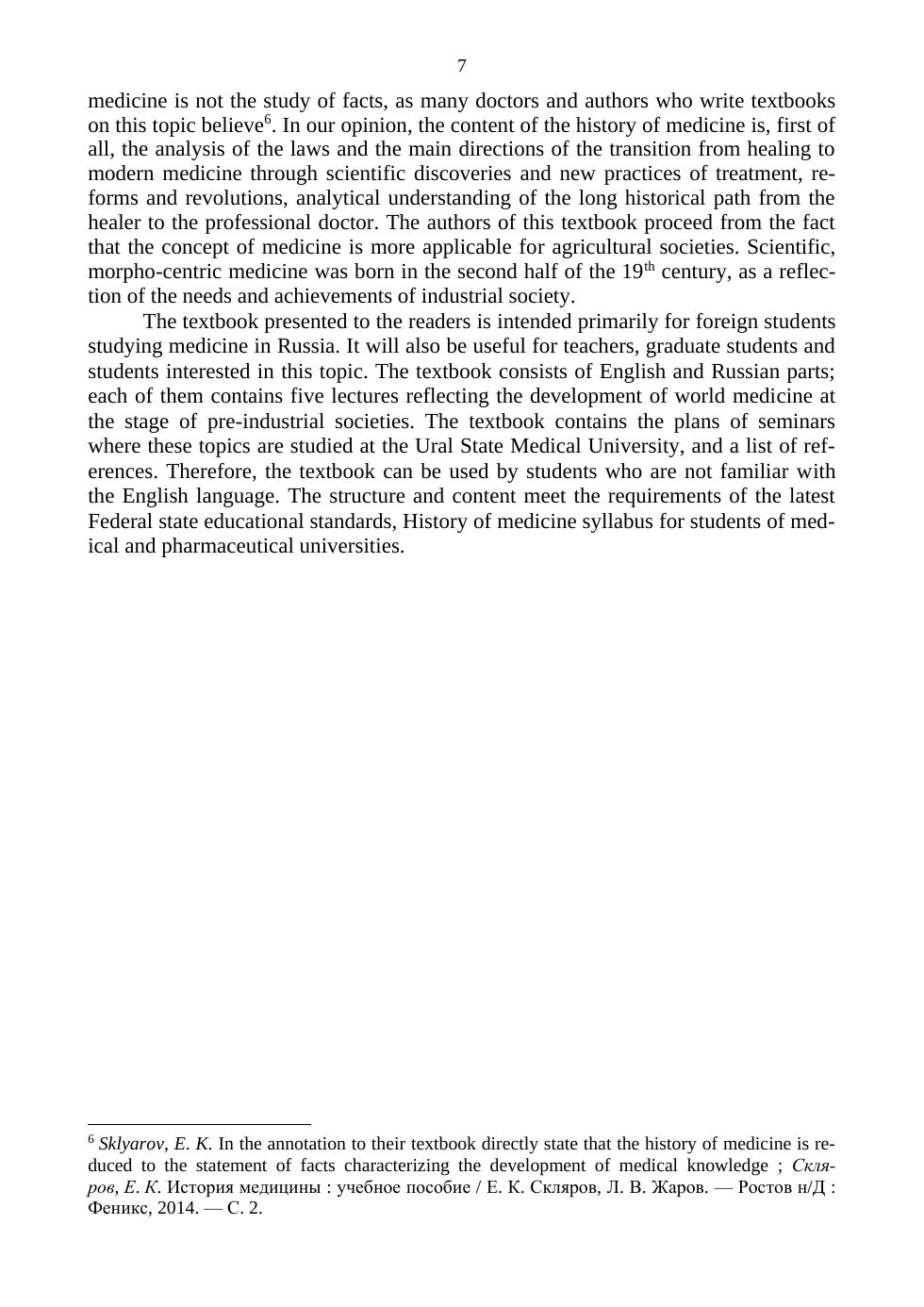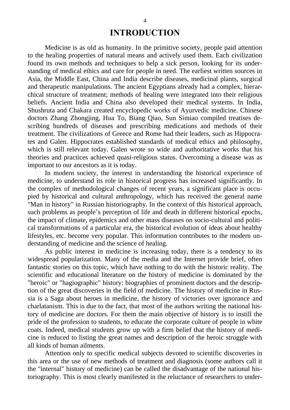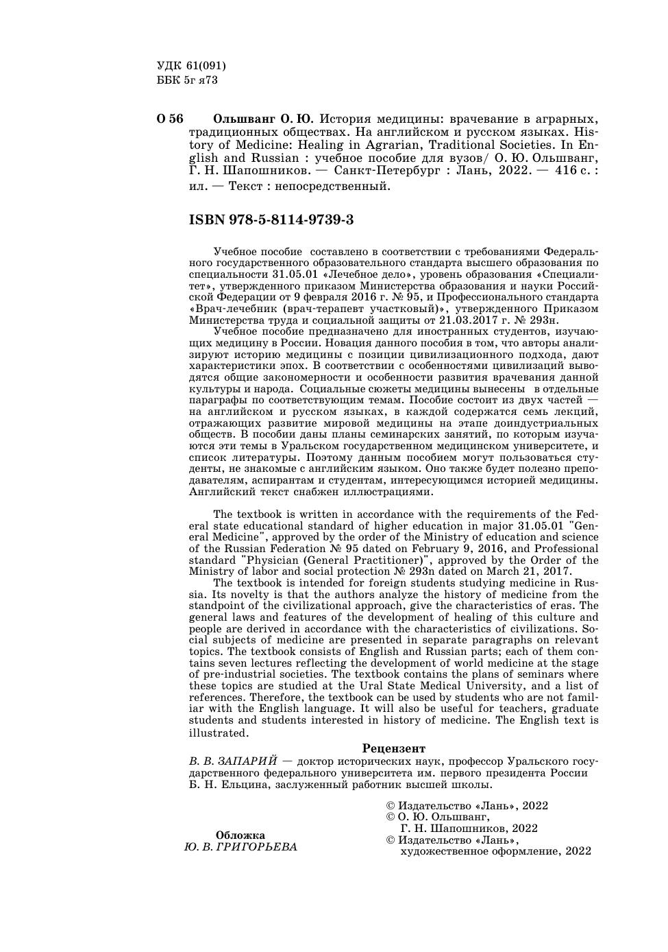 Учебное пособие составлено в соответствии с требованиями Федерального государственного образовательного стандарта высшего образования по специальности 31.05.01 «Лечебное дело», уровень образования «Специалитет», утвержденного приказом Министерства образования и науки Российской Федерации от 9 февраля 2016 г. № 95 и Профессионального стандарта «Врач-лечебник (врач-терапевт участковый)», утвержденного Приказом Министерства труда и социальной защиты от 21.03.2017 г. № 293н. Учебное пособие предназначено для иностранных студентов, изучающих медицину в России. Новация данного пособия в том, что авторы анализируют историю медицины с позиции цивилизационного подхода, дают характеристики эпох. В соответствии с особенностями цивилизаций, выводятся общие закономерности и особенности развития врачевания данной культуры и народа. Социальные сюжеты медицины вынесены в отдельные параграфы по соответствующим темам. Пособие состоит из двух частей - на английском и русском языках, в каждой содержатся семь лекций, отражающих развитие мировой медицины на этапе доиндустриальных обществ. В пособии даны планы семинарских занятий, по которым изучается эти темы в Уральской государственном медицинском университете, и список литературы. Поэтому данным пособием могут пользоваться студенты, не знакомые с английским языком. Оно также будет полезно преподавателям, аспирантам и студентам, интересующихся этой историей медицины. Английский текст снабжен иллюстрациями. The textbook is written in accordance with the requirements of the Federal state educational standard of higher education in major 31.05.01 "General Medicine", approved by the order of the Ministry of education and science of the Russian Federation № 95 dated on February 9, 2016 and Professional standard "Physician (General Practitioner)", approved by the Order of the Ministry of labor and social protection № 293n dated on March 21, 2017. The textbook is intended for foreign students studying medicine in Russia. Its novelty is that the authors analyze the history of medicine from the standpoint of the civilizational approach, give the characteristics of eras. The general laws and features of the development of healing of this culture and people are derived in accordance with the characteristics of civilizations. Social subjects of medicine are presented in separate paragraphs on relevant topics. The textbook consists of English and Russian parts, each of them contains seven lectures reflecting the development of world medicine at the stage of pre-industrial societies. The textbook contains the plans of seminars where these topics are studied at the Ural State Medical University, and a list of references. Therefore, the textbook can be used by students who are not familiar with the English language. It will also be useful for teachers, graduate students and students interested in history of medicine. The English text is illustrated.
