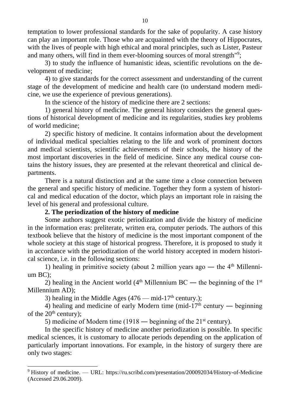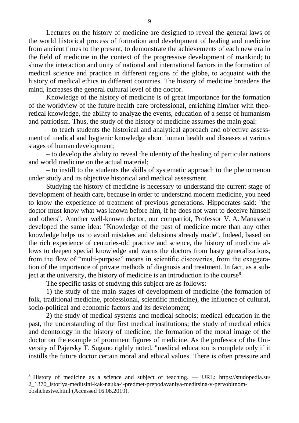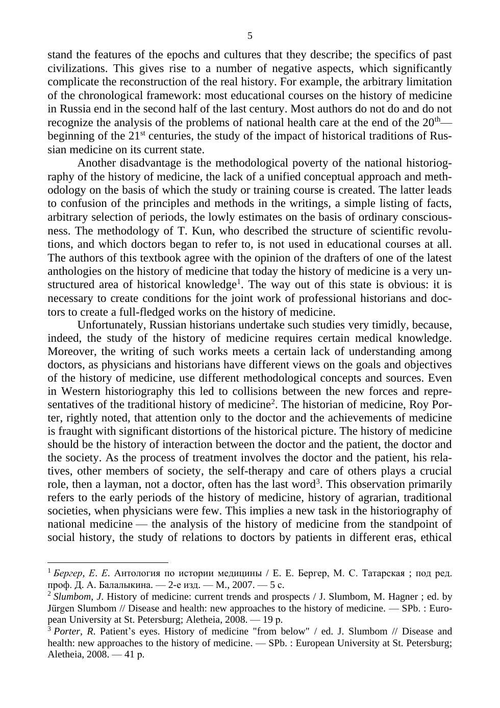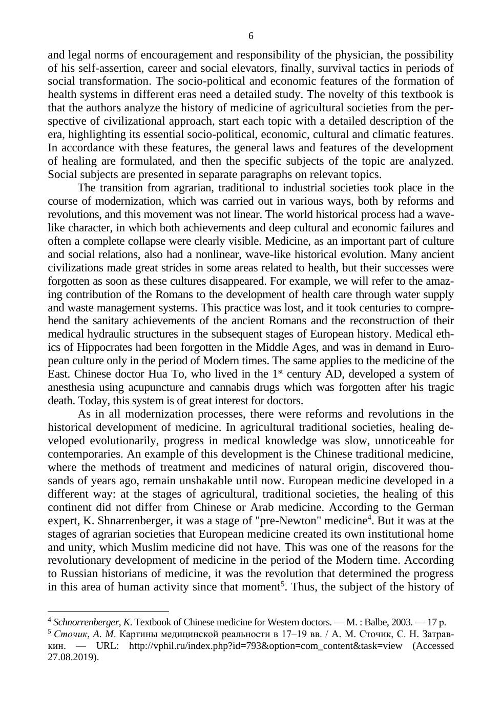 Учебное пособие составлено в соответствии с требованиями Федерального государственного образовательного стандарта высшего образования по специальности 31.05.01 «Лечебное дело», уровень образования «Специалитет», утвержденного приказом Министерства образования и науки Российской Федерации от 9 февраля 2016 г. № 95 и Профессионального стандарта «Врач-лечебник (врач-терапевт участковый)», утвержденного Приказом Министерства труда и социальной защиты от 21.03.2017 г. № 293н. Учебное пособие предназначено для иностранных студентов, изучающих медицину в России. Новация данного пособия в том, что авторы анализируют историю медицины с позиции цивилизационного подхода, дают характеристики эпох. В соответствии с особенностями цивилизаций, выводятся общие закономерности и особенности развития врачевания данной культуры и народа. Социальные сюжеты медицины вынесены в отдельные параграфы по соответствующим темам. Пособие состоит из двух частей - на английском и русском языках, в каждой содержатся семь лекций, отражающих развитие мировой медицины на этапе доиндустриальных обществ. В пособии даны планы семинарских занятий, по которым изучается эти темы в Уральской государственном медицинском университете, и список литературы. Поэтому данным пособием могут пользоваться студенты, не знакомые с английским языком. Оно также будет полезно преподавателям, аспирантам и студентам, интересующихся этой историей медицины. Английский текст снабжен иллюстрациями. The textbook is written in accordance with the requirements of the Federal state educational standard of higher education in major 31.05.01 "General Medicine", approved by the order of the Ministry of education and science of the Russian Federation № 95 dated on February 9, 2016 and Professional standard "Physician (General Practitioner)", approved by the Order of the Ministry of labor and social protection № 293n dated on March 21, 2017. The textbook is intended for foreign students studying medicine in Russia. Its novelty is that the authors analyze the history of medicine from the standpoint of the civilizational approach, give the characteristics of eras. The general laws and features of the development of healing of this culture and people are derived in accordance with the characteristics of civilizations. Social subjects of medicine are presented in separate paragraphs on relevant topics. The textbook consists of English and Russian parts, each of them contains seven lectures reflecting the development of world medicine at the stage of pre-industrial societies. The textbook contains the plans of seminars where these topics are studied at the Ural State Medical University, and a list of references. Therefore, the textbook can be used by students who are not familiar with the English language. It will also be useful for teachers, graduate students and students interested in history of medicine. The English text is illustrated.