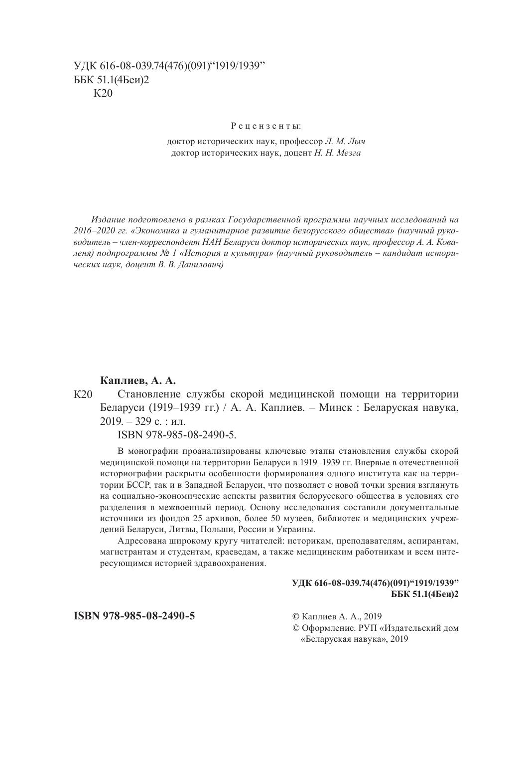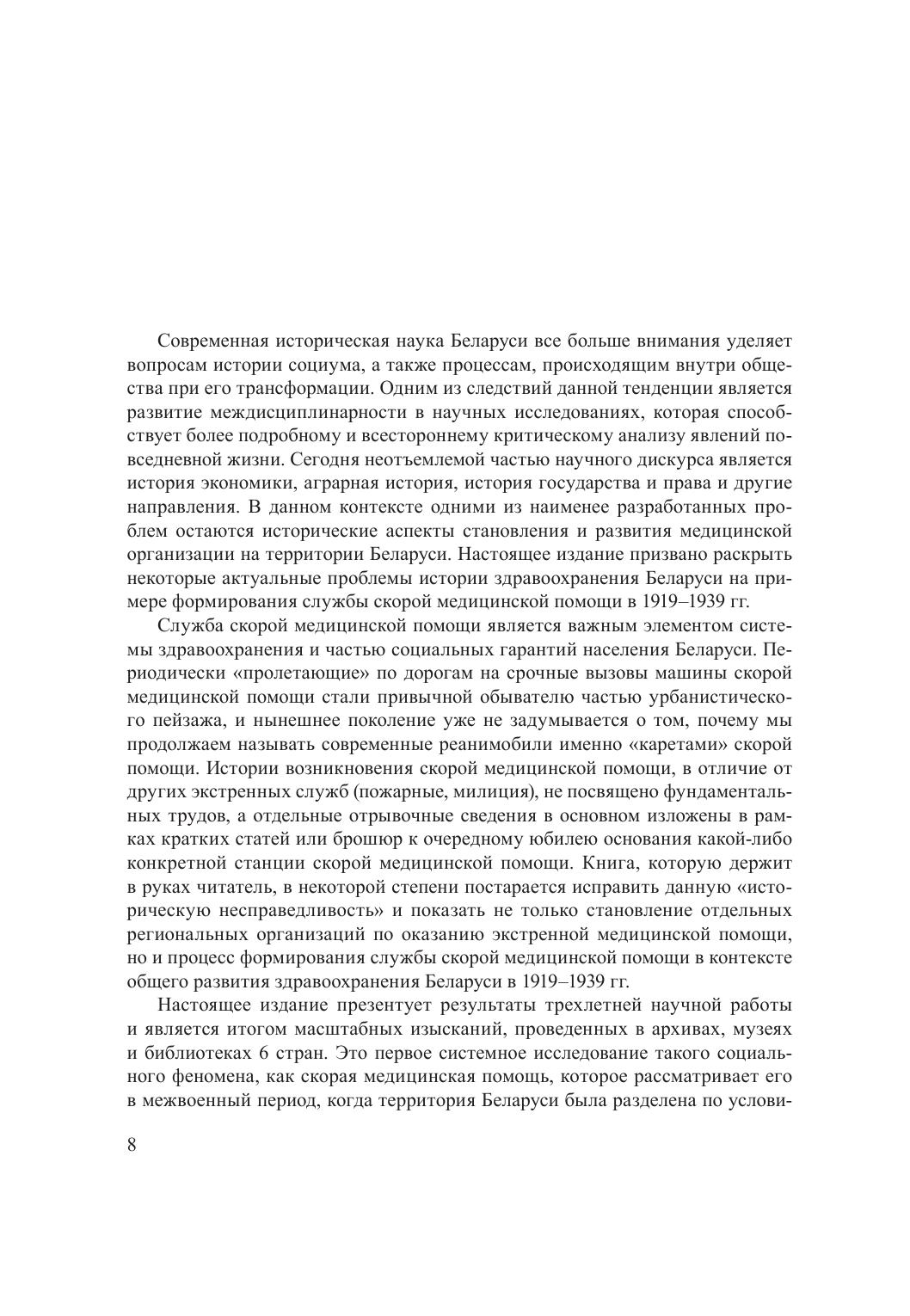 В монографии проанализированы ключевые этапы становления службы скорой медицинской помощи на территории Беларуси в 1919–1939 гг. Впервые в отечественной историографии раскрыты особенности формирования одного института как на территории БССР, так и в Западной Беларуси, что позволяет с новой точки зрения взглянуть на социально-экономические аспекты развития белорусского общества в условиях его разделения в межвоенный период. Основу исследования составили документальные источники из фондов 25 архивов, более 50 музеев, библиотек и медицинских учреждений Беларуси, Литвы, Польши, России и Украины. Адресована широкому кругу читателей: историкам, преподавателям, аспирантам, магистрантам и студентам, краеведам, а также медицинским работникам и всем интересующимся историей здравоохранения.