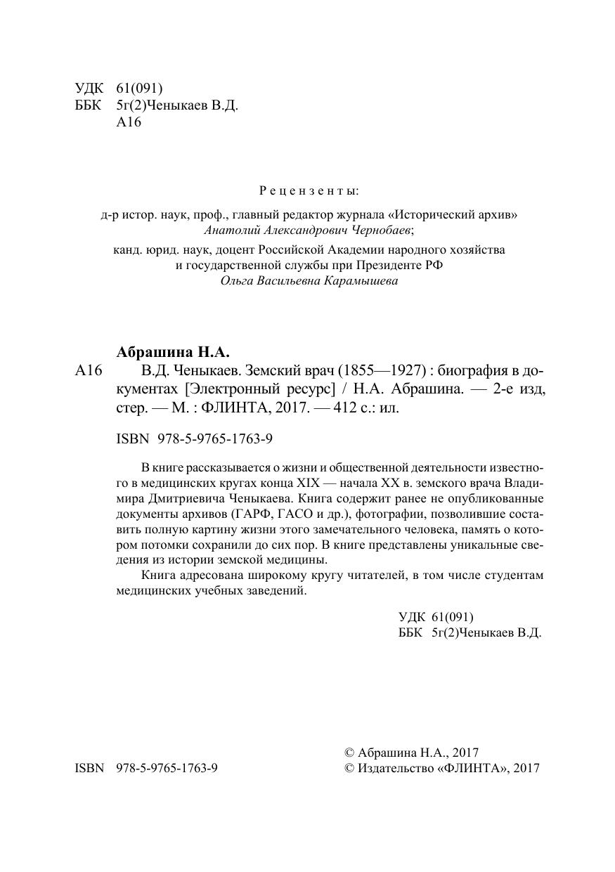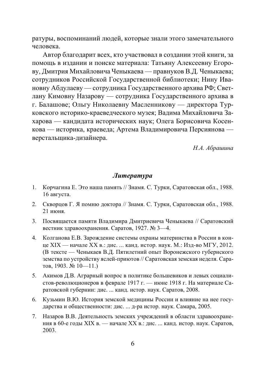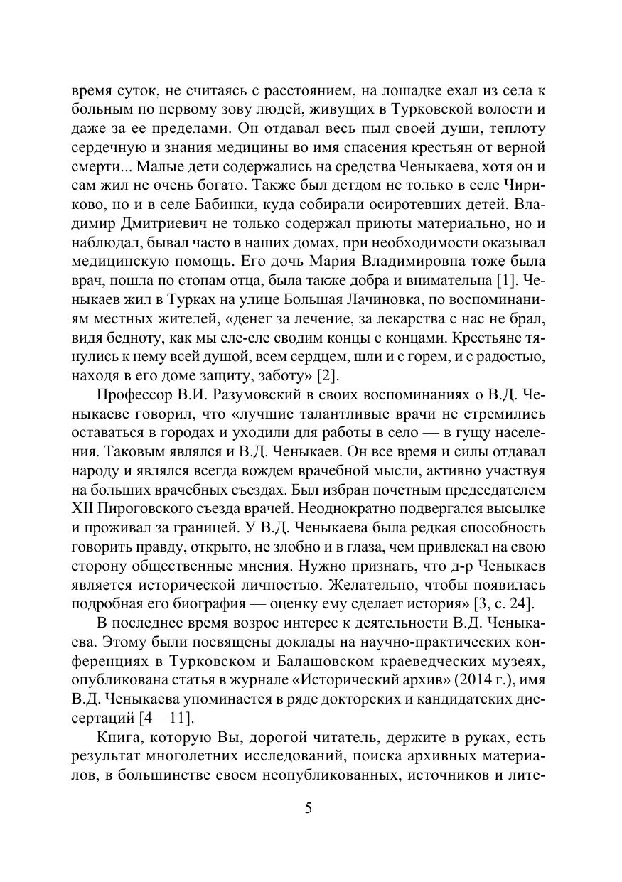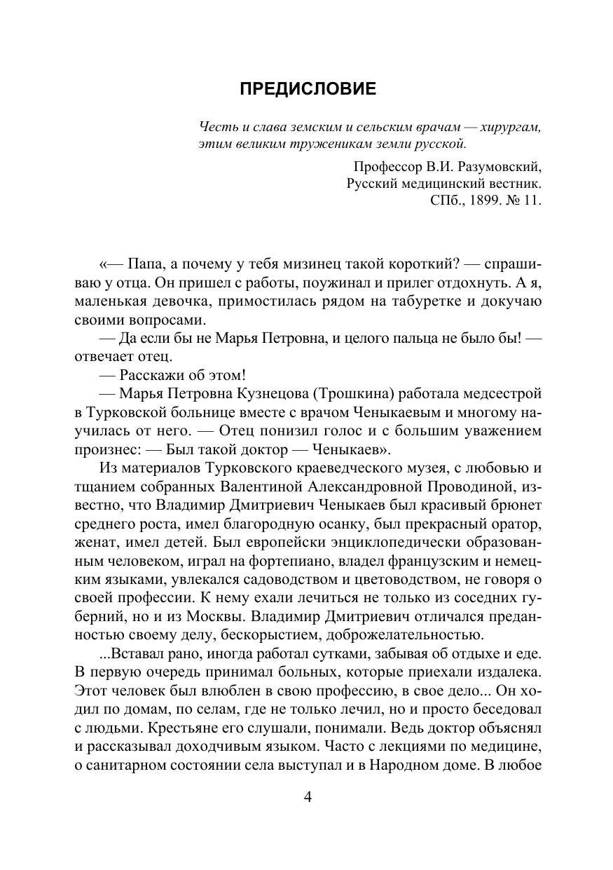 В книге рассказывается о жизни и общественной деятельности известного в медицинских кругах конца XIX — начала XX в. земского врача Владимира Дмитриевича Ченыкаева. Книга содержит ранее не опубликованные документы архивов (ГАРФ, ГАСО и др.), фотографии, позволившие составить полную картину жизни этого замечательного человека, память о котором потомки сохранили до сих пор. В книге представлены уникальные сведения из истории земской медицины.