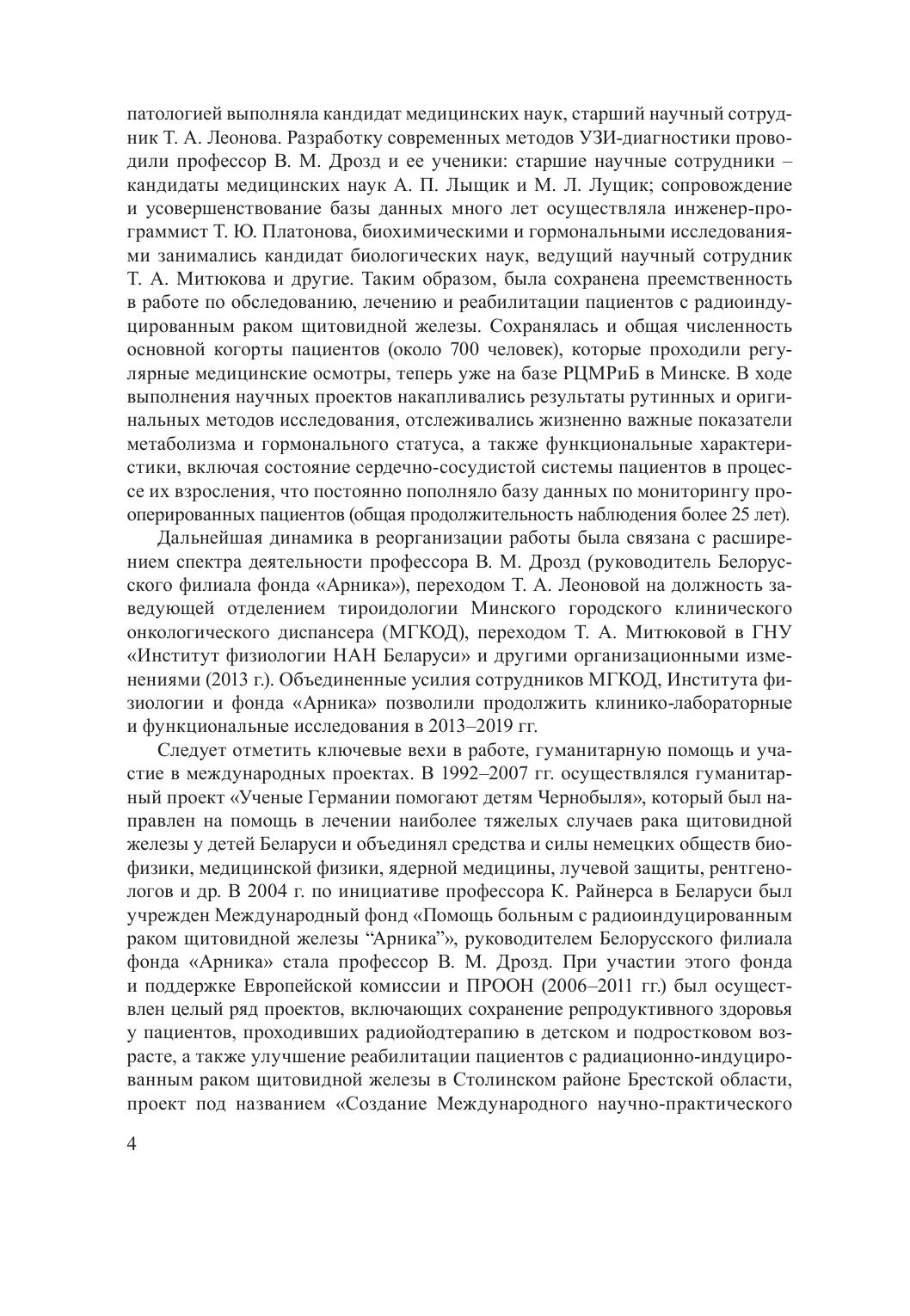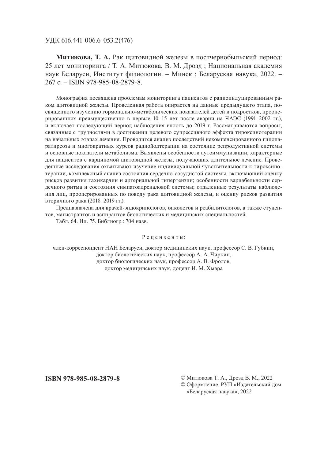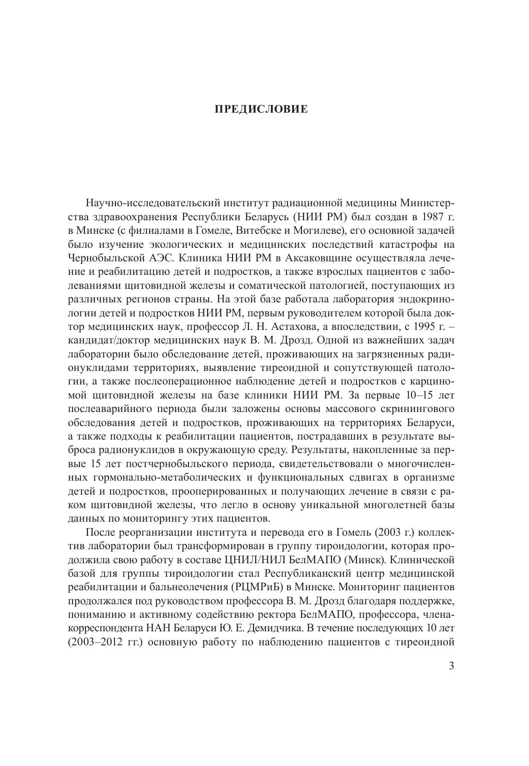 Монография посвящена проблемам мониторинга пациентов с радиоиндуцированным раком щитовидной железы. Проведенная работа опирается на данные предыдущего этапа, посвященного изучению гормонально-метаболических показателей детей и подростков, прооперированных преимущественно в первые 10–15 лет после аварии на ЧАЭС (1991–2002 гг.), и включает последующий период наблюдения вплоть до 2019 г. Рассматриваются вопросы, связанные с трудностями в достижении целевого супрессивного эффекта тироксинотерапии на начальных этапах лечения. Проводится анализ последствий некомпенсированного гипопаратиреоза и многократных курсов радиойодтерапии на состояние репродуктивной системы и основные показатели метаболизма. Выявлены особенности аутоиммунизации, характерные для пациентов с карциномой щитовидной железы, получающих длительное лечение. Проведенные исследования охватывают изучение индивидуальной чувствительности к тироксинотерапии, комплексный анализ состояния сердечно-сосудистой системы, включающий оценку рисков развития тахикардии и артериальной гипертензии; особенности вариабельности сердечного ритма и состояния симпатоадреналовой системы; отдаленные результаты наблюдения лиц, прооперированных по поводу рака щитовидной железы, и оценку рисков развития вторичного рака (2018–2019 гг.).