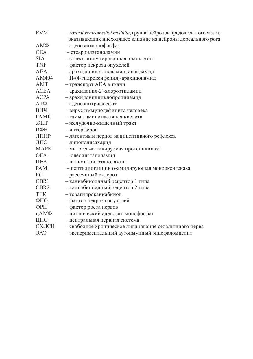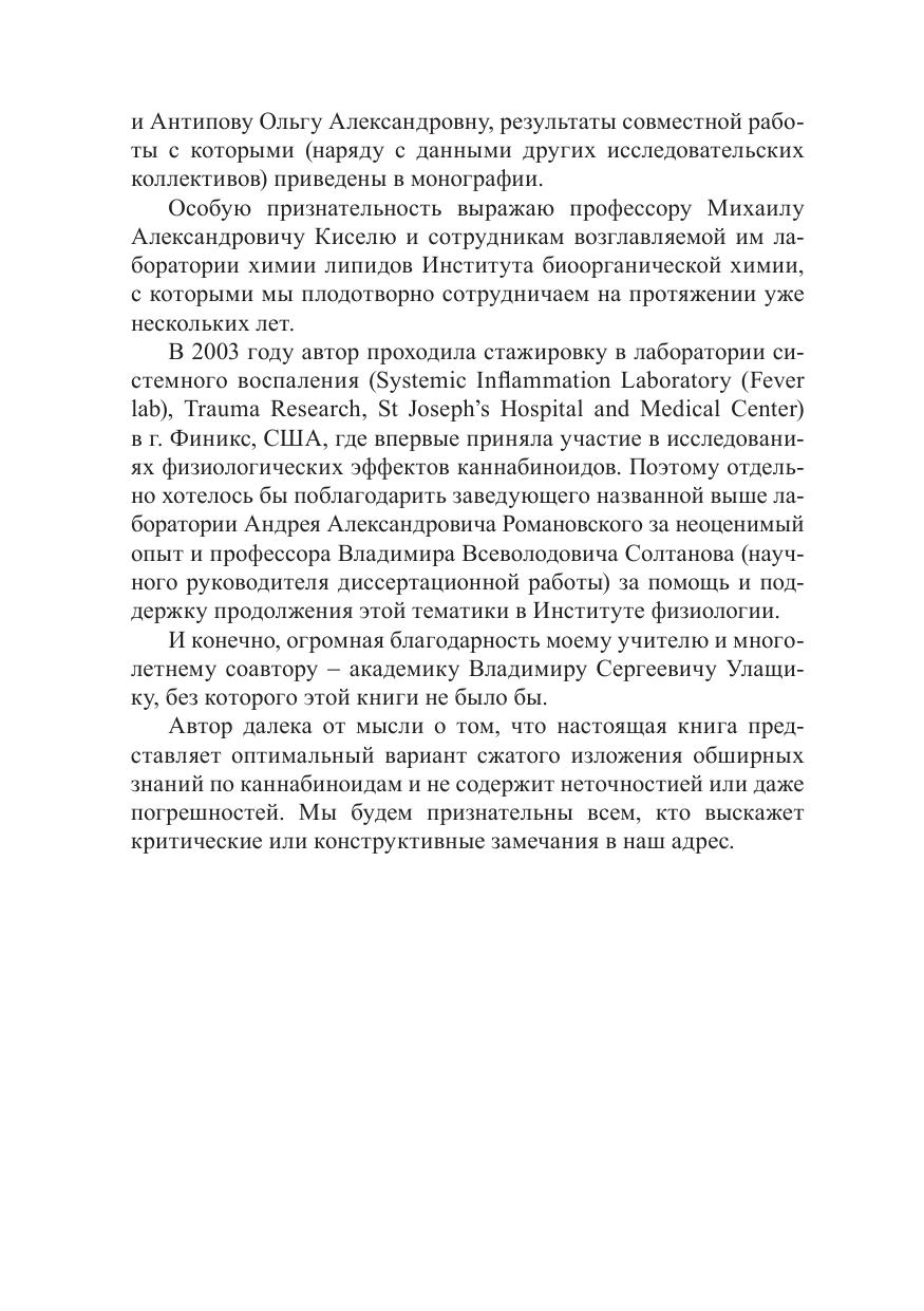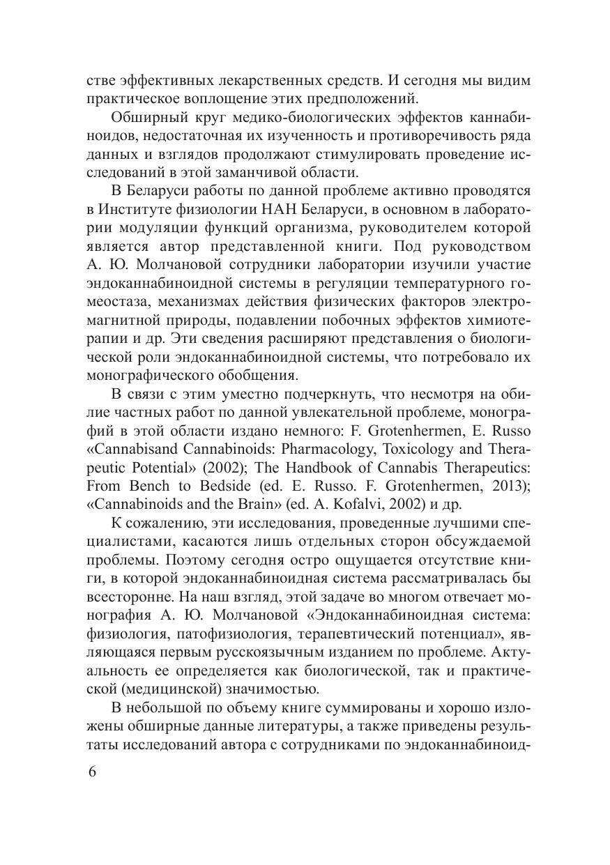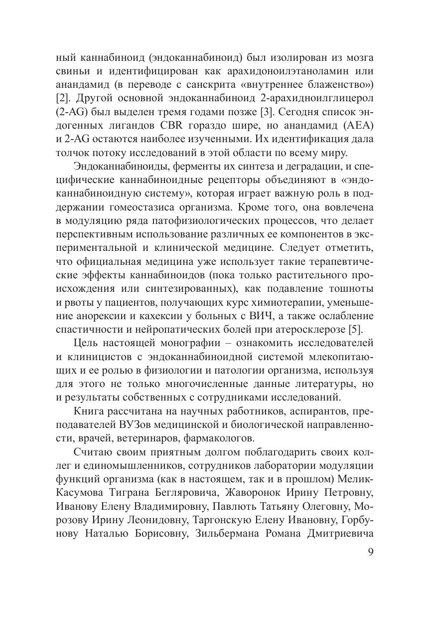 В монографии рассмотрены физиологические эффекты фито-, синтетических и эндогенных каннабиноидов. Приводятся сведения о специфических каннабиноидных рецепторах, их эндогенных лигандах, ферментах синтеза и деградации. Обобщены результаты экспериментальных исследований (включая данные, полученные автором) о роли эндоканнабиноидной системы как в под держании гомеостазиса организма, так и в развитии патологических состояний (воспалительные процессы, болевые синдромы, аутоиммунные реакции). Уделено внимание биологическому действию N-ацилэтаноламинов, обладающих каннабимиметическим действием. Обсуждены перспективы клинического применения препаратов на основе каннабиноидов и каннабимиметиков. Предназначена для научных работников, аспирантов, преподавателей вузов медицинской и биологической направленности, врачей, фармакологов.