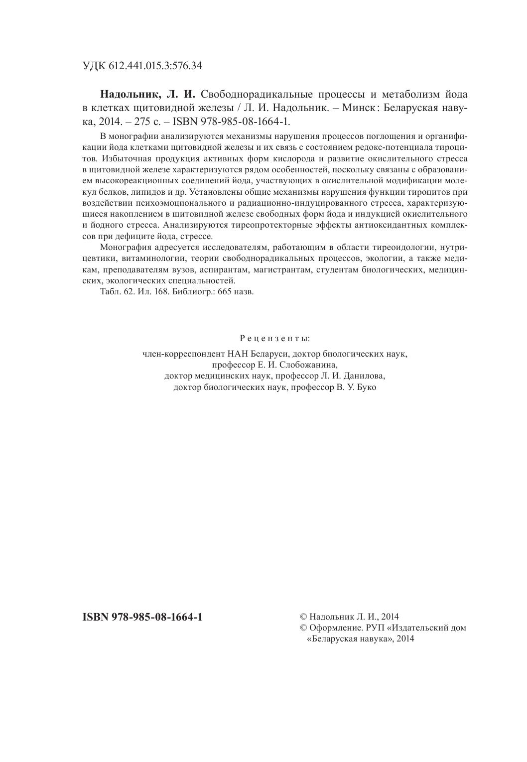 В монографии анализируются механизмы нарушения процессов поглощения и органификации йода клетками щитовидной железы и их связь с состоянием редокс-потенциала тироцитов. Избыточная продукция активных форм кислорода и развитие окислительного стресса в щитовидной железе характеризуются рядом особенностей, поскольку связаны с образованием высокореакционных соединений йода, участвующих в окислительной модификации молекул белков, липидов и др. Установлены общие механизмы нарушения функции тироцитов при воздействии психоэмоционального и радиационно-индуцированного стресса, характеризующиеся накоплением в щитовидной железе свободных форм йода и индукцией окислительного и йодного стресса. Анализируются тиреопротекторные эффекты антиоксидантных комплексов при дефиците йода, стрессе. Монография адресуется исследователям, работающим в области тиреоидологии, нутрицевтики, витаминологии, теории свободнорадикальных процессов, экологии, а также медикам, преподавателям вузов, аспирантам, магистрантам, студентам биологических, медицинских, экологических специальностей.