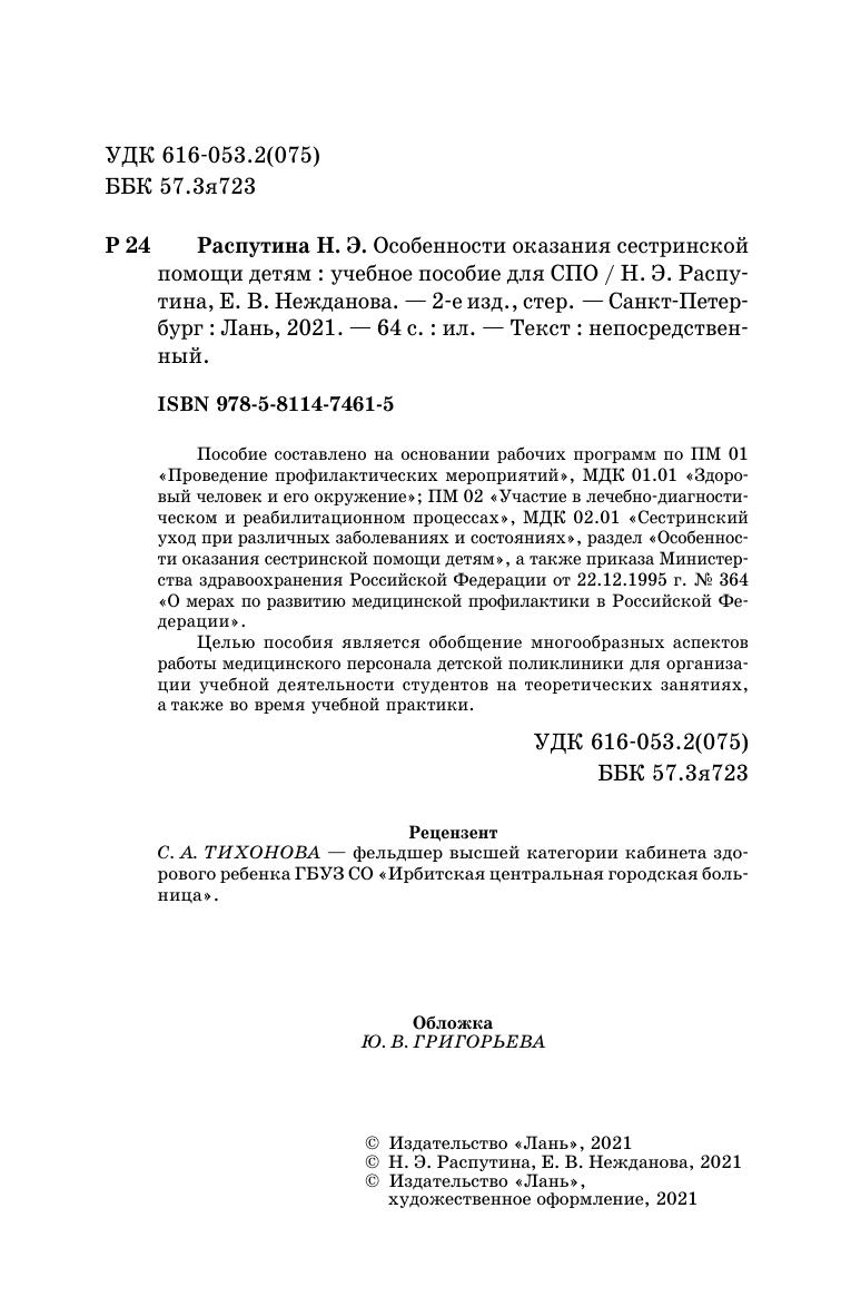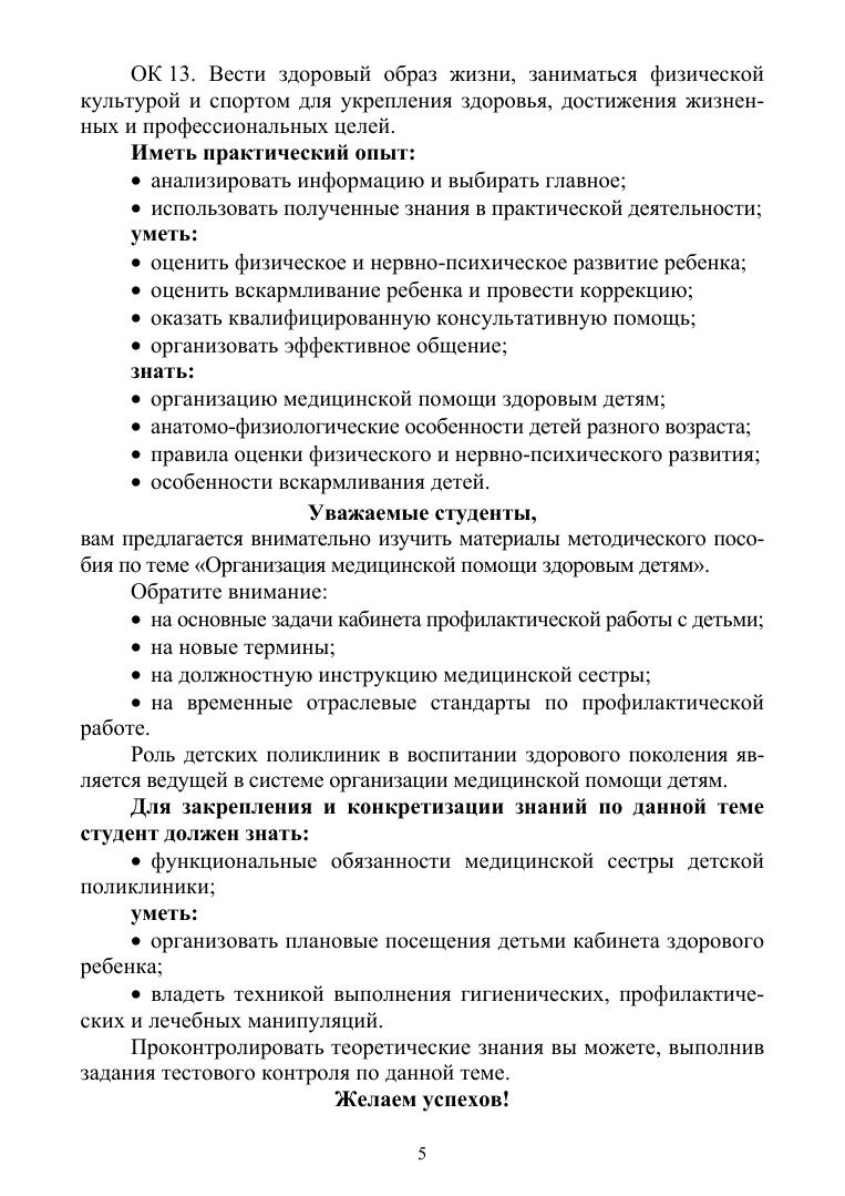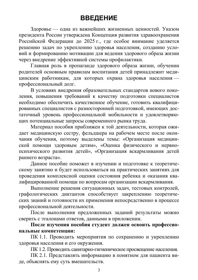 Пособие составлено на основании рабочих программ по ПМ 01 «Проведение профилактических мероприятий», МДК 01.01 «Здоровый человек и его окружение»; ПМ 02 «Участие в лечебно-диагностическом и реабилитационном процессах», МДК 02.01 «Сестринский уход при различных заболеваниях и состояниях», раздел «Особенности оказания сестринской помощи детям», а также приказа Министерства здравоохранения Российской Федерации от 22.12.1995 г. № 364 «О мерах по развитию медицинской профилактики в Российской Федерации». Целью пособия является обобщение многообразных аспектов работы медицинского персонала детской поликлиники для организации учебной деятельности студентов на теоретических занятиях, а также во время учебной практики.