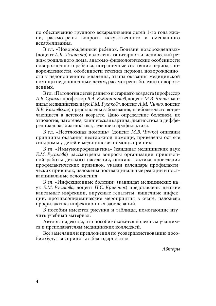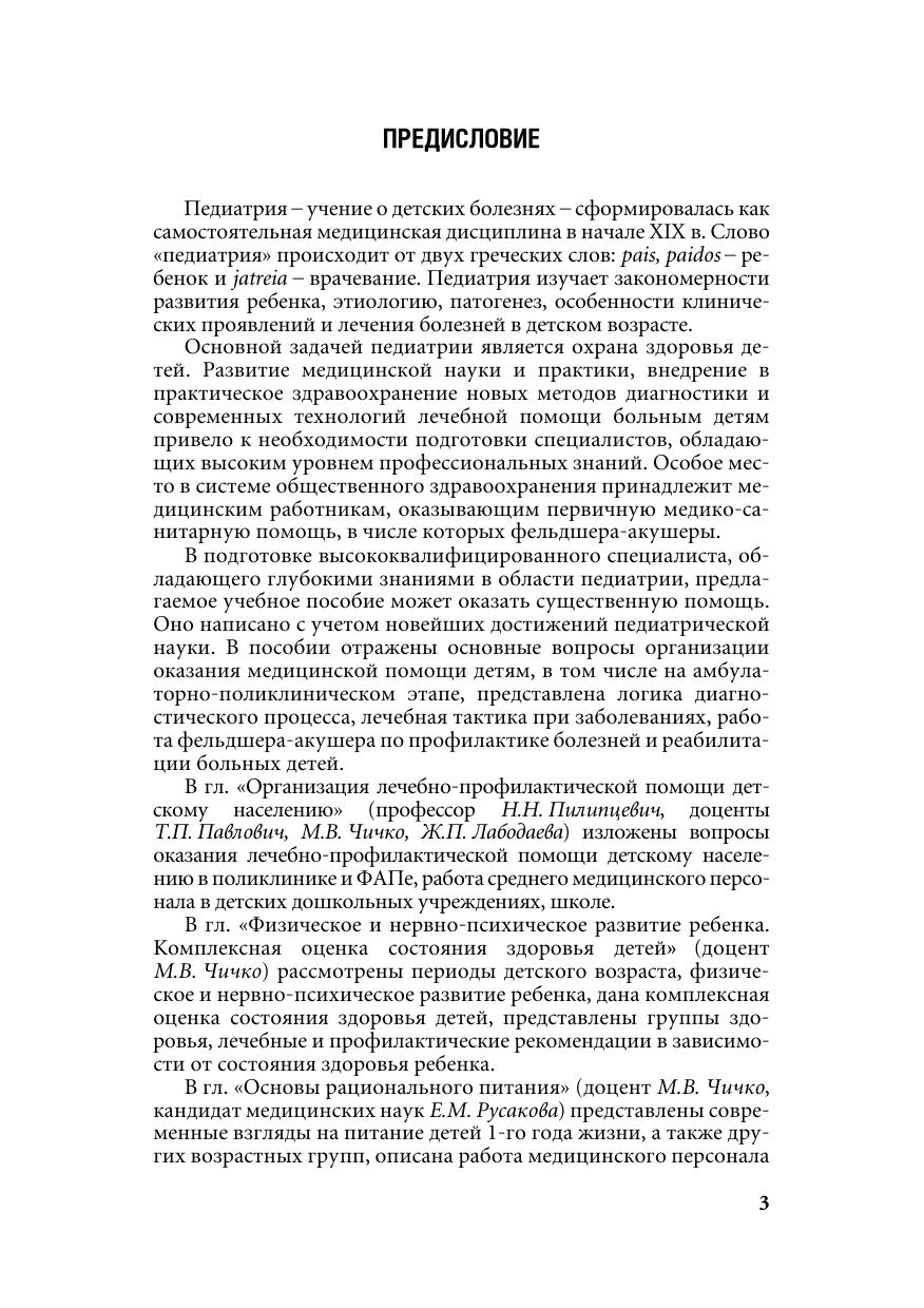Изложены материалы по организации медицинской помощи детям. Освещены вопросы, связанные с физическим, психическим и половым развитием ребенка. Приведены критерии оценки состояния здоровья детей, анатомо-физиологические особенности детского организма, современные представления о вскармливании детей раннего возраста, данные о наиболее часто встречающихся заболеваниях органов и систем детского организма, начиная с периода новорожденности, медицинская помощь при неотложных состояниях. Представлена иммунопрофилактика детей, тактика фельдшера при развитии поствакцинальных осложнений. Для учащихся специальности "Лечебное дело" учреждений, обеспечивающих получение среднего специального образования, преподавателей.