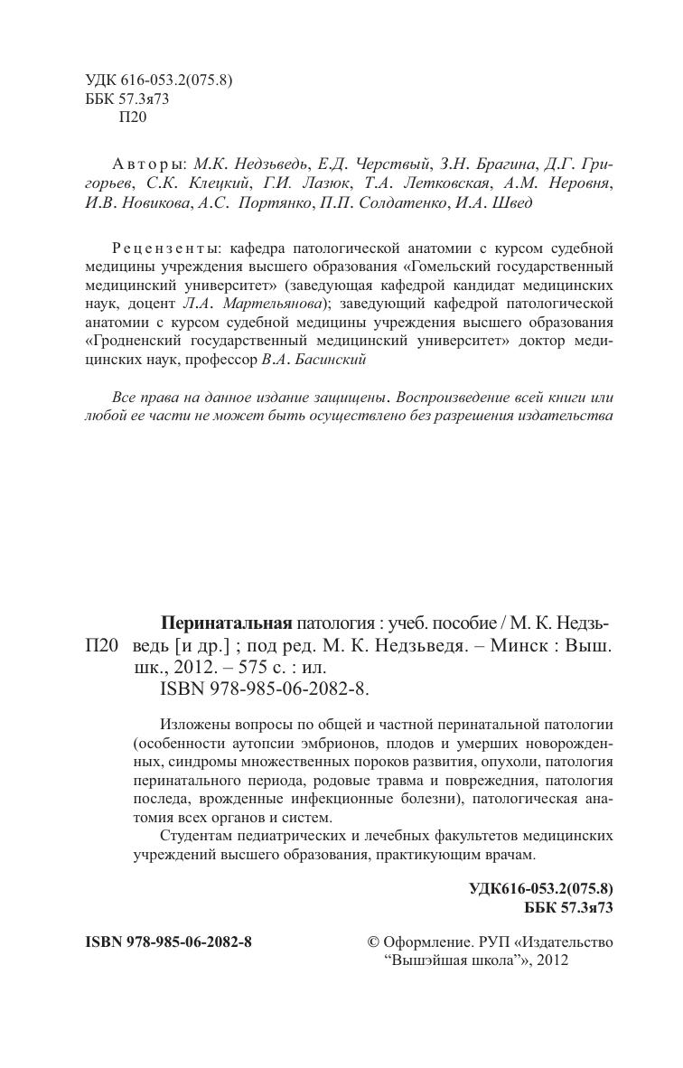 Изложены вопросы по общей и частной перинатальной патологии (особенности аутопсии эмбрионов, плодов и умерших новорожденных, синдромы множественных пороков развития, опухоли, патология перинатального периода, родовые травмы и повреждения, патология последа, врожденные инфекционные болезни), патологическая анатомия всех органов и систем. Для студентов педиатрических и лечебных факультетов медицинских учреждений высшего образования, практикующих врачей.
