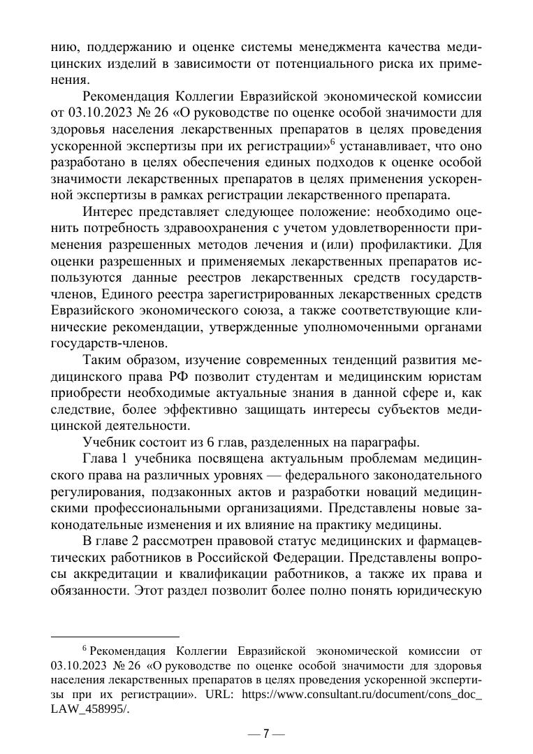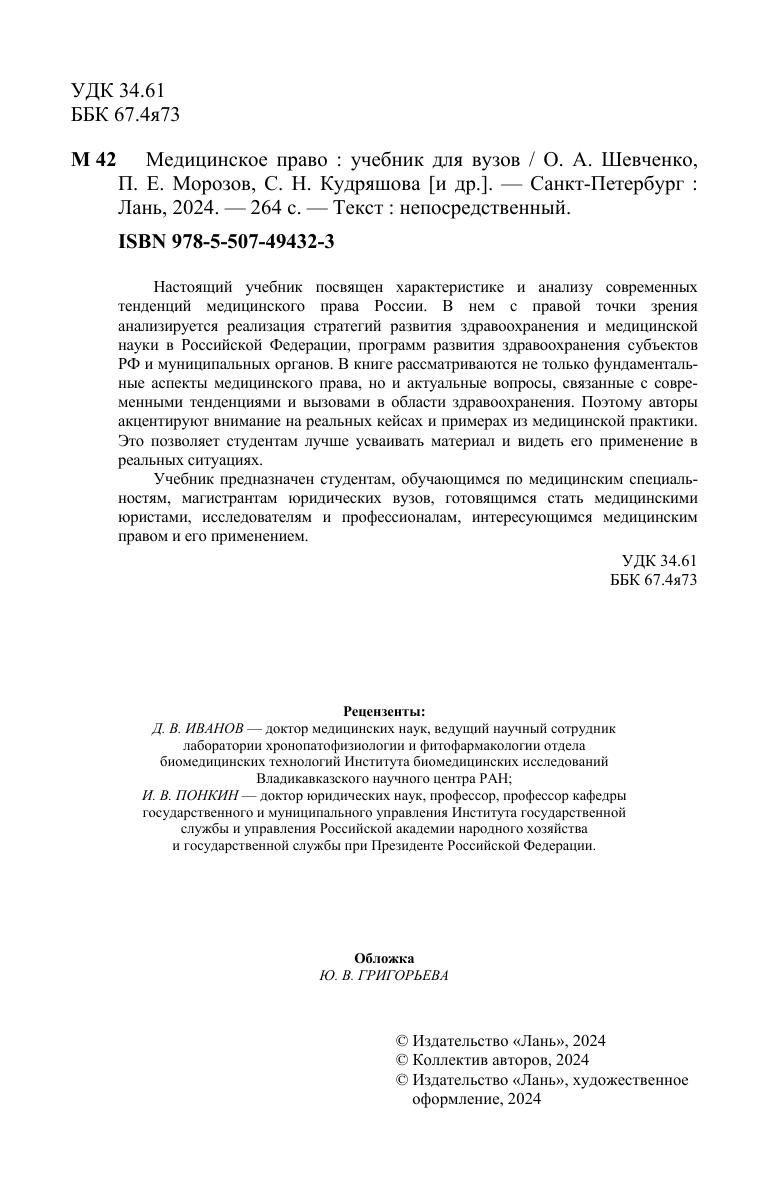 Настоящий учебник посвящен характеристике и анализу современных тенденций медицинского права России. В нем с правой точки зрения анализируется реализация стратегий развития здравоохранения и медицинской науки в Российской Федерации, программ развития здравоохранения субъектов РФ и муниципальных органов. В книге рассматриваются не только фундаментальные аспекты медицинского права, но и актуальные вопросы, связанные с современными тенденциями и вызовами в области здравоохранения. Поэтому авторы акцентируют внимание на реальных кейсах и примерах из медицинской практики. Это позволяет студентам лучше усваивать материал и видеть его применение в реальных ситуациях. Учебник предназначен студентам, обучающимся по медицинским специальностям, магистрантам юридических вузов, готовящимся стать медицинскими юристами, исследователям и профессионалам, интересующимся медицинским правом и его применением.