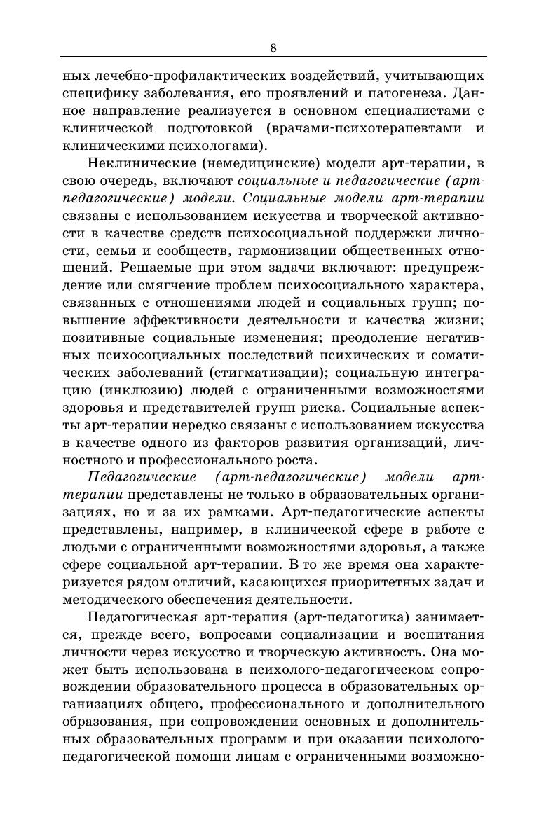 Настоящее издание посвящено арт-терапии как одному из видов психологической помощи, основанному на изобразительной деятельности. Представлены основы ее теории и методологии, инструменты практической работы в медицине и социальной сфере, планирование и проведение программ арт-терапии, подходы к оценке ее эффектов. В книге представлена целостная картина развития арт-терапии и ее современного состояния, включены многочисленные практические примеры. Издание позволяет овладеть данной предметной областью, начиная с азов и заканчивая вопросами позиционирования арт-терапии в системе научного знания, ее использования в разных областях практического применения. Издание отражает специфику отечественной арт-терапии, особенности ее развития в постсоветский период. Показаны сильные стороны и преимущества отечественной арт-терапии, целостная и всесторонне обоснованная концепция арт-терапевтического воздействия согласно модели Системной арт-терапии.
