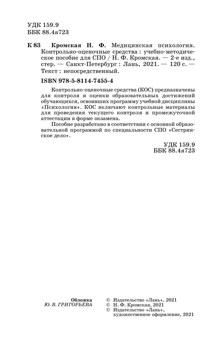 Контрольно-оценочные средства (КОС) предназначены для контроля и оценки образовательных достижений обучающихся, освоивших программу учебной дисциплины «Психология». КОС включают контрольные материалы для проведения текущего контроля и промежуточной аттестации в форме экзамена. Пособие разработано в соответствии с основной образовательной программой по специальности СПО «Сестринское дело».
