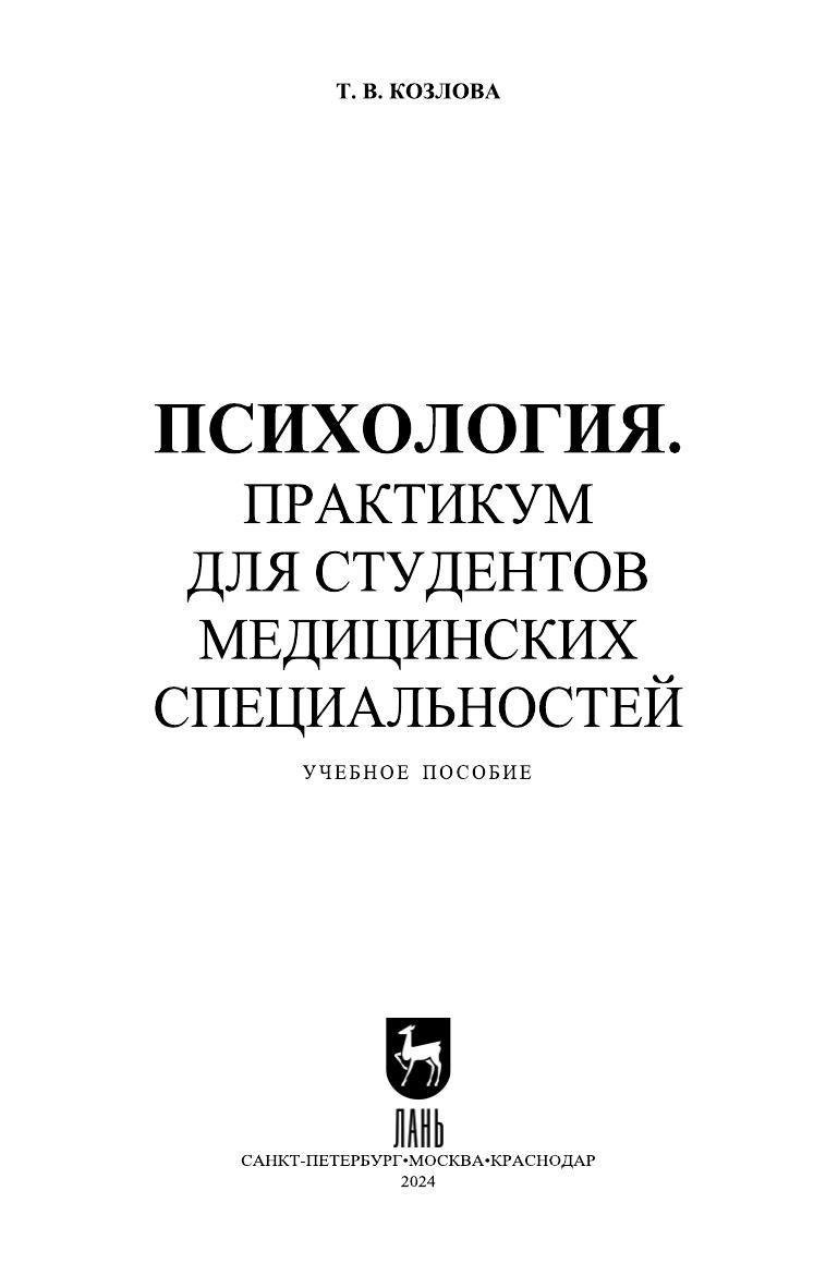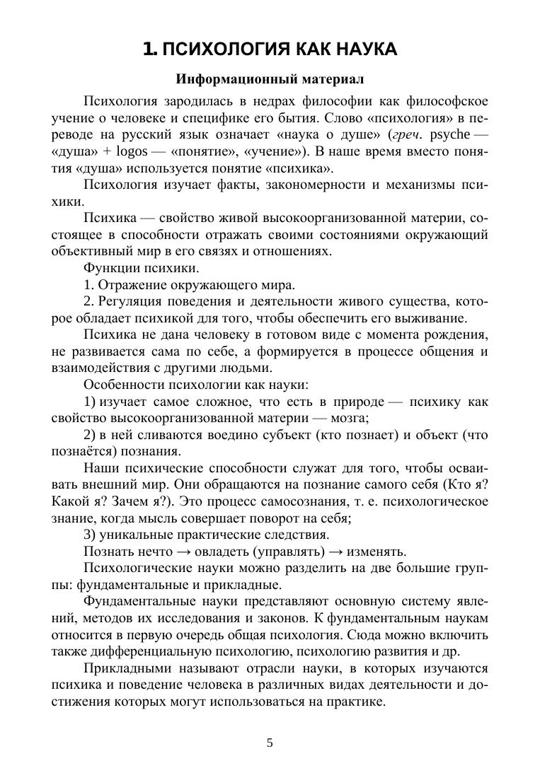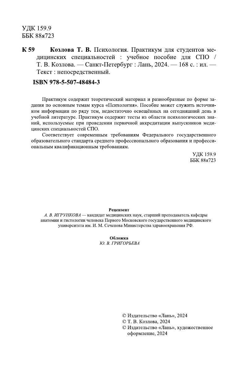 Практикум содержит теоретический материал и разнообразные по форме за-дания по основным темам курса «Психология». Пособие может служить источни-ком информации по ряду тем, недостаточно освещённых на сегодняшний день в учебной литературе. Практикум содержит тесты из области психологических зна-ний, используемые при проведении первичной аккредитации выпускников меди-цинских специальностей СПО. Соответствует современным требованиям Федерального государственного образовательного стандарта среднего профессионального образования и профес-сиональным квалификационным требованиям.