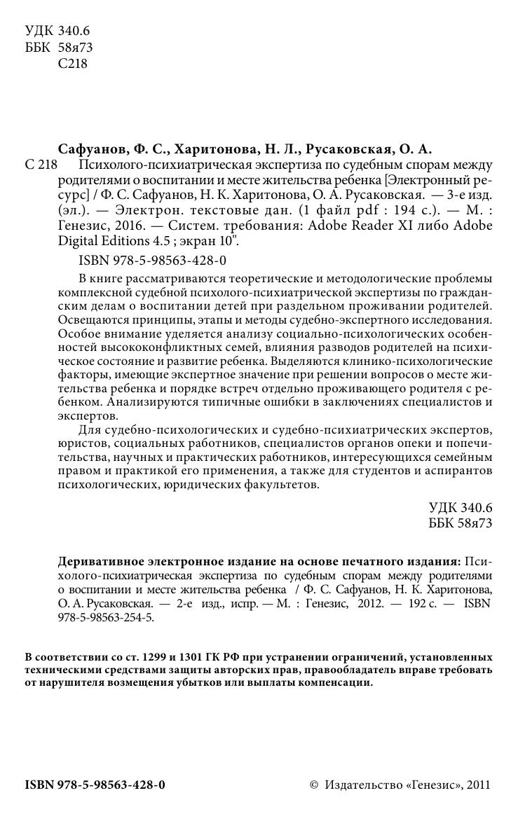 Для судебно-психологических и судебно-психиатрических экспертов, юристов, социальных работников, специалистов органов опеки и попечительства, научных и практических работников, интересующихся семейным правом и практикой его применения, а также для студентов и аспирантов психологических, юридических факультетов.