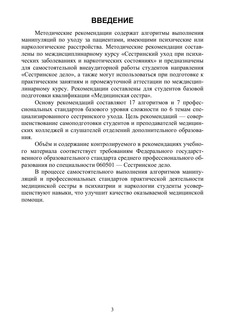 Методические рекомендации содержат алгоритмы выполнения манипуляций по уходу за пациентами, имеющими психические или наркологические расстройства. Рекомендации составлены в соответствии с требованиями Государственного образовательного стандарта по специальности «Сестринское дело».