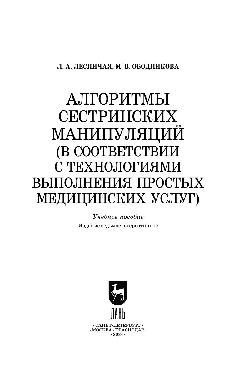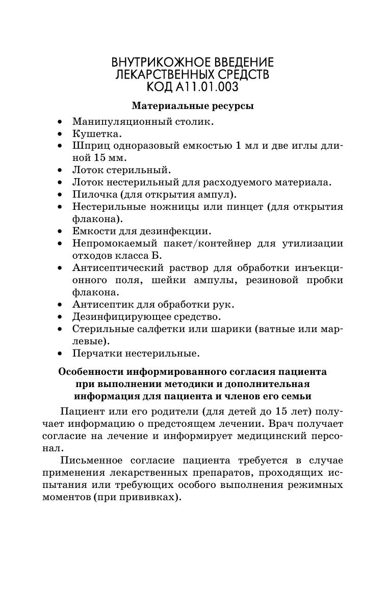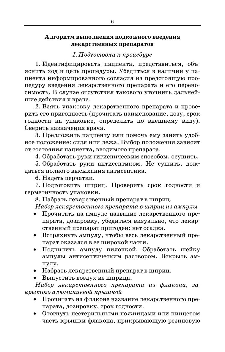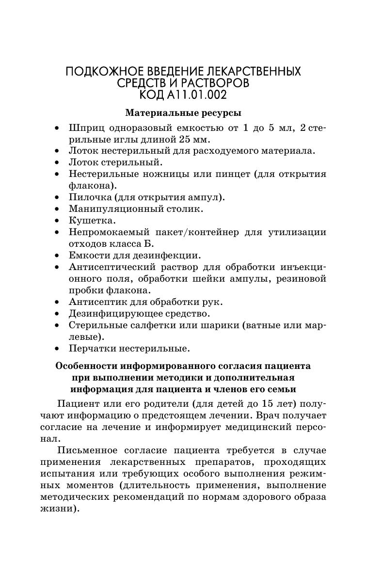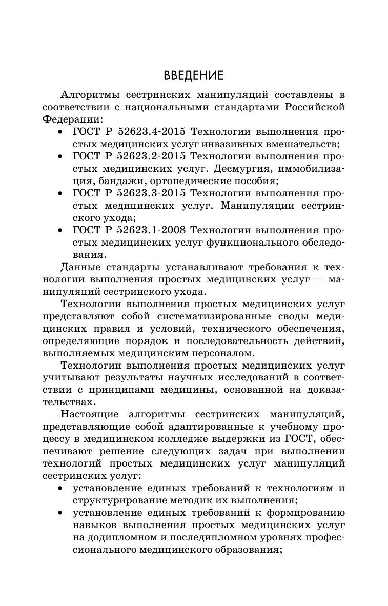 Грамотное освоение сестринских манипуляций при изучении медицинских специальностей является важным этапом в подготовке будущего специалиста. Актуальным является установление единых требований к формированию навыков выполнения простых медицинских услуг при получении специальности. Определение единых требований к технологиям и структурирование методик их выполнения лежит в основе оценки качества выполнения простой медицинской услуги. Учебное пособие предназначено для отработки навыков выполнения стандартизированных сестринских манипуляций. Настоящие алгоритмы сестринских манипуляций представляют собой адаптированные к учебному процессу в медицинском колледже выдержки из национальных стандартов Российской Федерации. Соответствует современным требованиям Федерального государственного образовательного стандарта среднего профессионального образования и профессиональным квалификационным требованиям. Рекомендуется преподавателям и студентам медицинских специальностей, слушателям отделений повышения квалификации, практикующим специалистам.