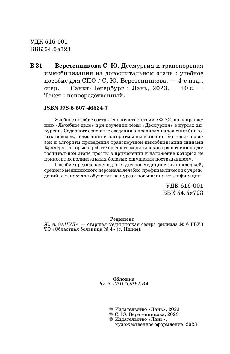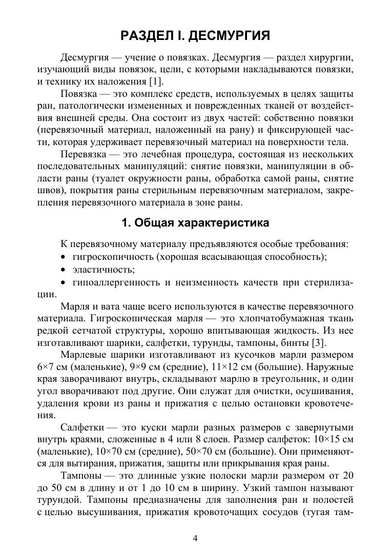 Учебное пособие составлено в соответствии с ФГОС по направлению «Лечебное дело» при изучении темы «Десмургия» в курсах хирургии. Содержит основные сведения о правилах наложения бинтовых повязок, показания и алгоритмы выполнения бинтовых повязок и алгоритм проведения транспортной иммобилизации шинами Крамера, которые в работе среднего медицинского работника на догоспитальном этапе просты в применении и наложение которых не приносит дополнительных болевых ощущений пострадавшему. Пособие предназначено для студентов медицинских колледжей, среднего медицинского персонала лечебно-профилактических учреждений, а также для обучения на курсах повышения квалификации.